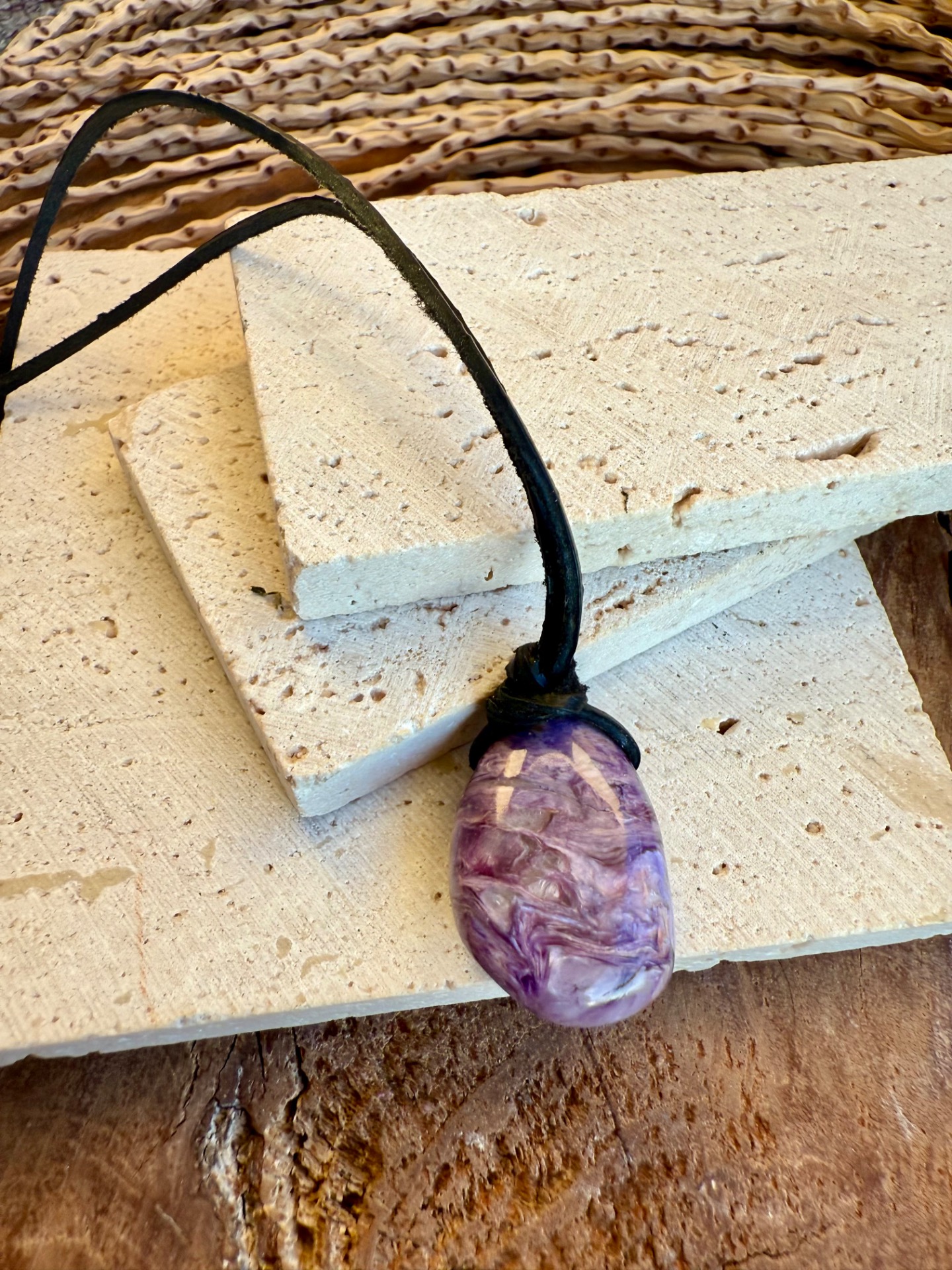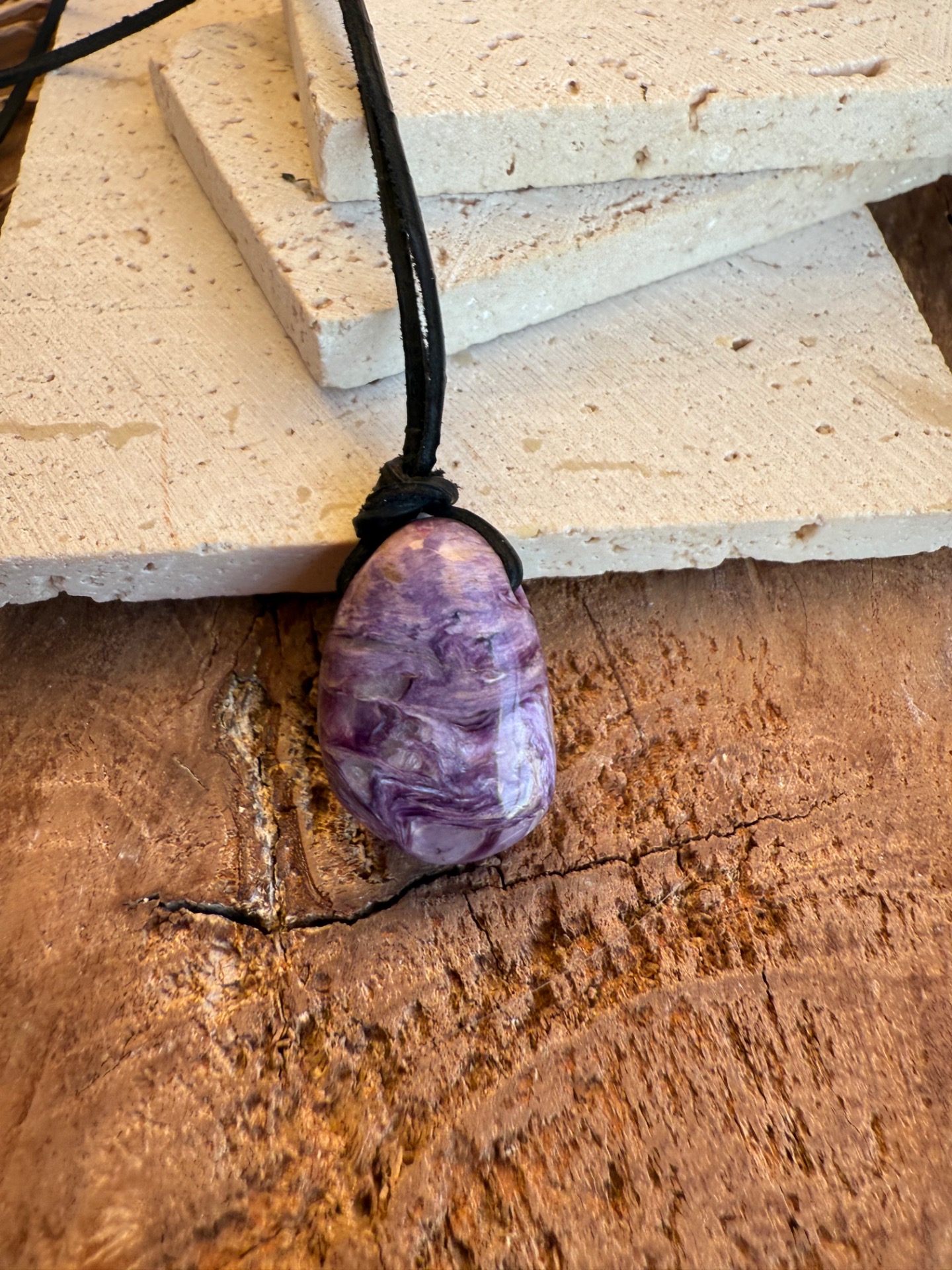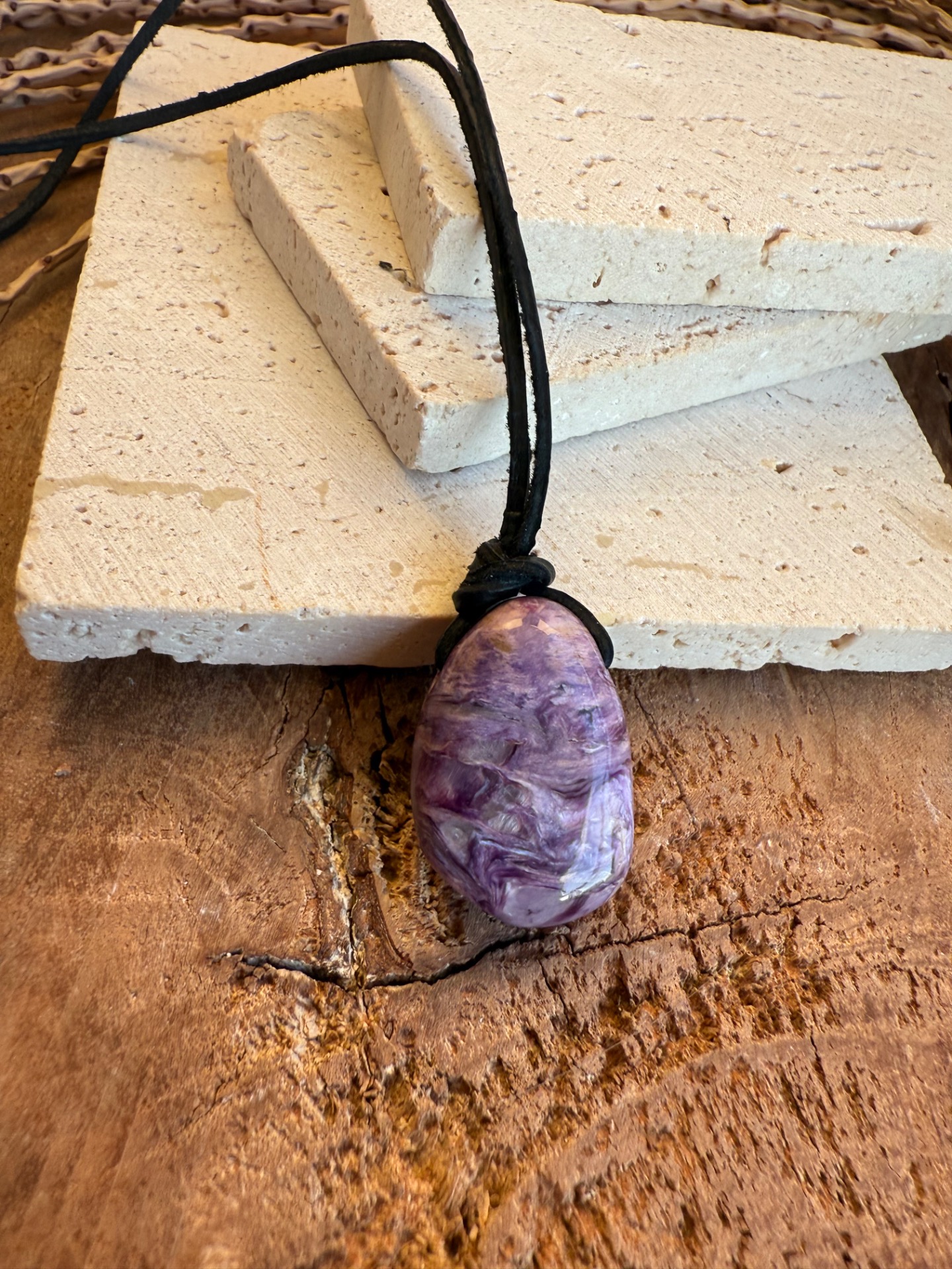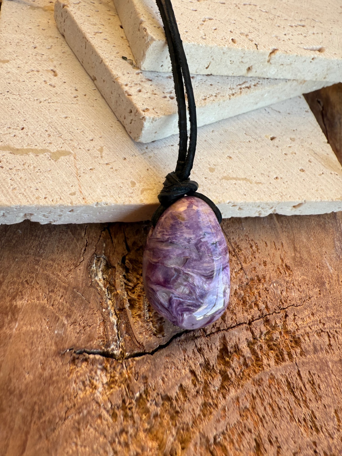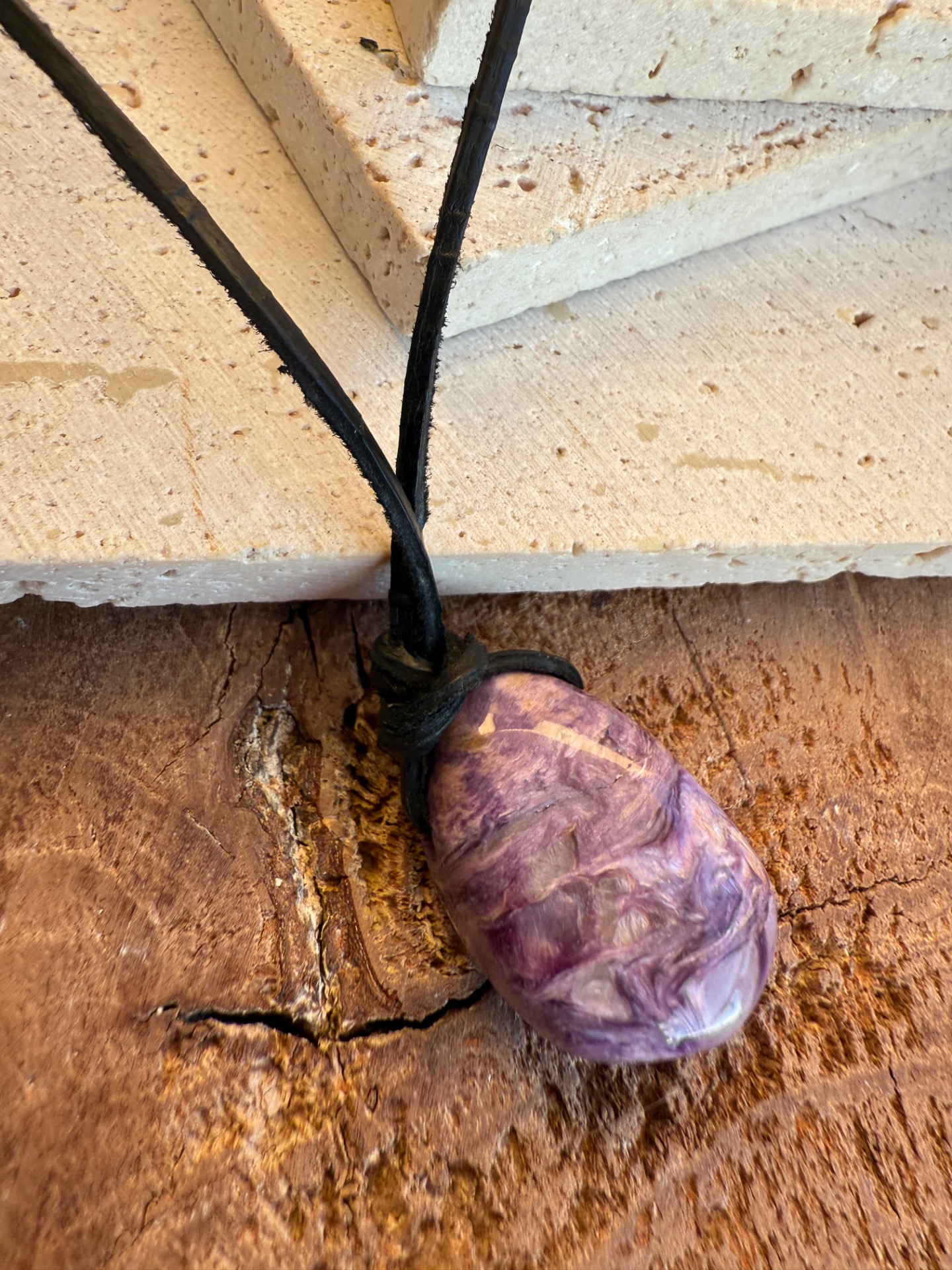 Prívesok vŕtaný z minerálu čaroit na kožennej šnúrke