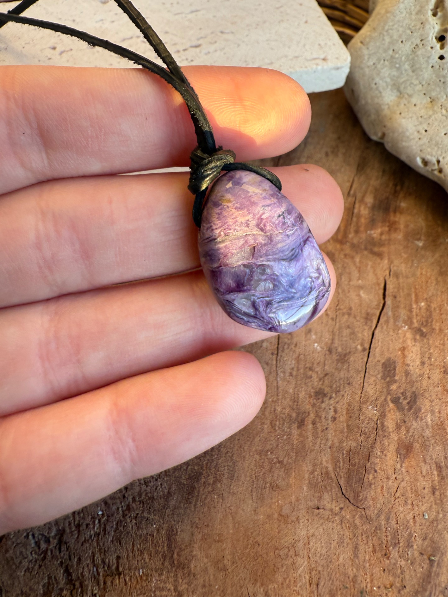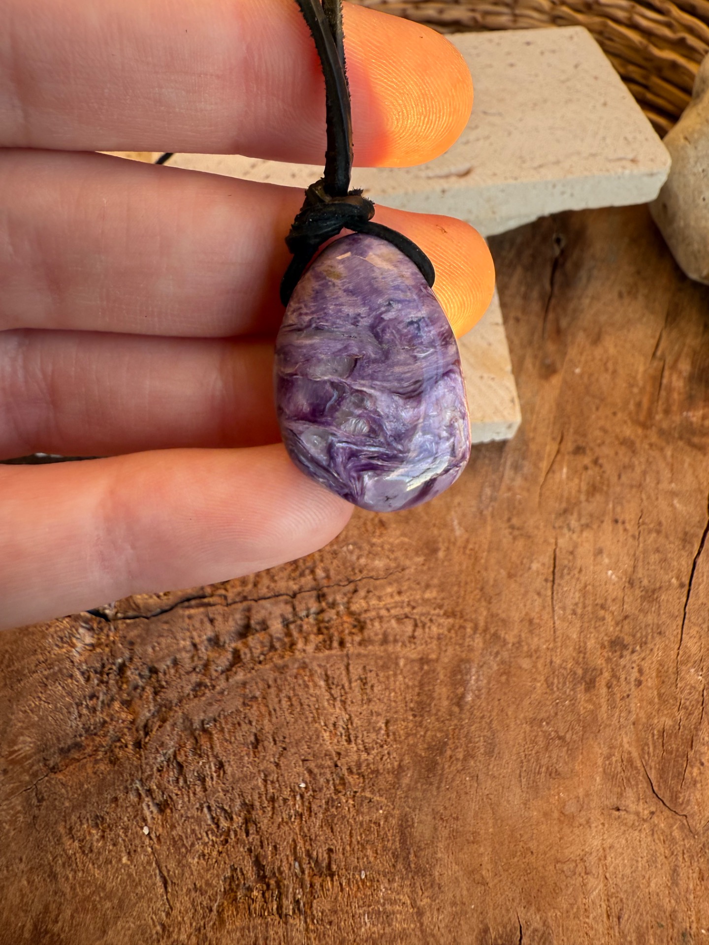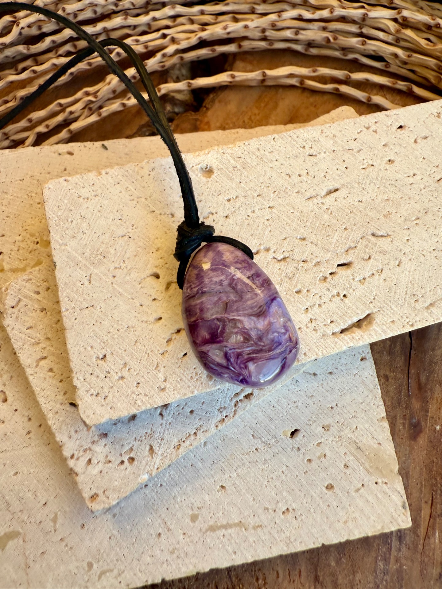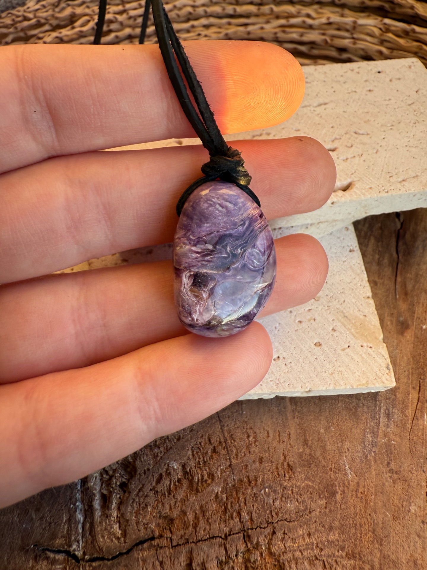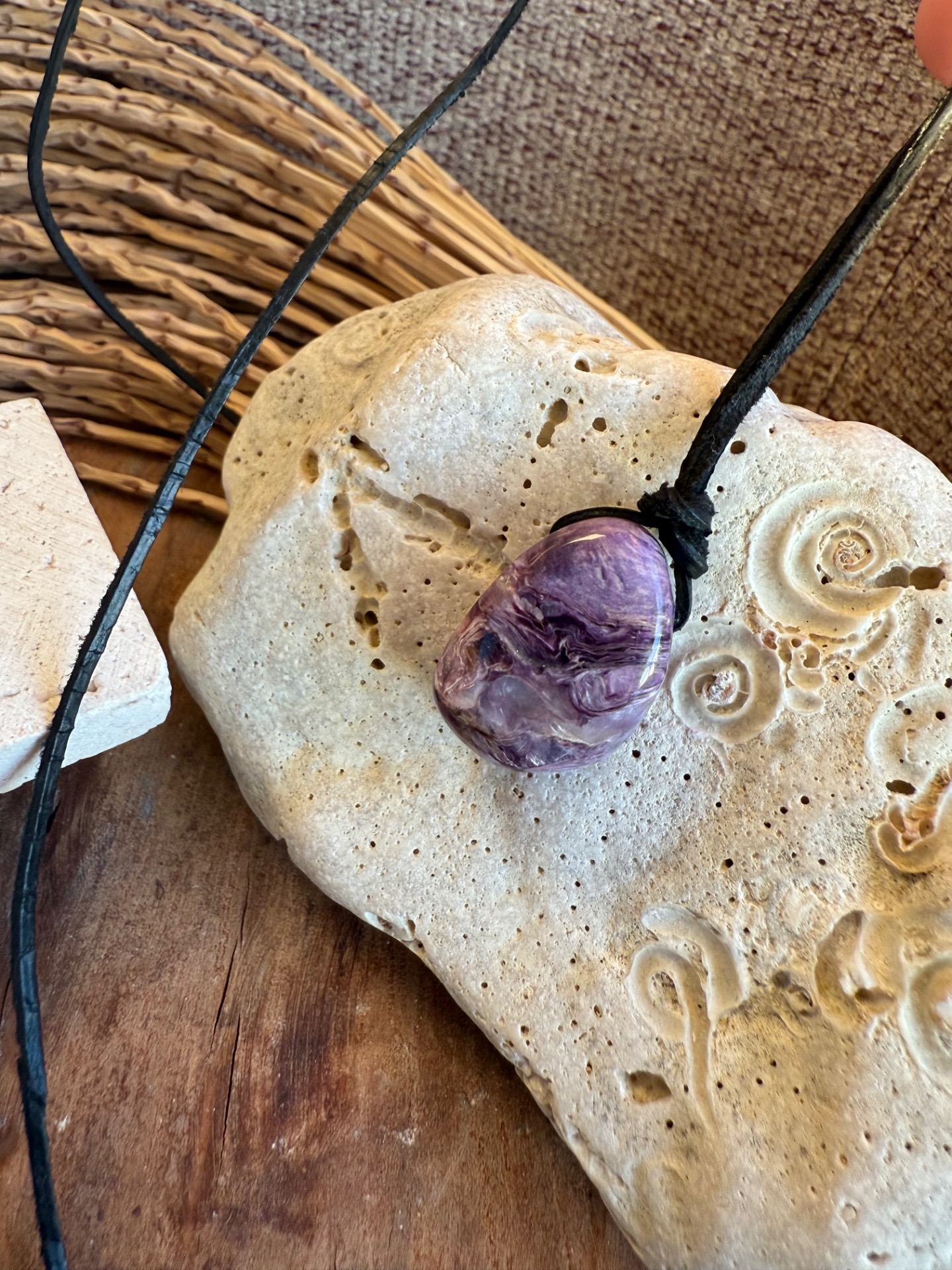 Prívesok vŕtaný z minerálu čaroit na kožennej šnúrke