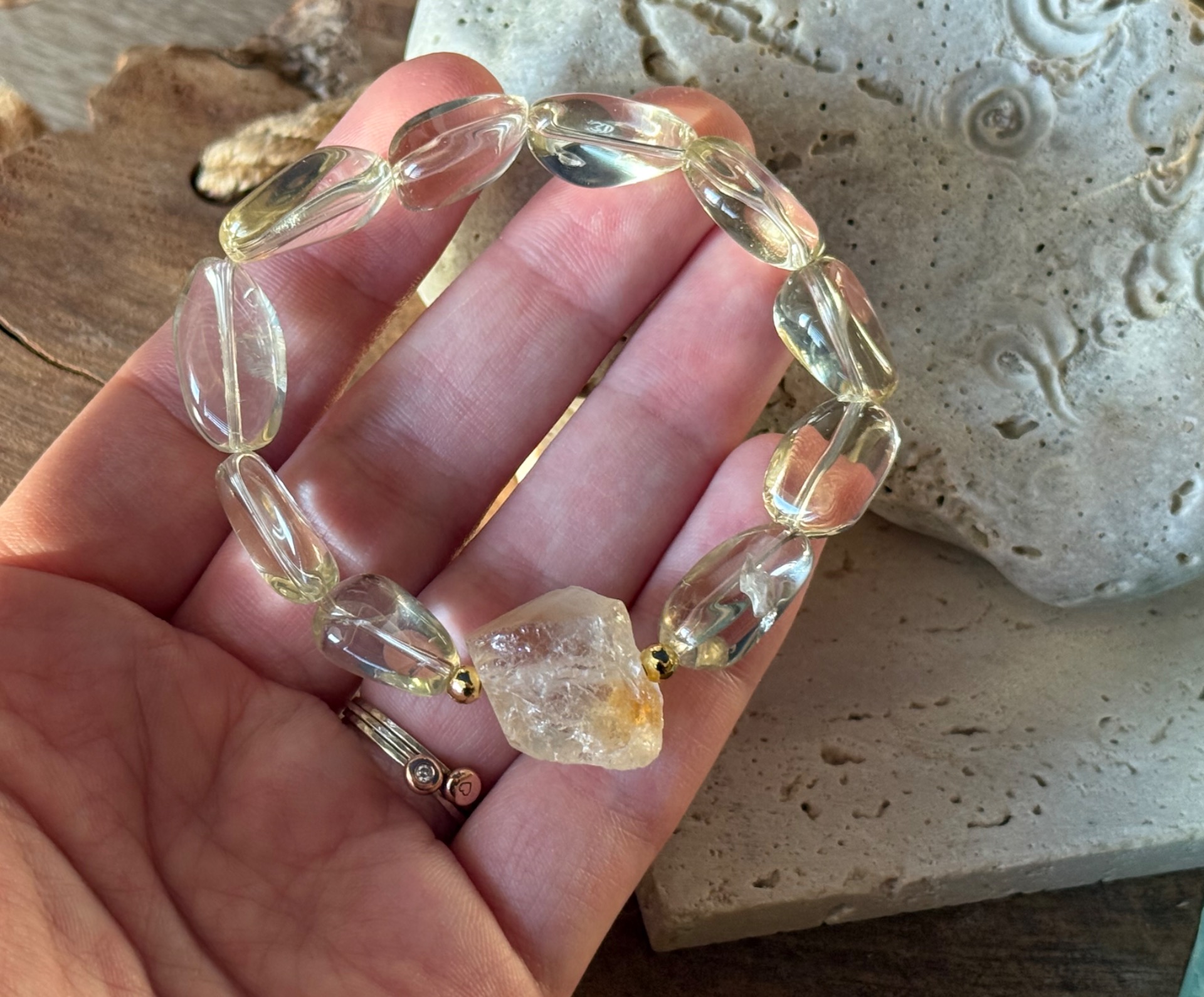 Light citrín v lesklom prevedení prináša jemnú energiu radosti, optimismu a otvorenosti prijímaniu nových príležitostí. Surový citrín v strede náramku zosilňuje energiu hojnosti, životnú silu a podporuje manifestáciu cieľov.