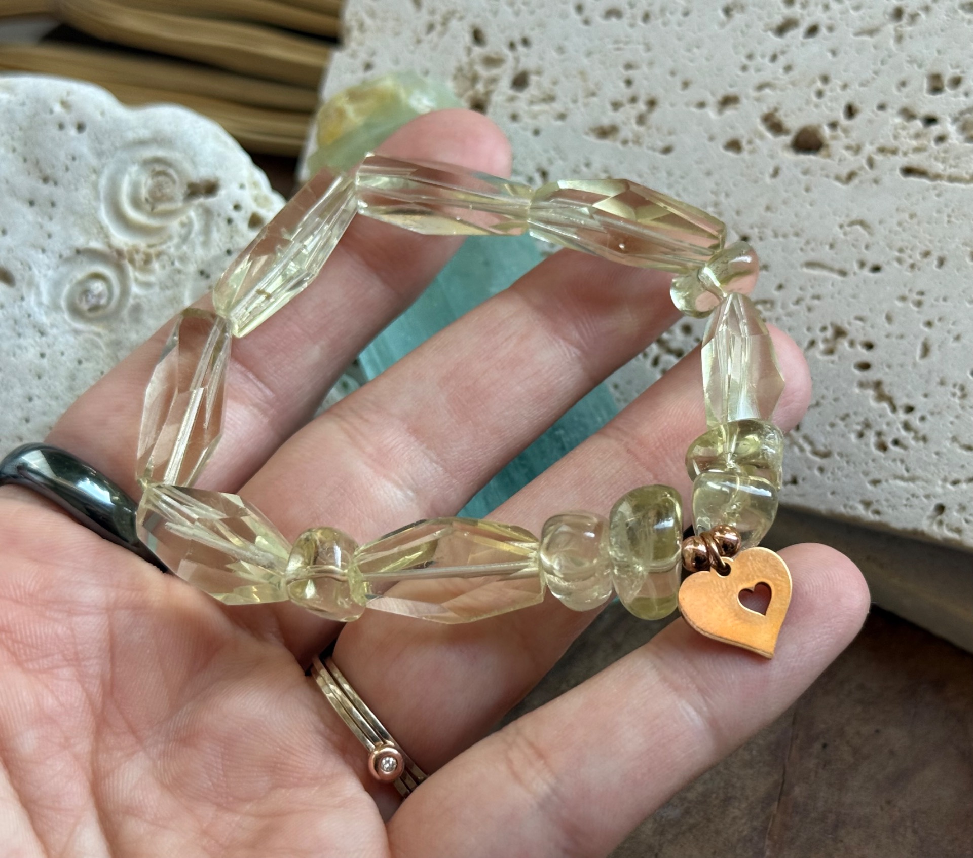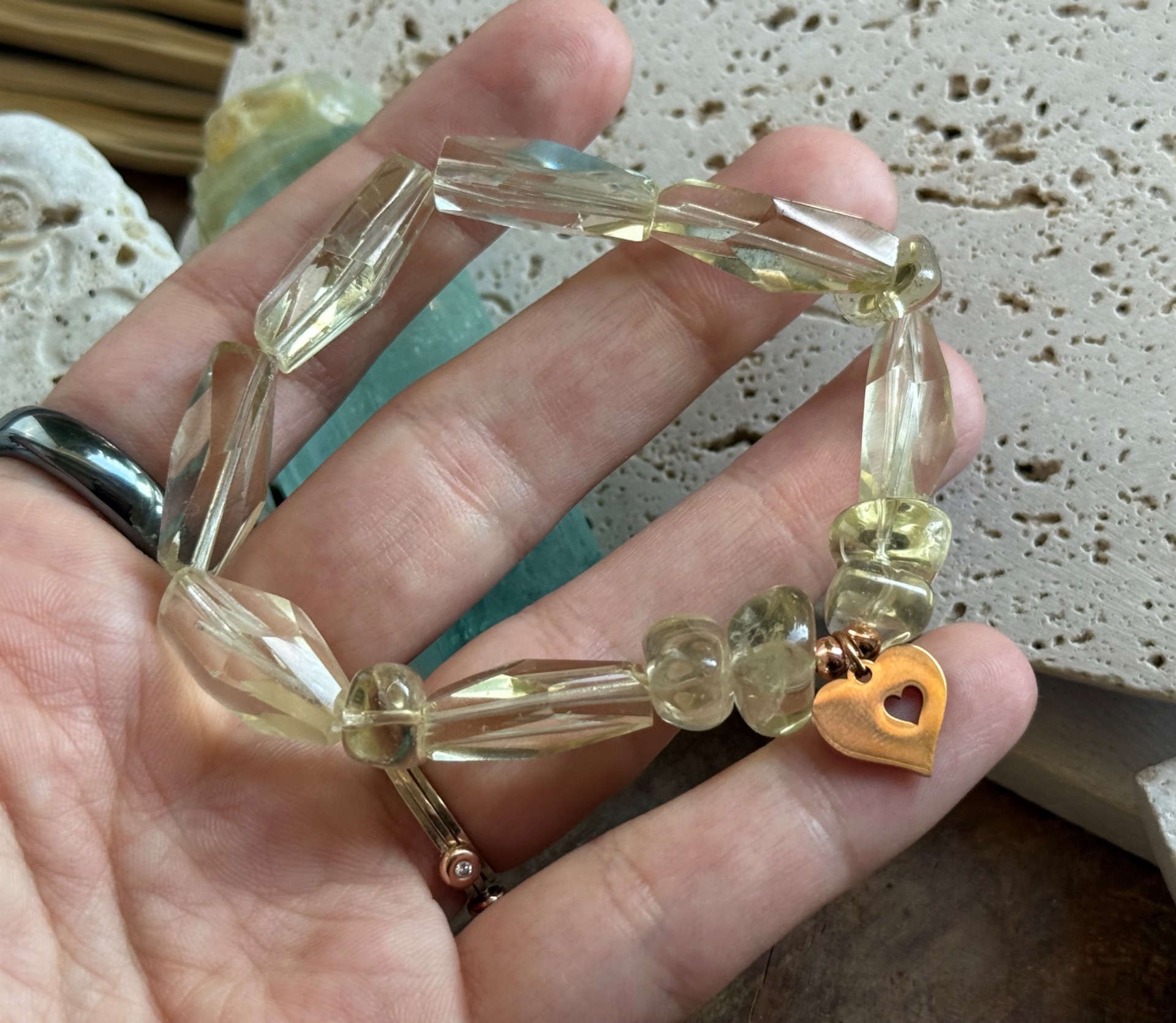 Náramok z minerálu citrín nugety 2cm brúsené , doplnený nerezovým srdiečkom gold visiacim.