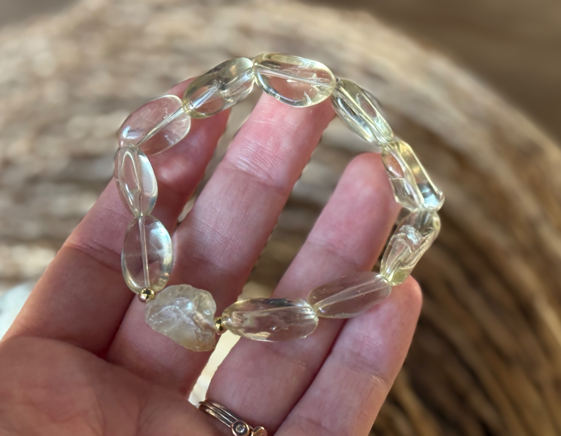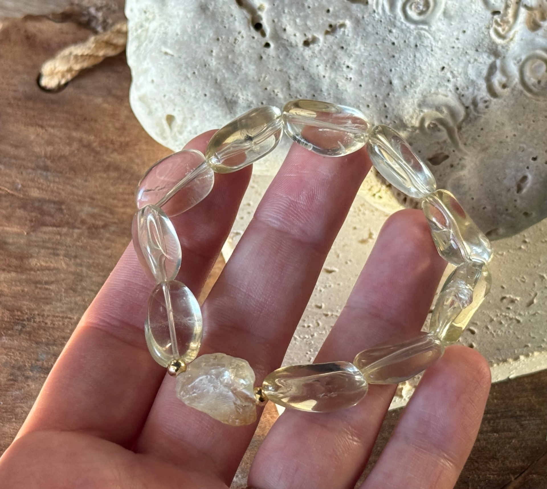 Light citrín v lesklom prevedení prináša jemnú energiu radosti, optimismu a otvorenosti prijímaniu nových príležitostí. Surový citrín v strede náramku zosilňuje energiu hojnosti, životnú silu a podporuje manifestáciu cieľov.
