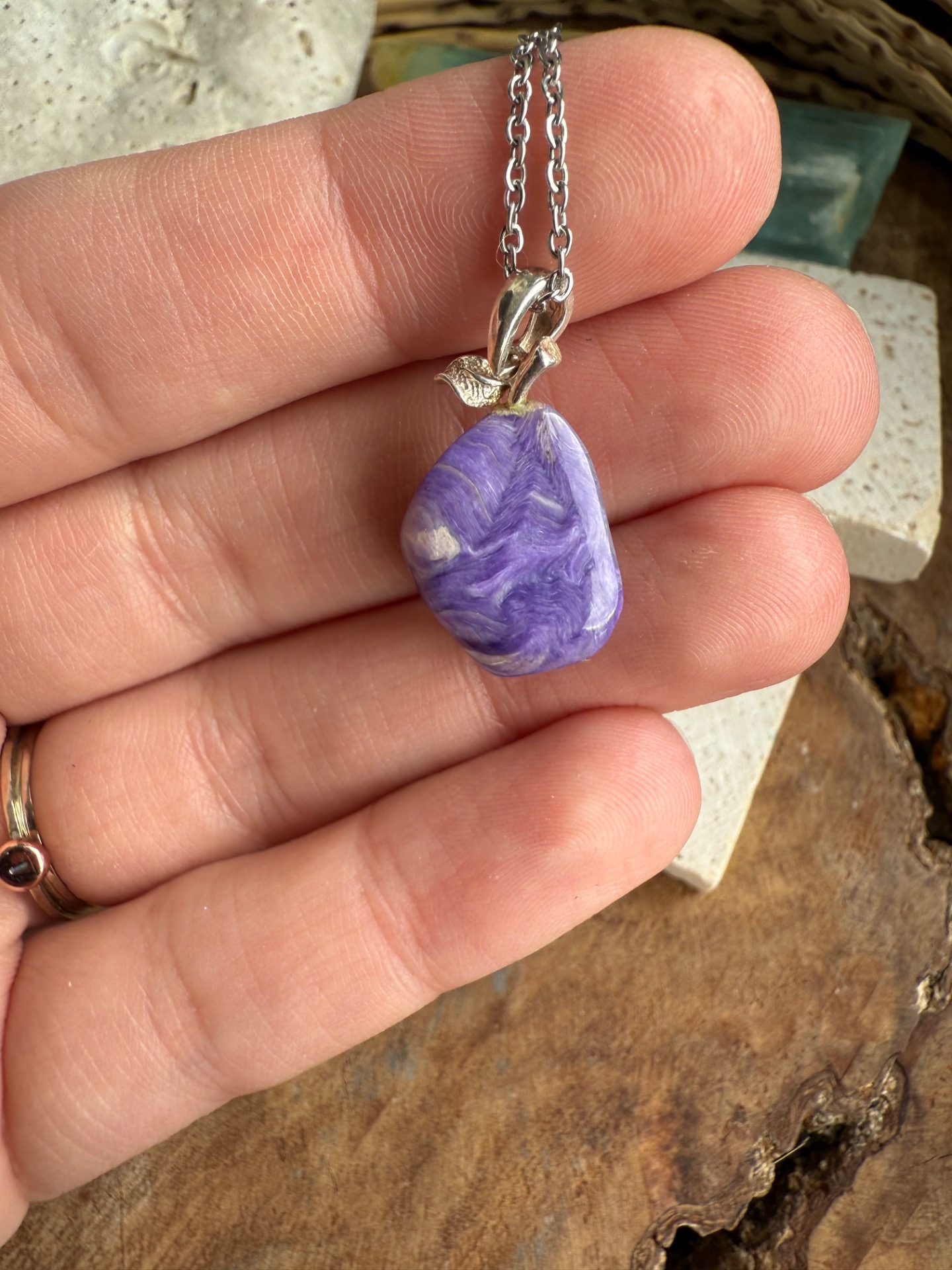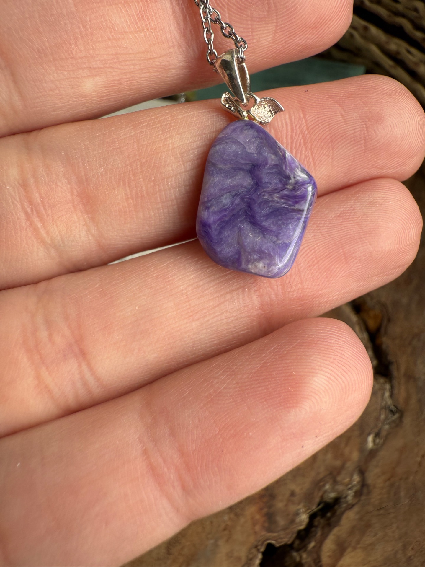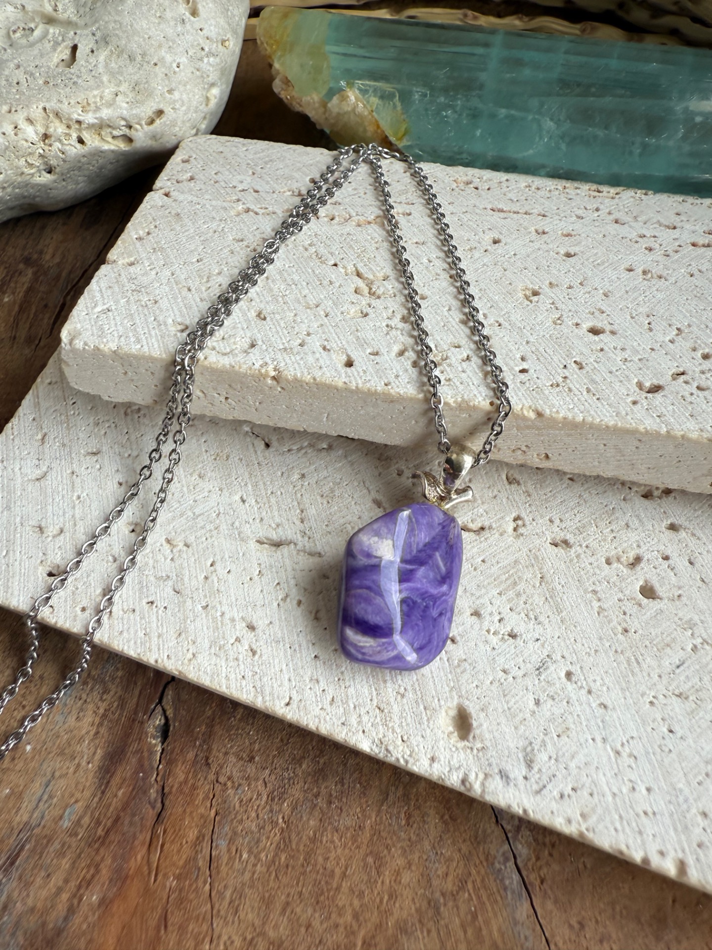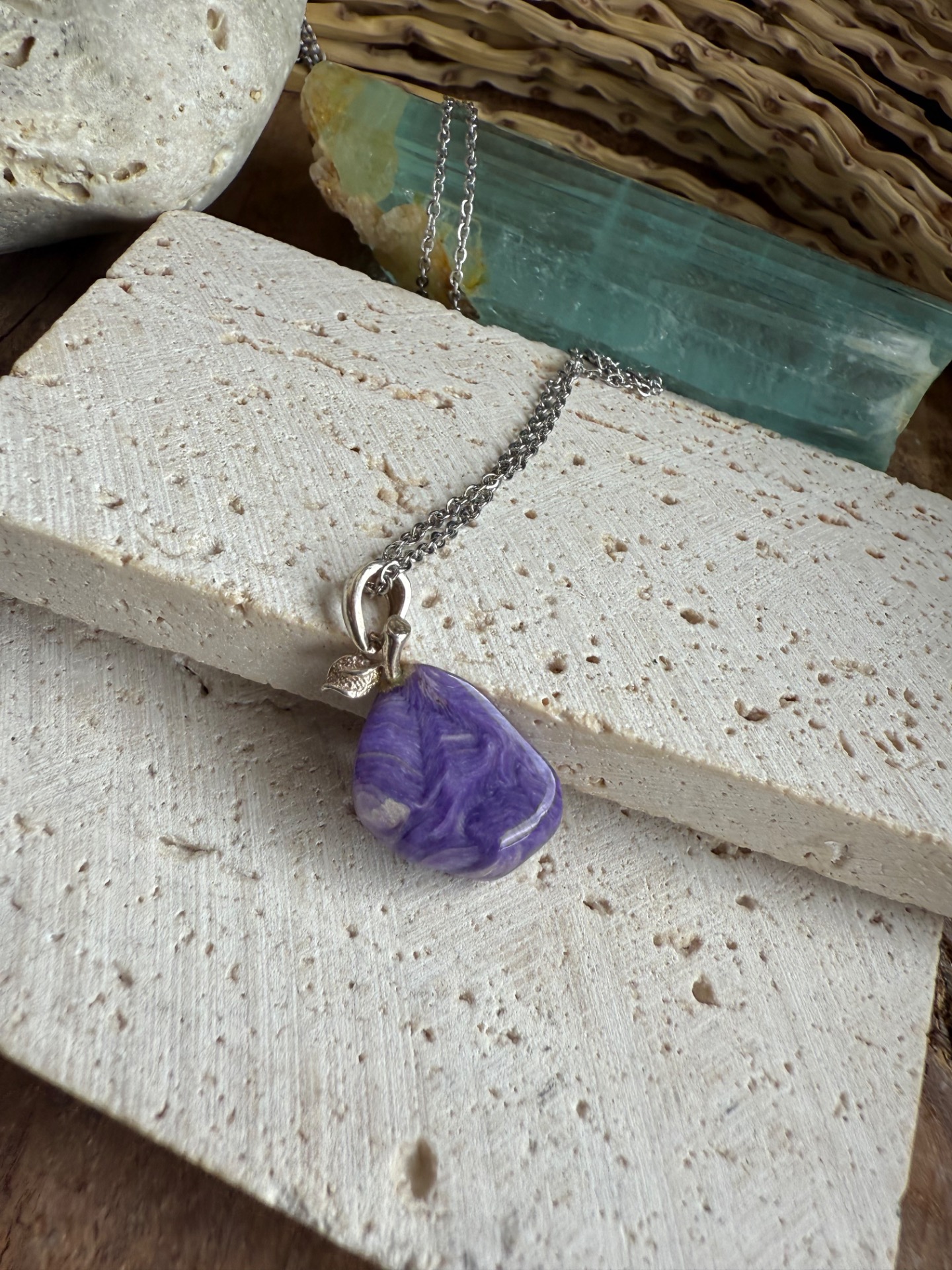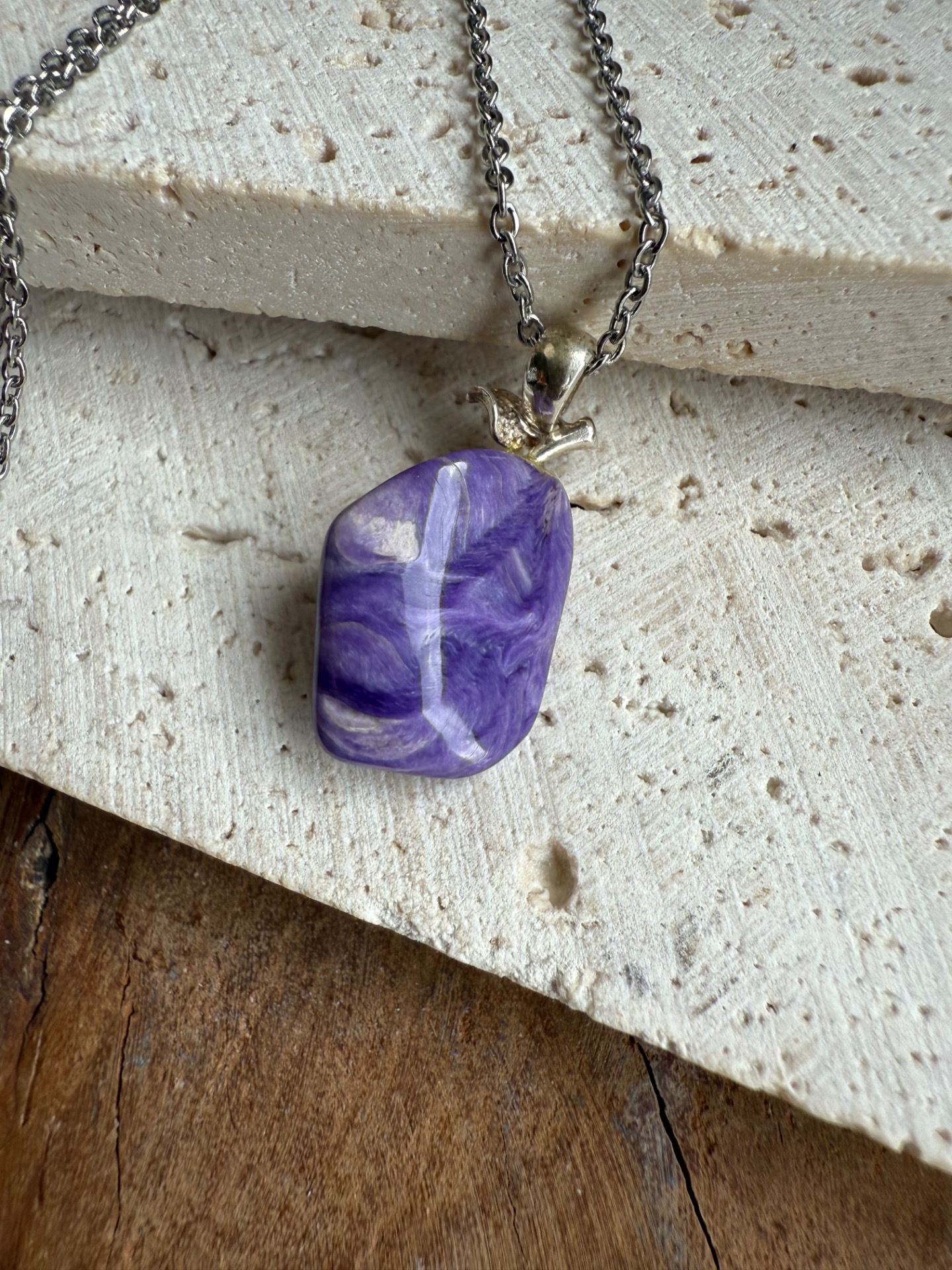 Prívesok z minerálu Čaroit – Vedma na nerezovej retiazke
