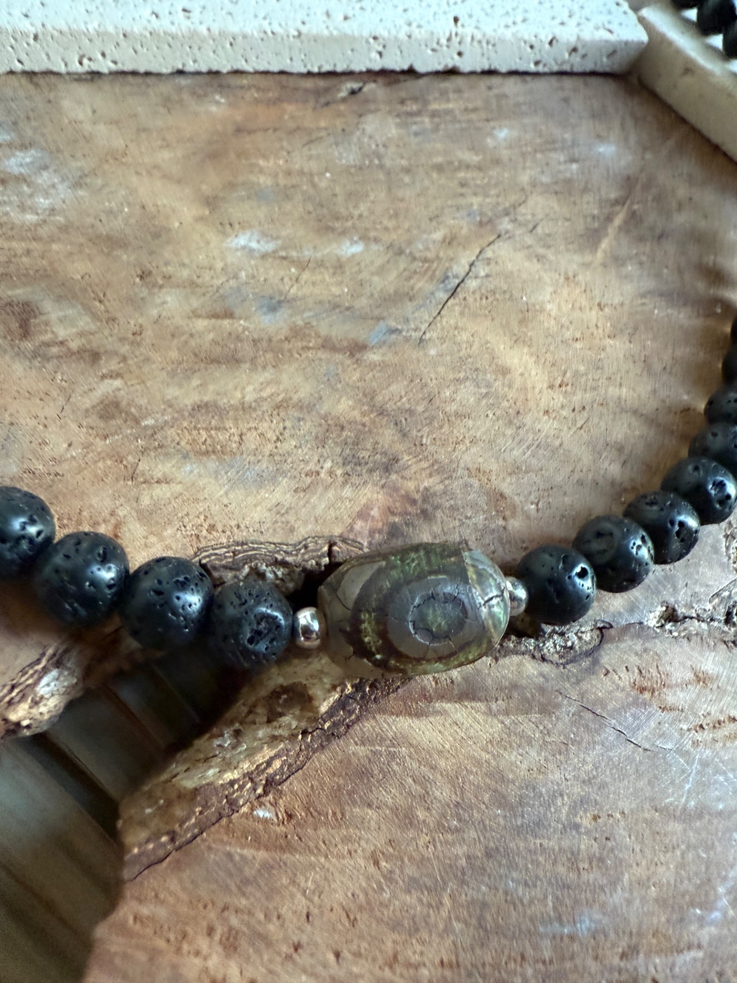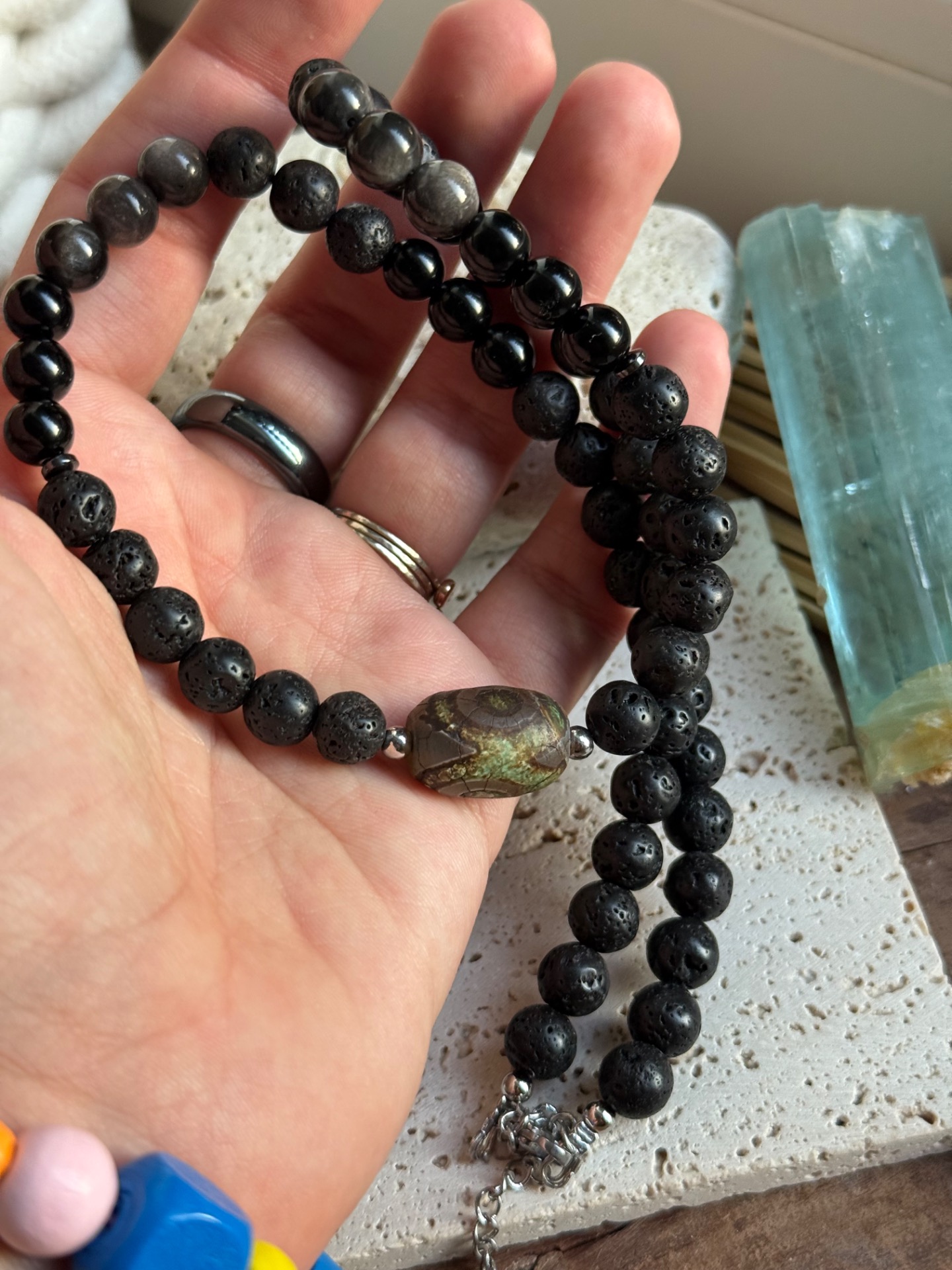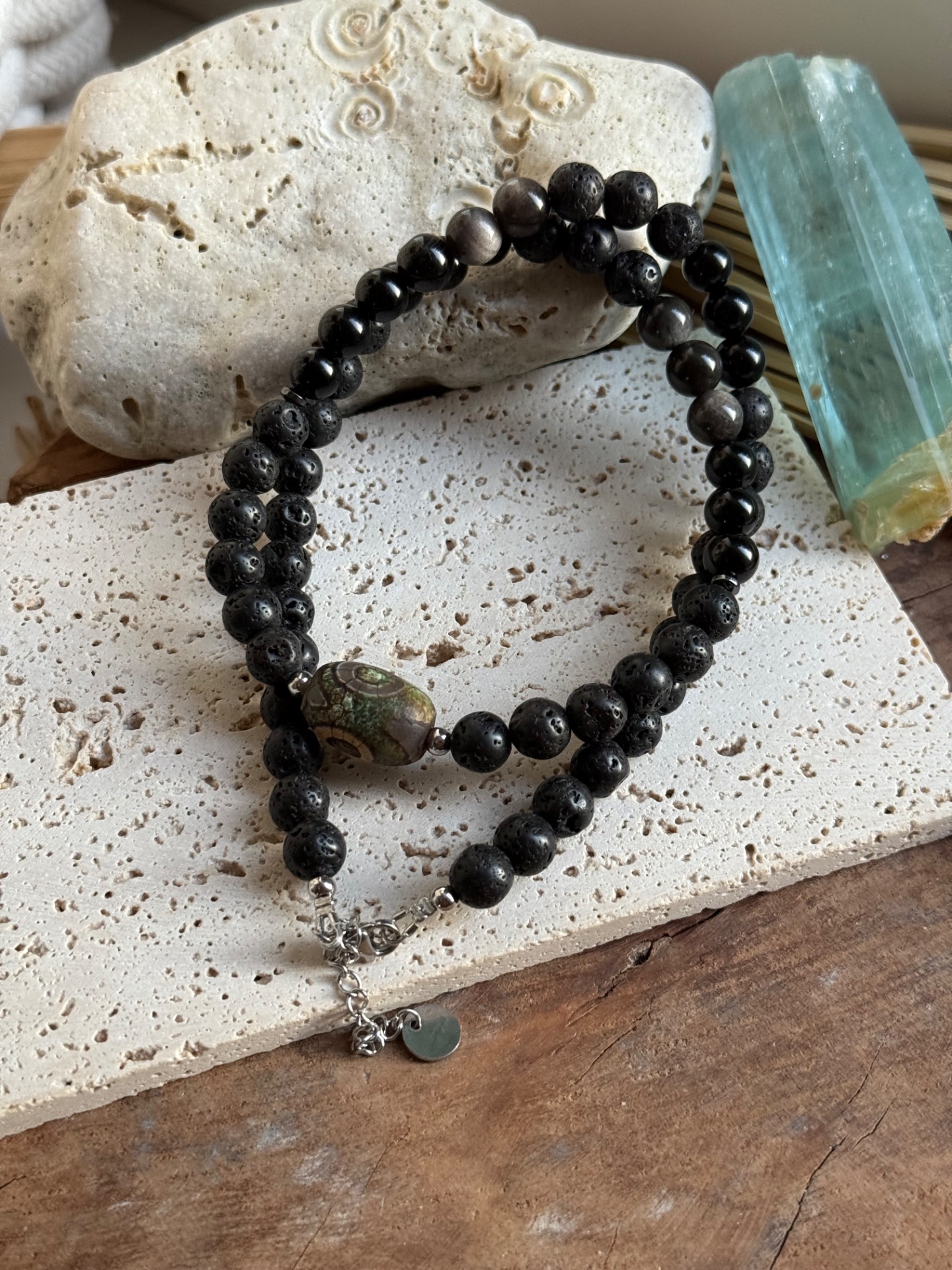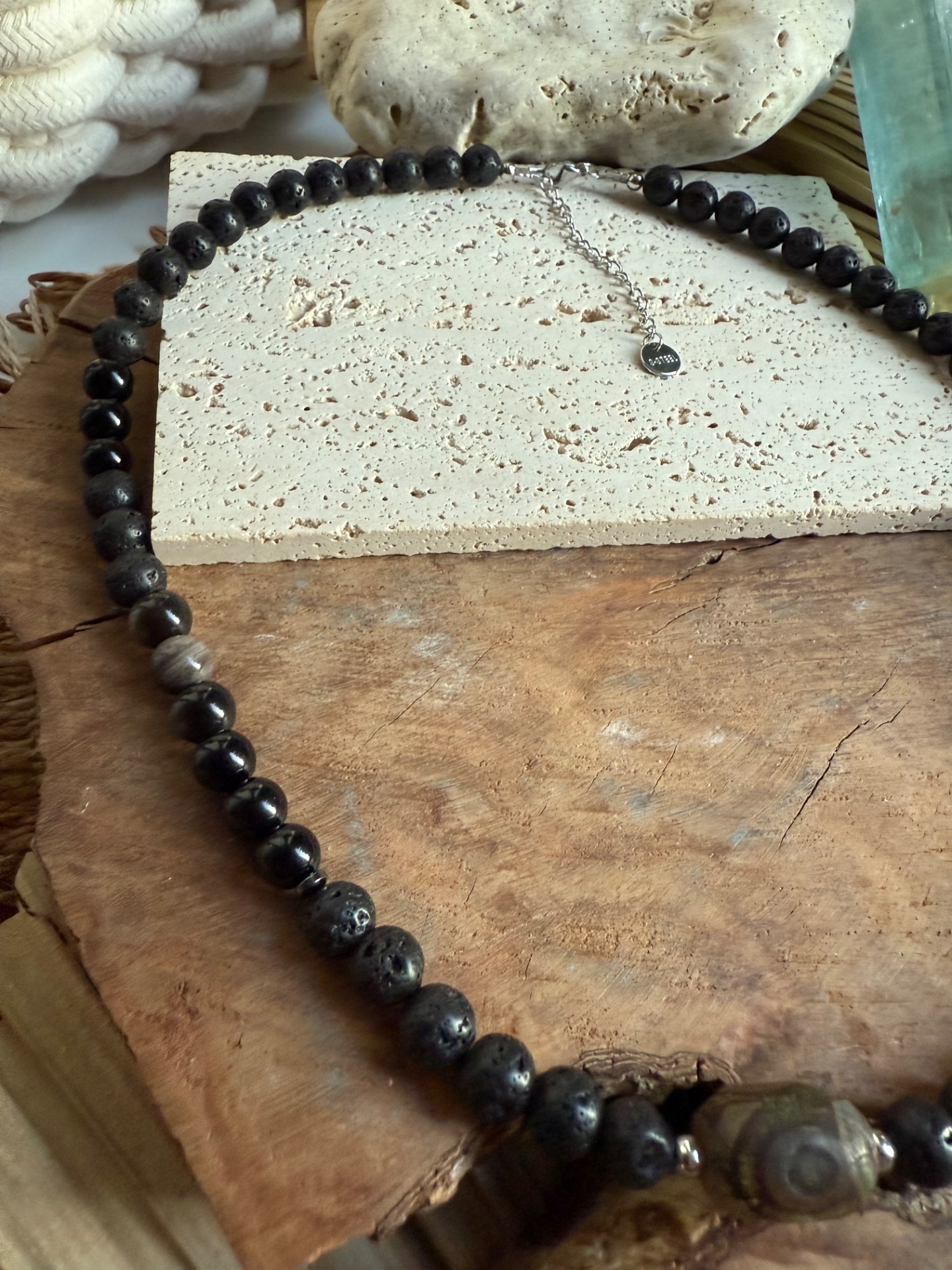 "Ochranný štít" – pánsky náhrdelník z Dzi achátu, ónyxu, obsidiánu a lávového kameňa (8 mm)