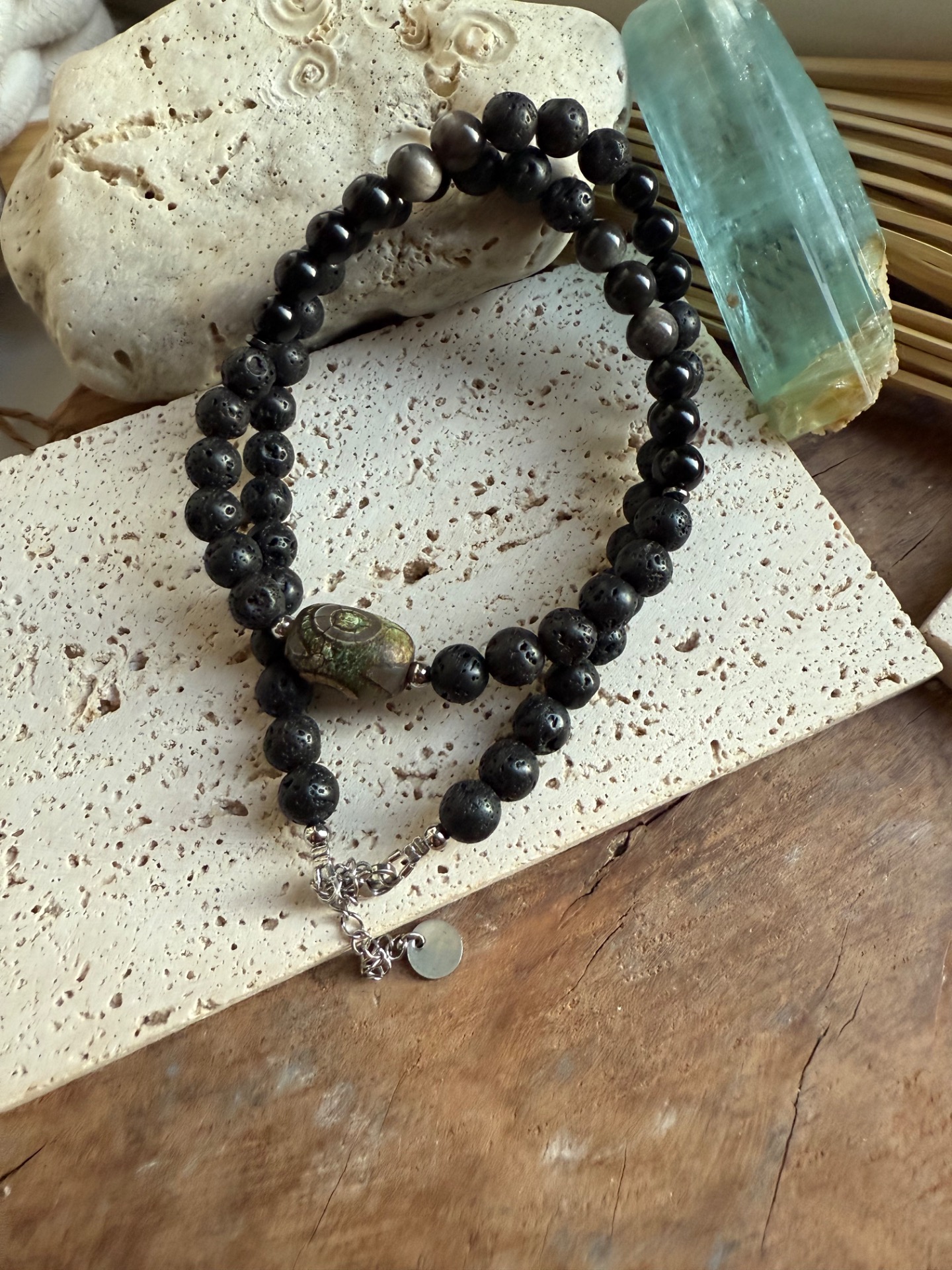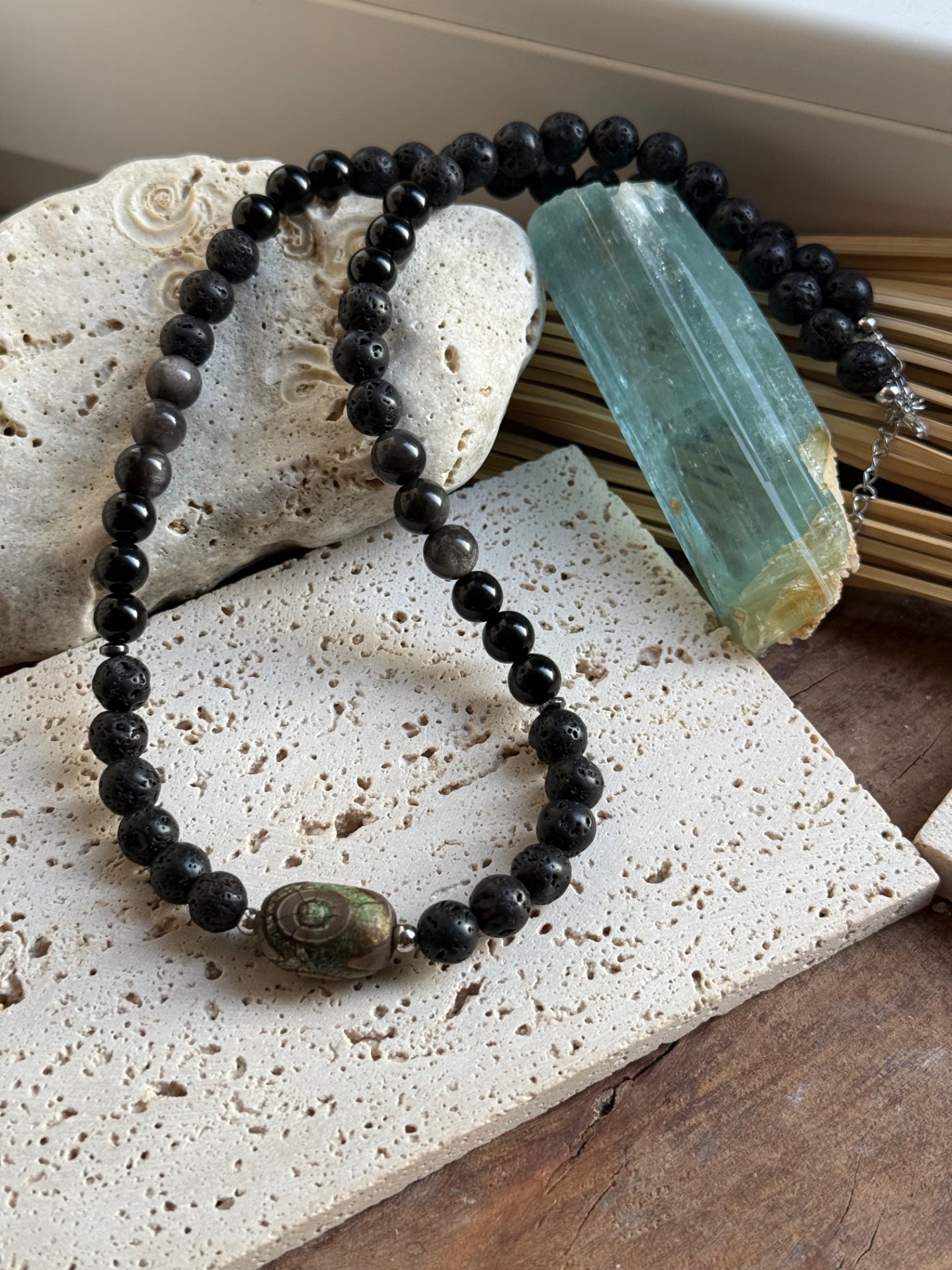 Kombinácia čiernych minerálov symbolizuje stabilitu, odvahu, ochranu a duchovnú silu – štít, ktorý harmonizuje telo i myseľ.