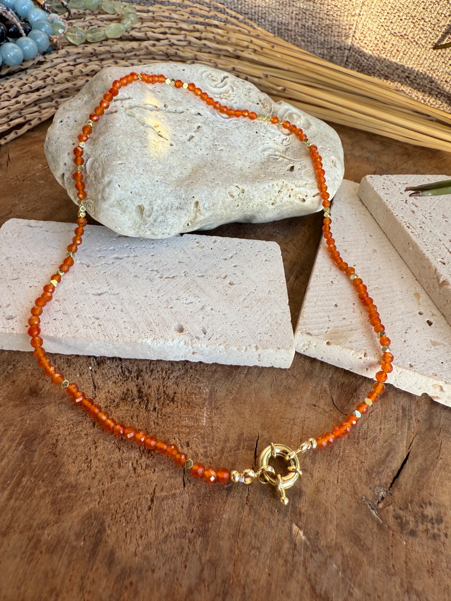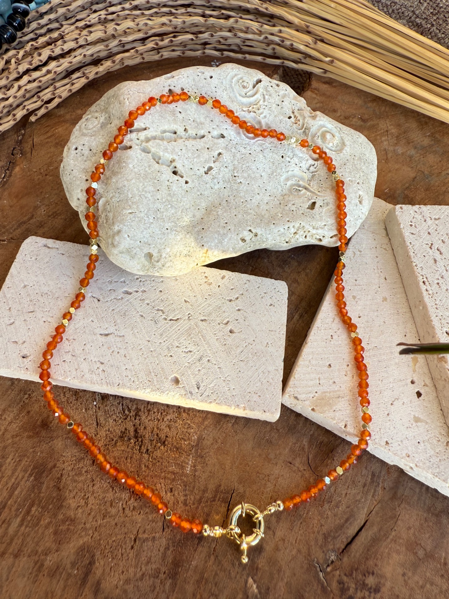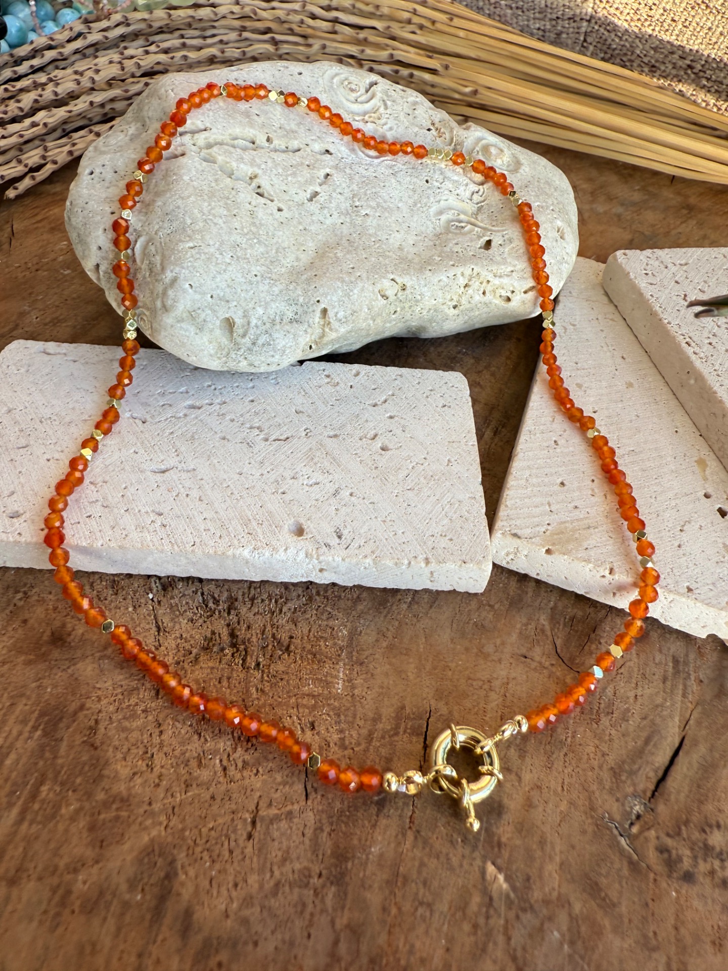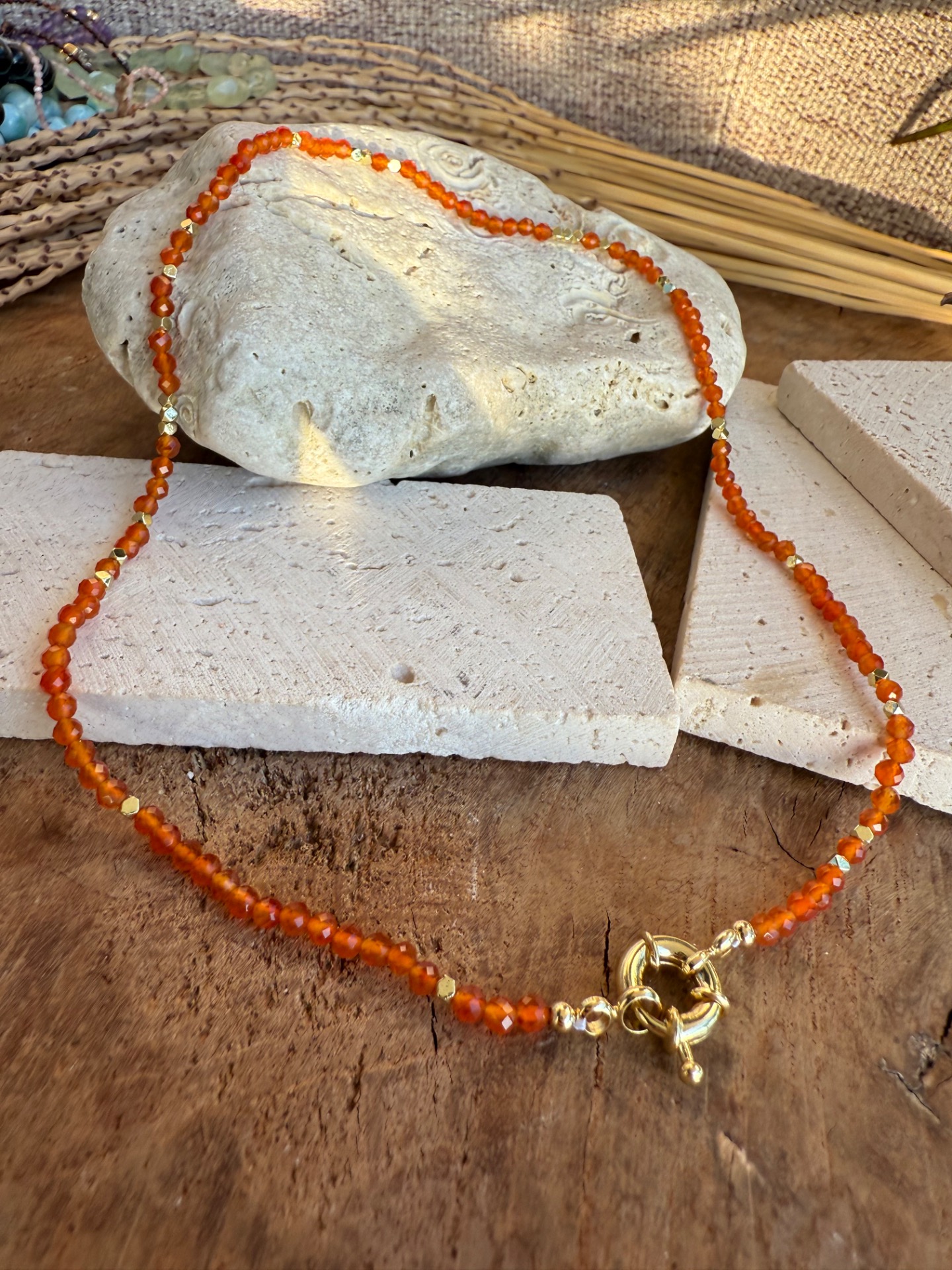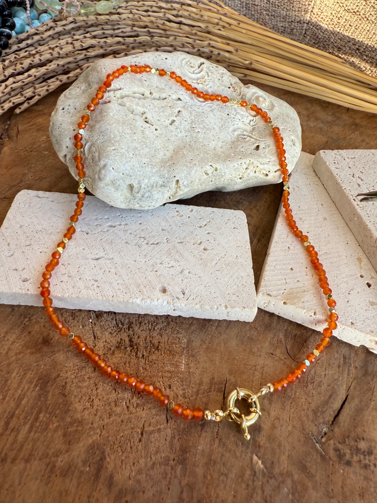 Jemný ručne vyrobený náhrdelník z drobných fazetovaných korálok karneolu (2 mm), doplnený o zlaté prvky a elegantné predné zapínanie toggle.