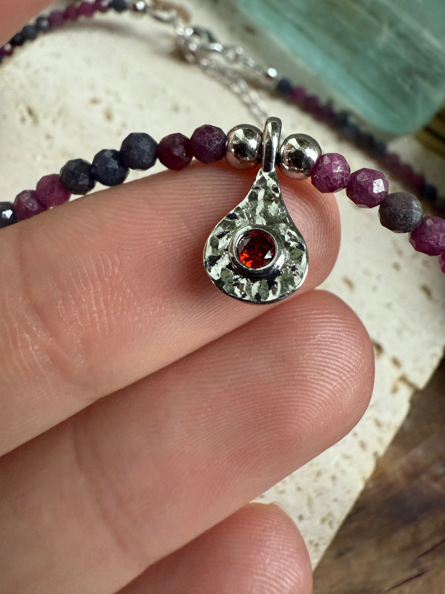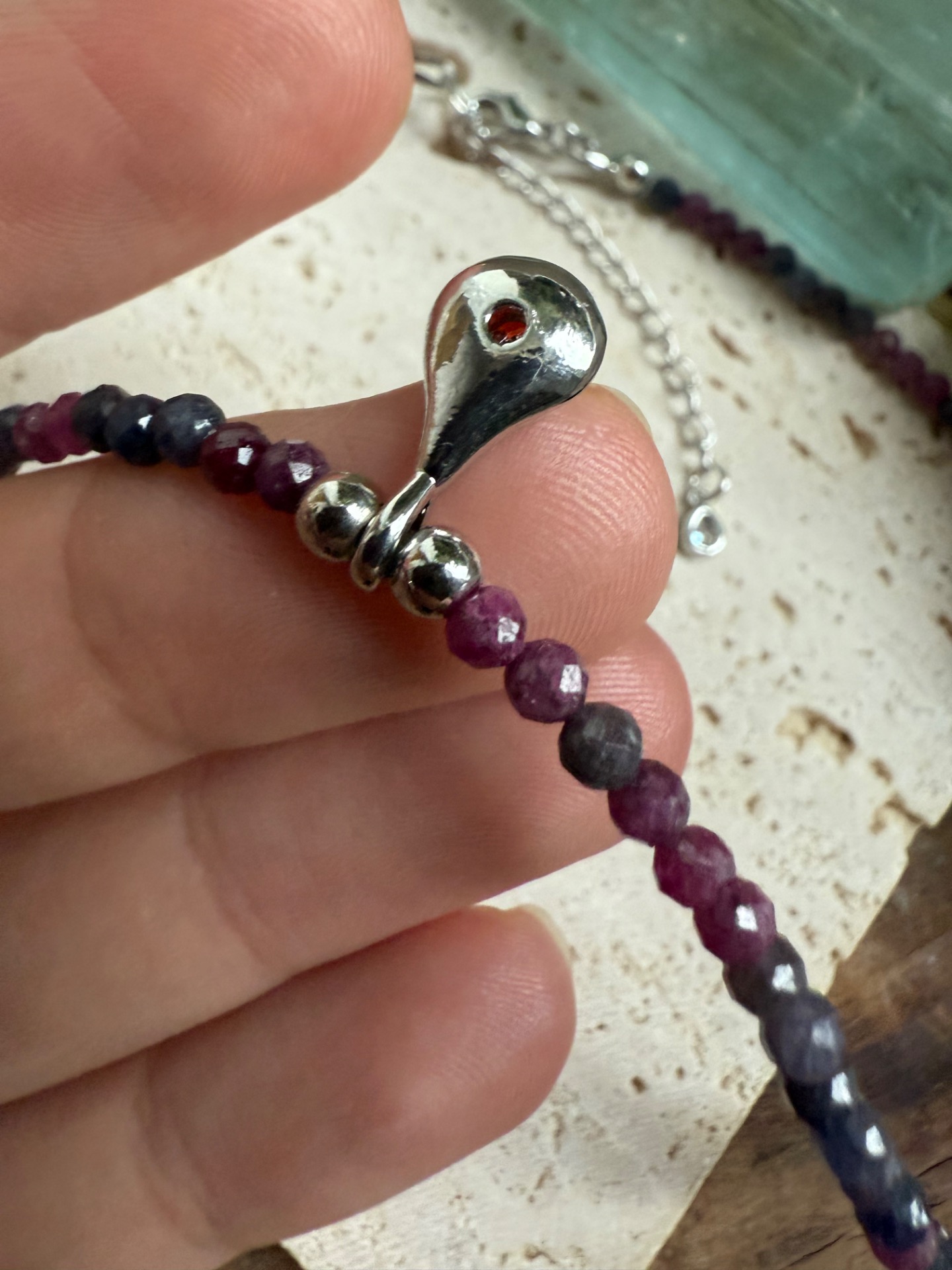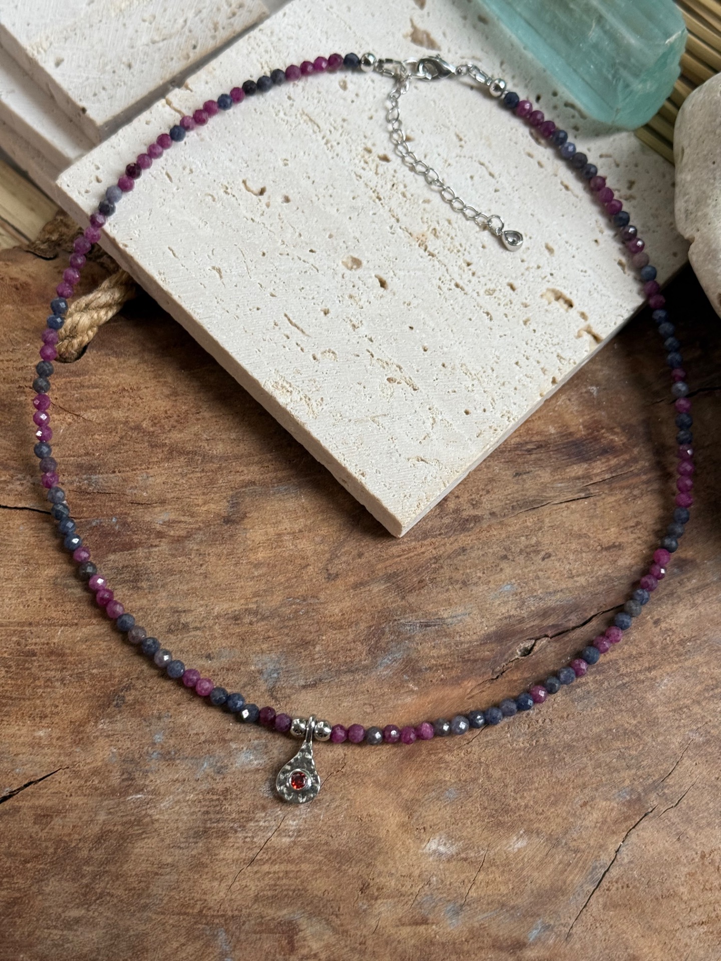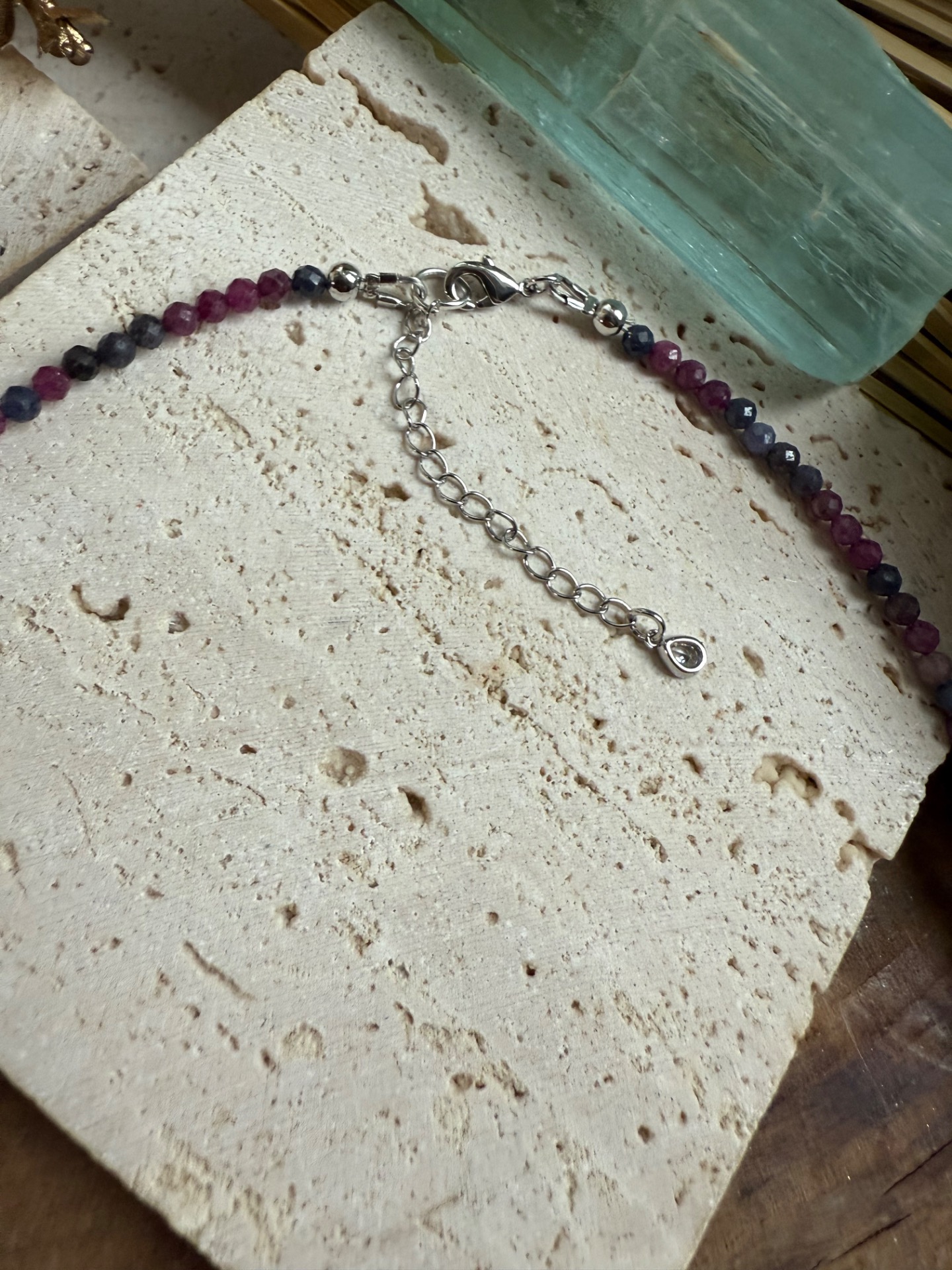 Tento elegantný náhrdelník spája rubín a zafír v 2,5 mm fazetovom výbruse, ktoré spolu vytvárajú jemný, no energeticky silný kontrast. Každá korálka odráža svetlo a dodáva šperku živý a iskrivý charakter.