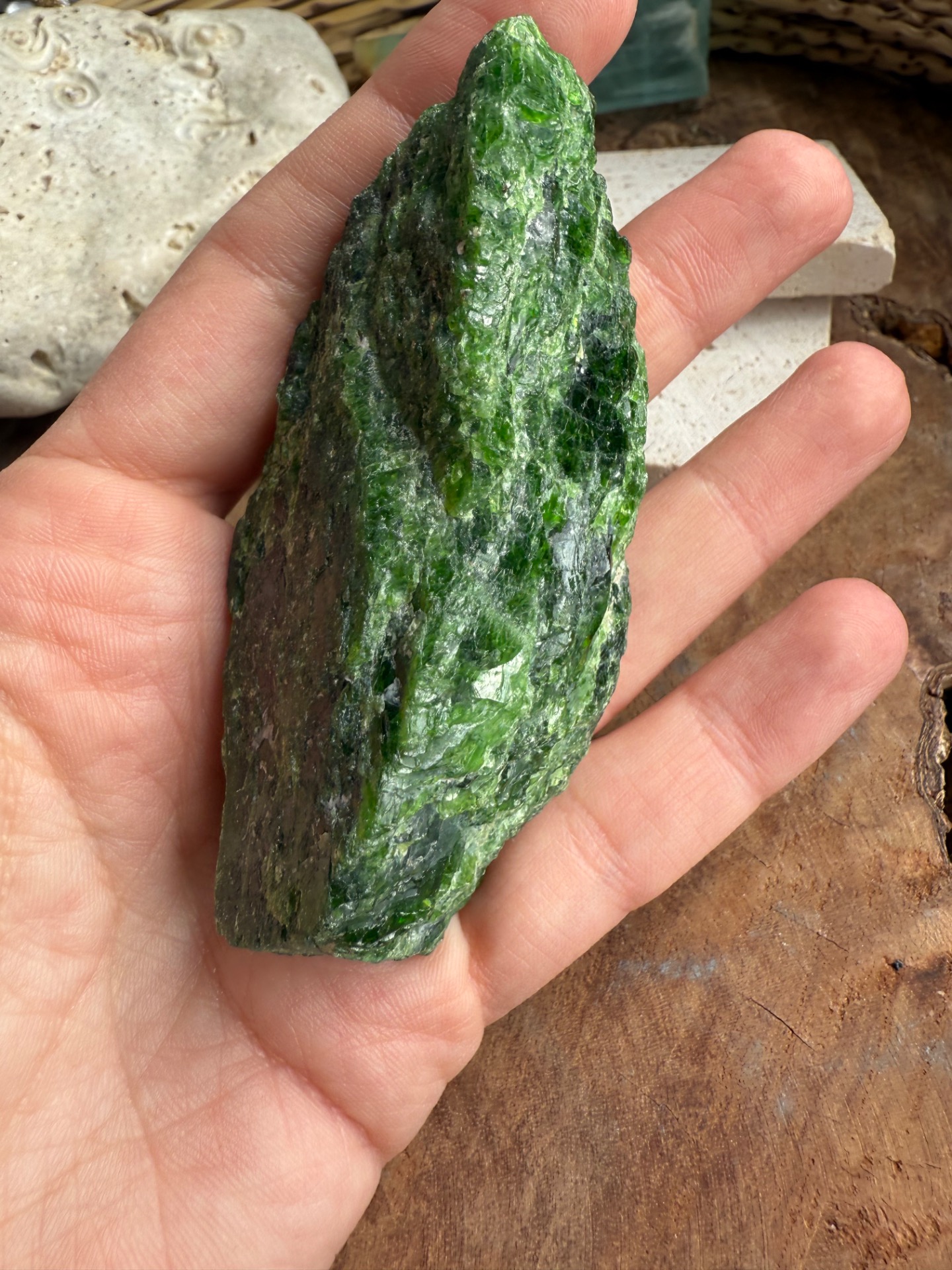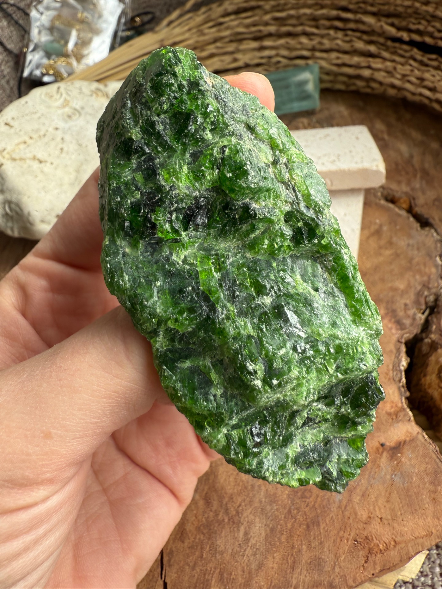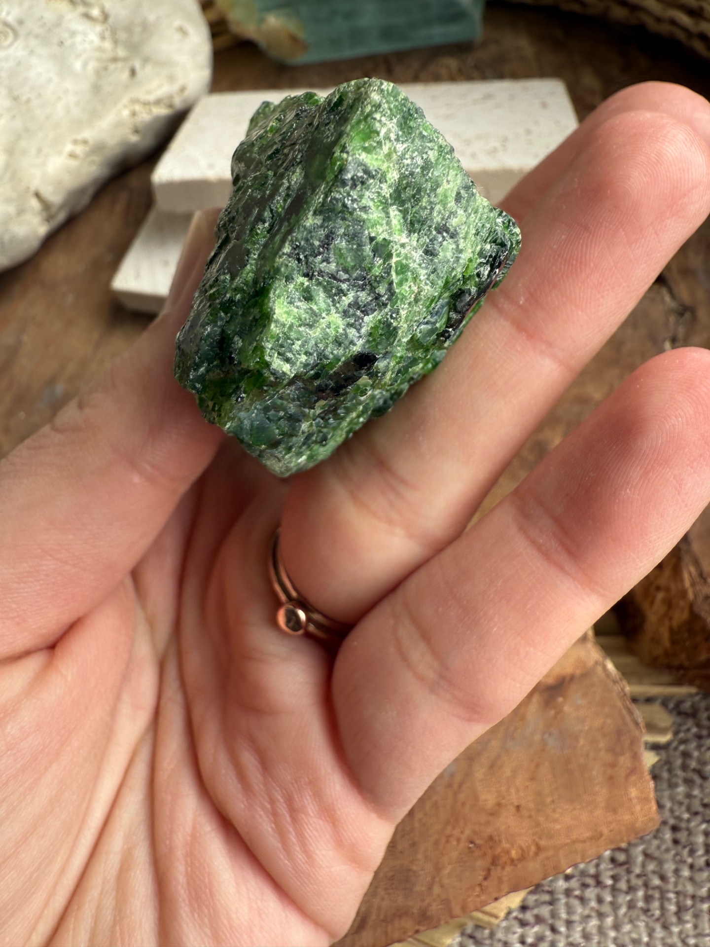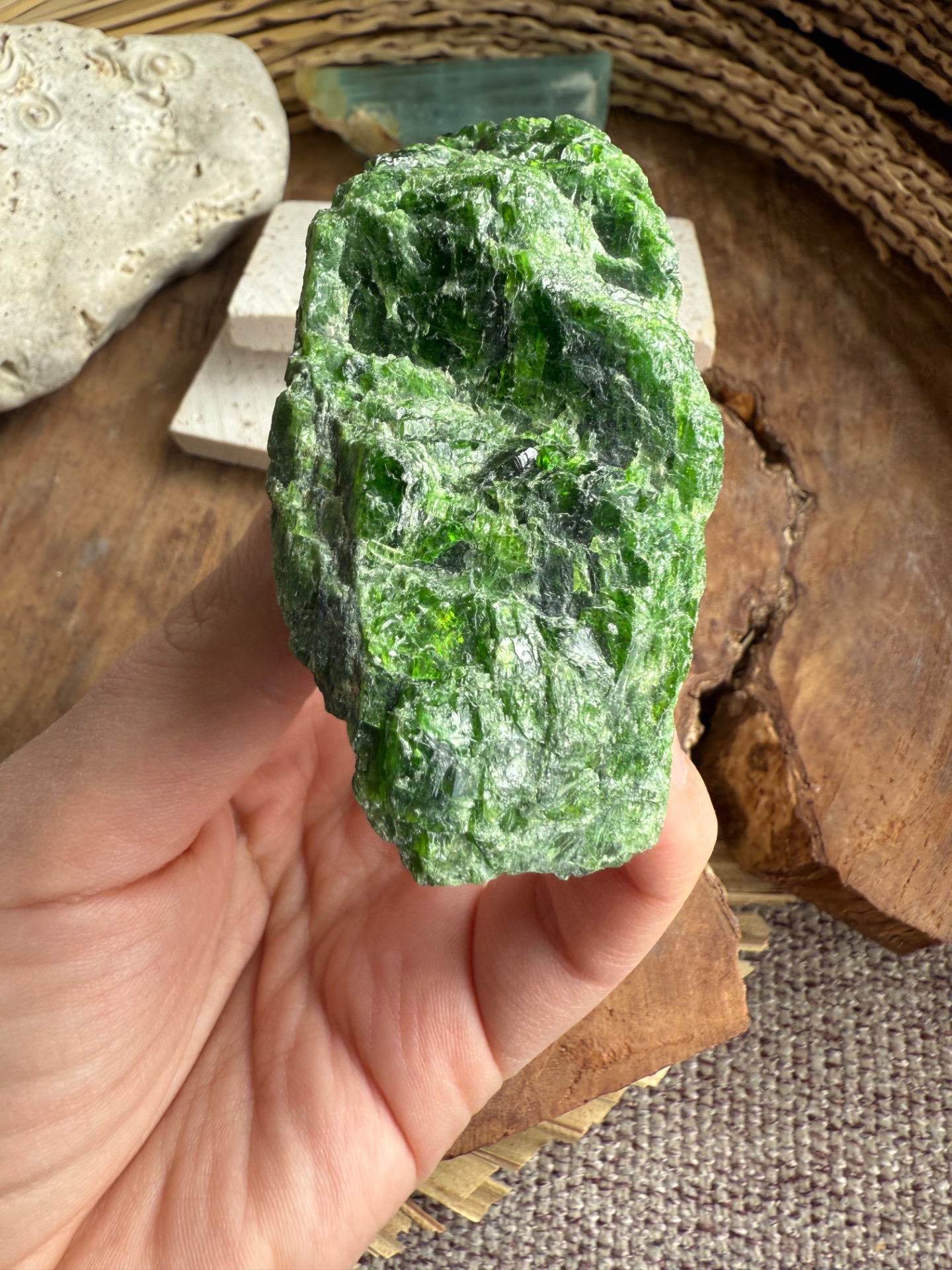 Prekrásny prírodný kúsok chromdiopsidu s intenzívnou smaragdovo zelenou farbou a viditeľnou kryštalickou štruktúrou. Minerál, ktorý okamžite pritiahne pozornosť a oživí každý priestor.