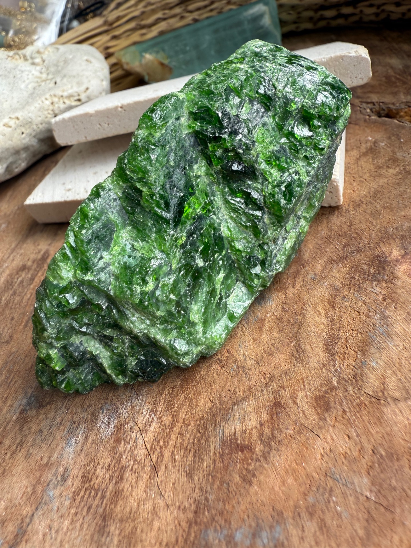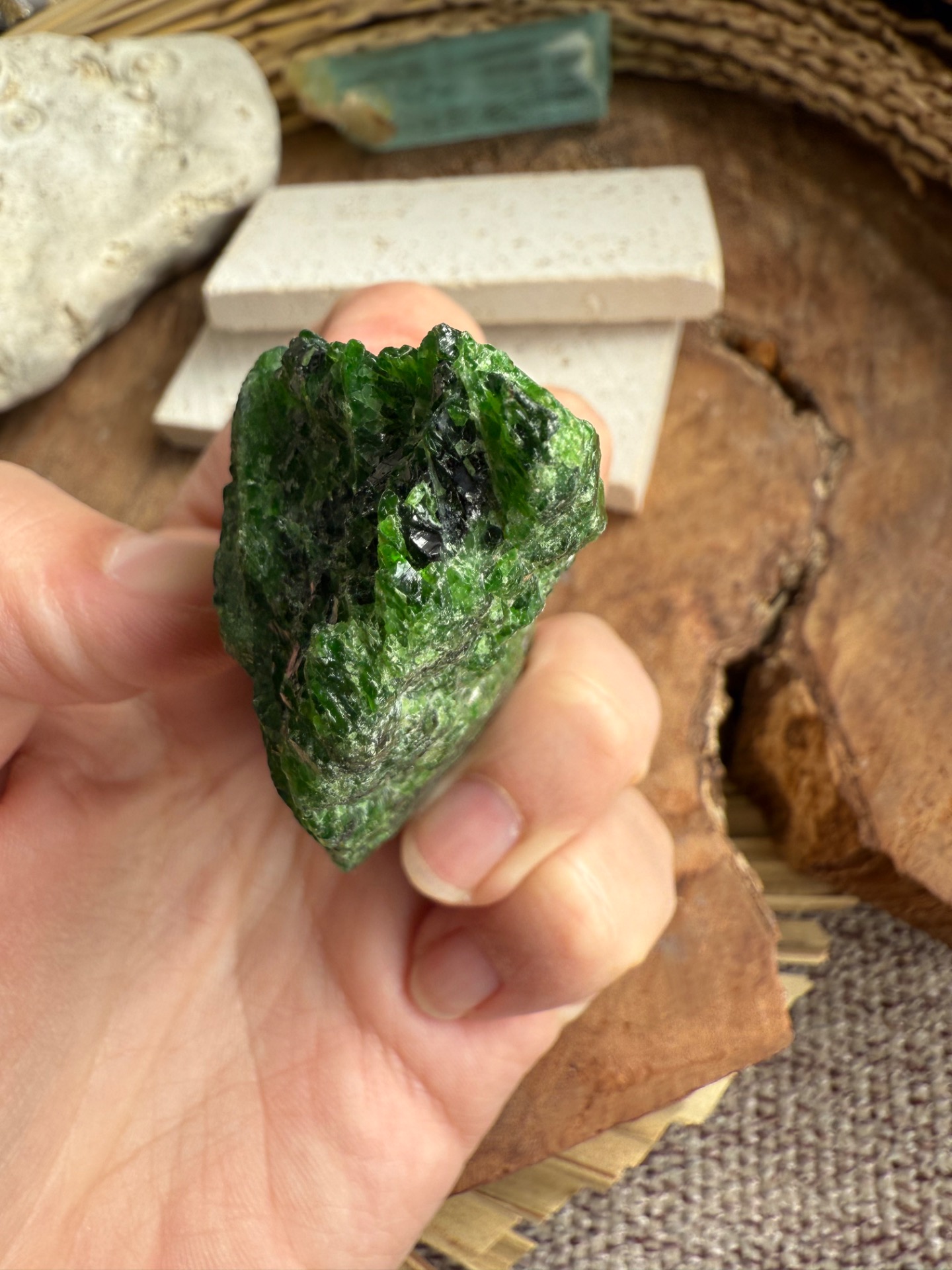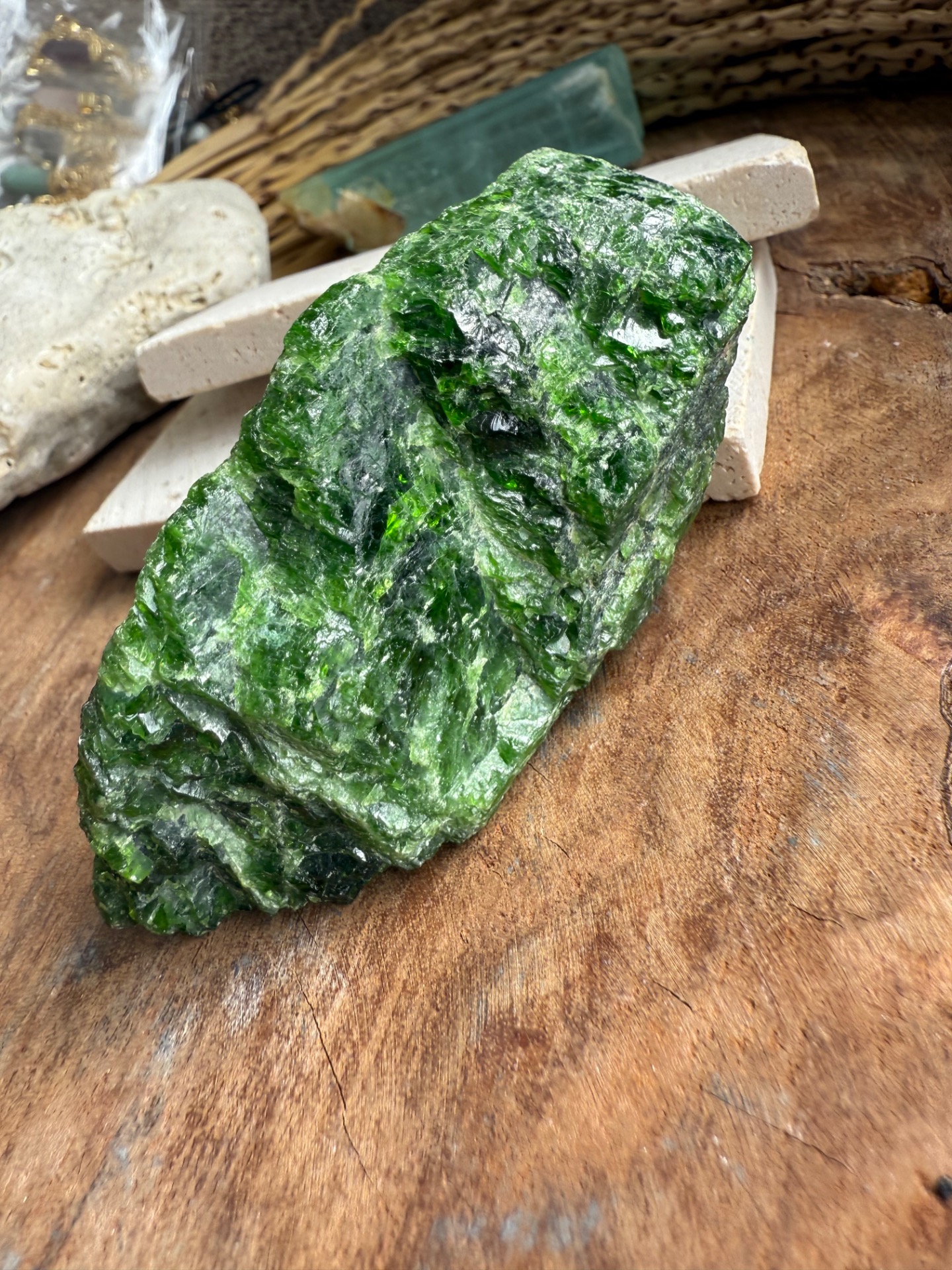Prekrásny prírodný kúsok chromdiopsidu s intenzívnou smaragdovo zelenou farbou a viditeľnou kryštalickou štruktúrou. Minerál, ktorý okamžite pritiahne pozornosť a oživí každý priestor.