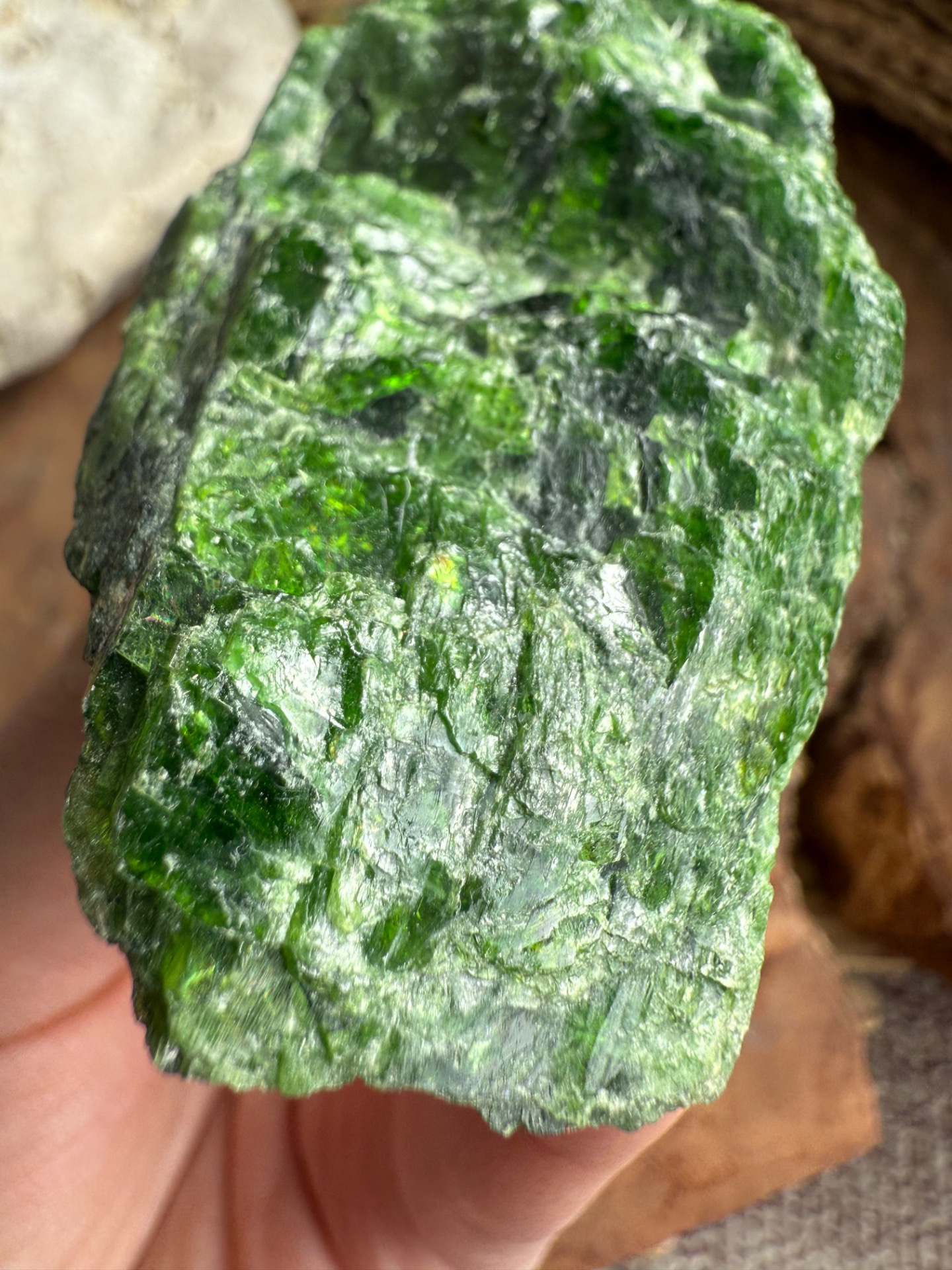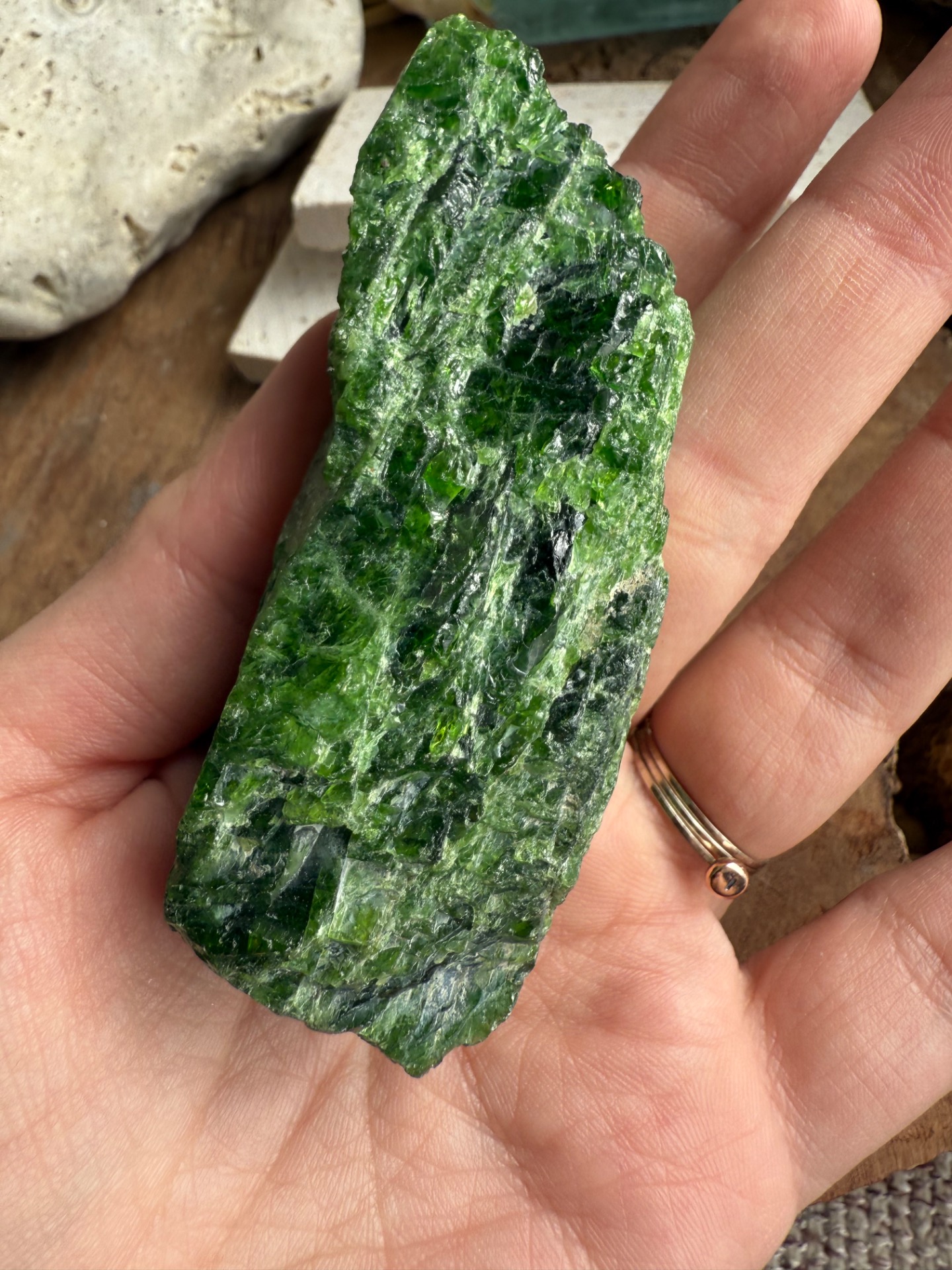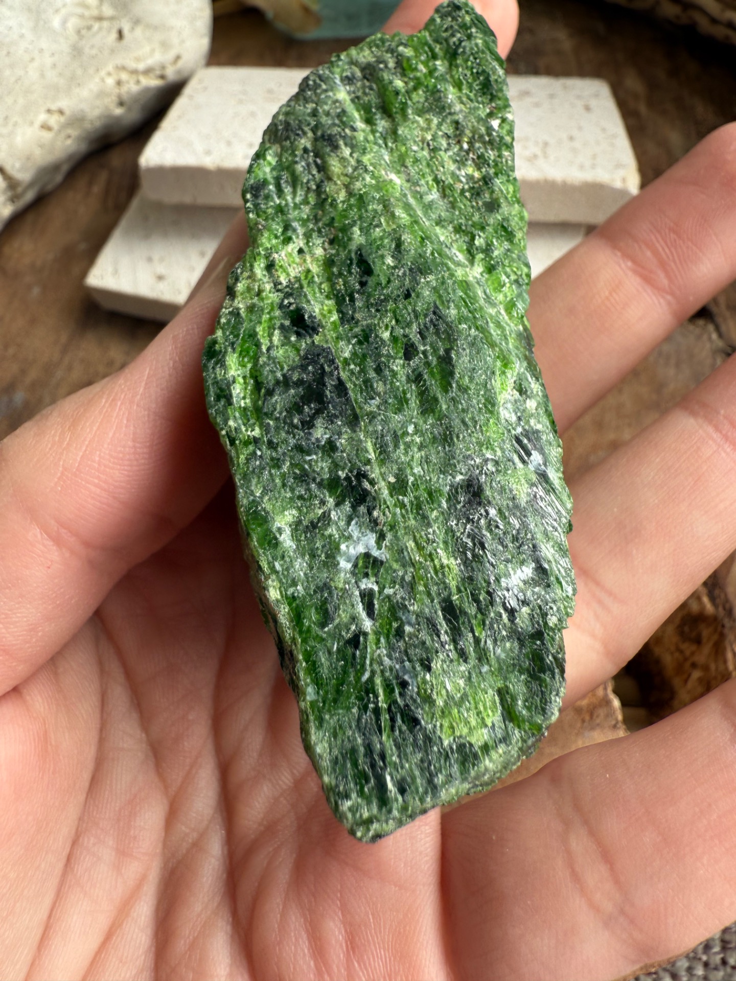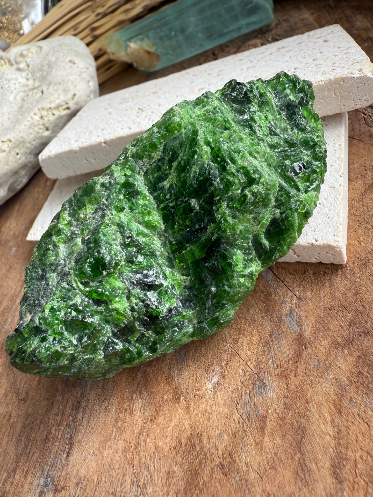 Prekrásny prírodný kúsok chromdiopsidu s intenzívnou smaragdovo zelenou farbou a viditeľnou kryštalickou štruktúrou. Minerál, ktorý okamžite pritiahne pozornosť a oživí každý priestor.