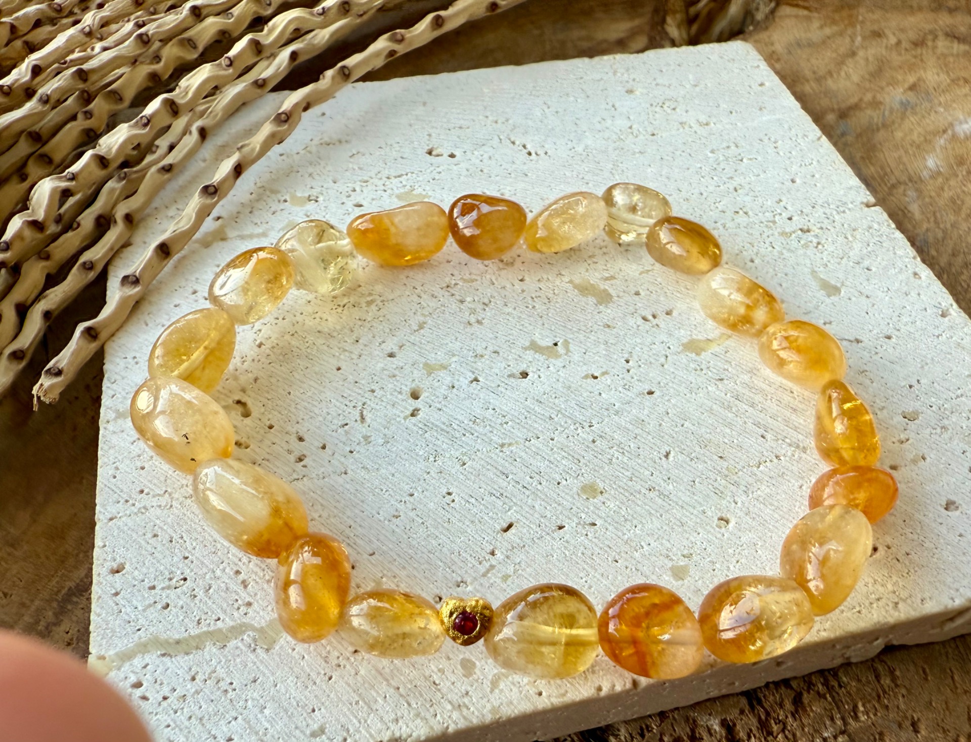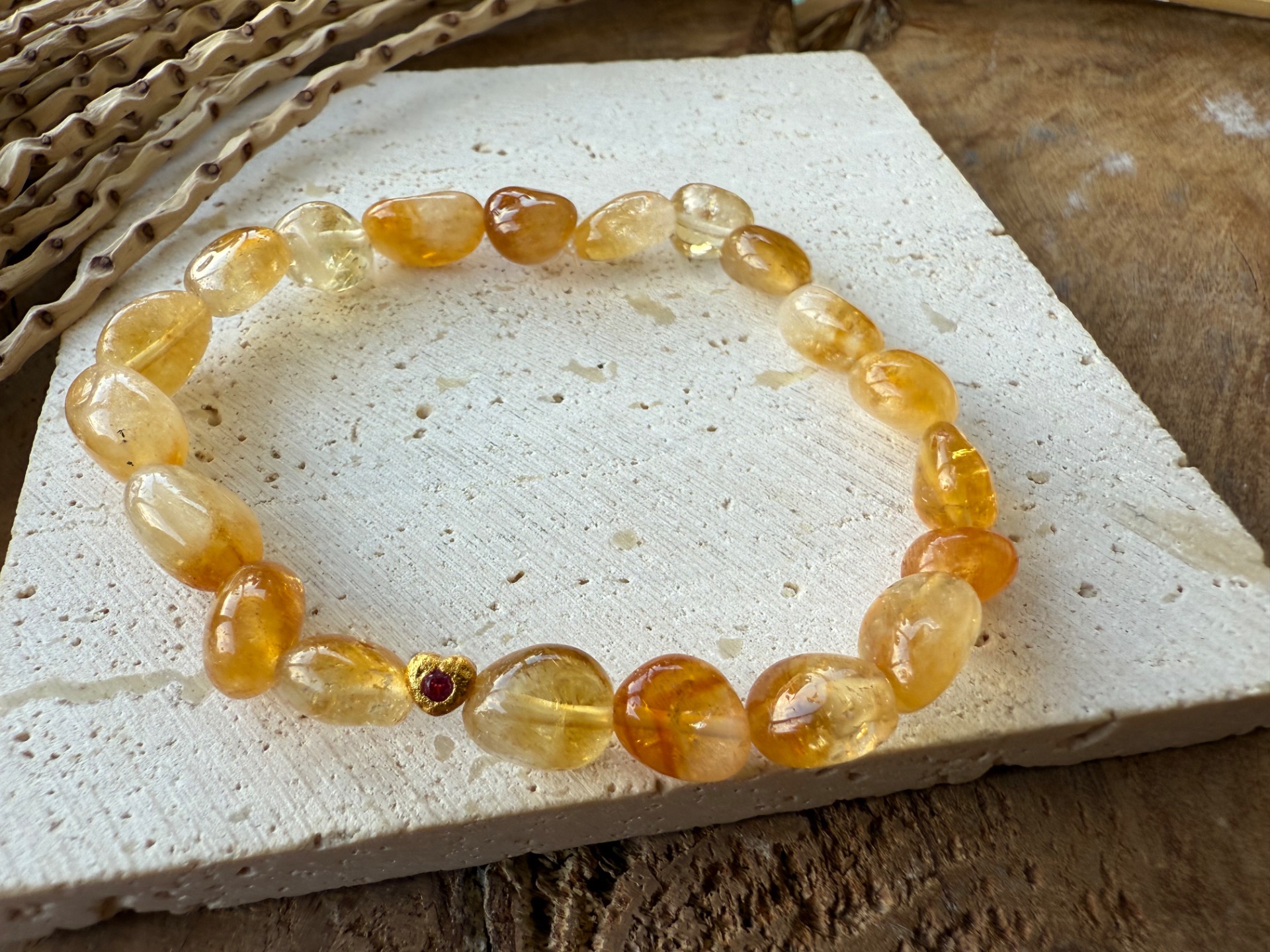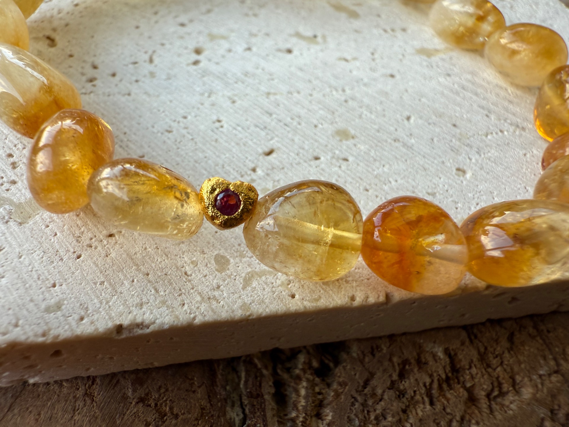 Náramok z minerálu citrín nugety menšie nepravdidelné , doplnený nerezovým srdiečkom s červeným kamienkom 14k gold plated.