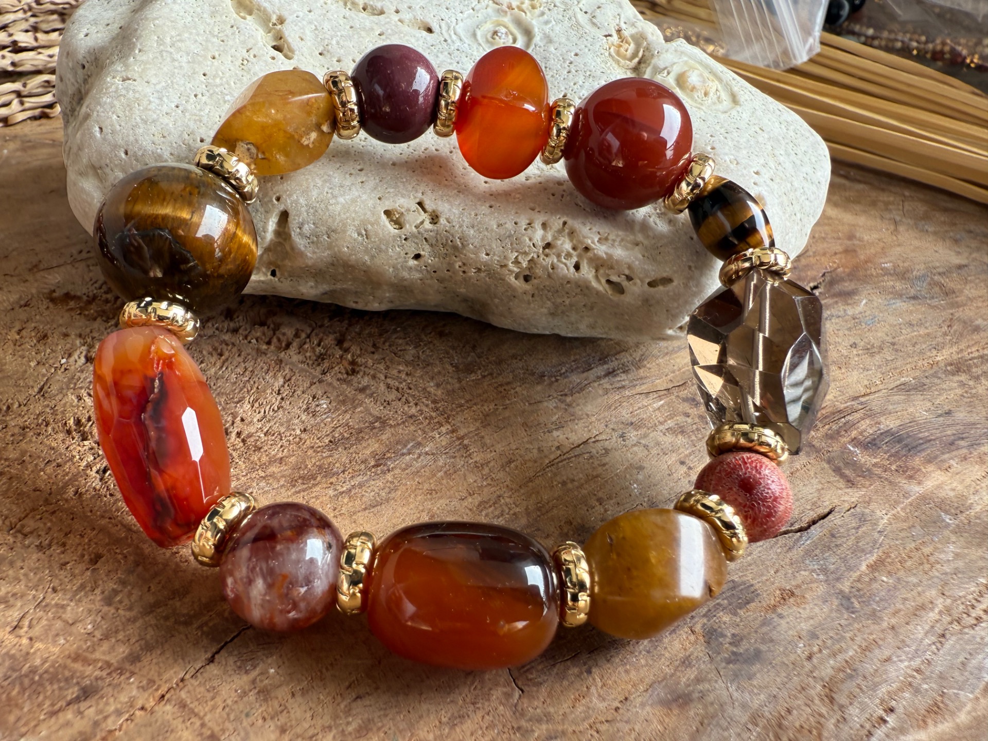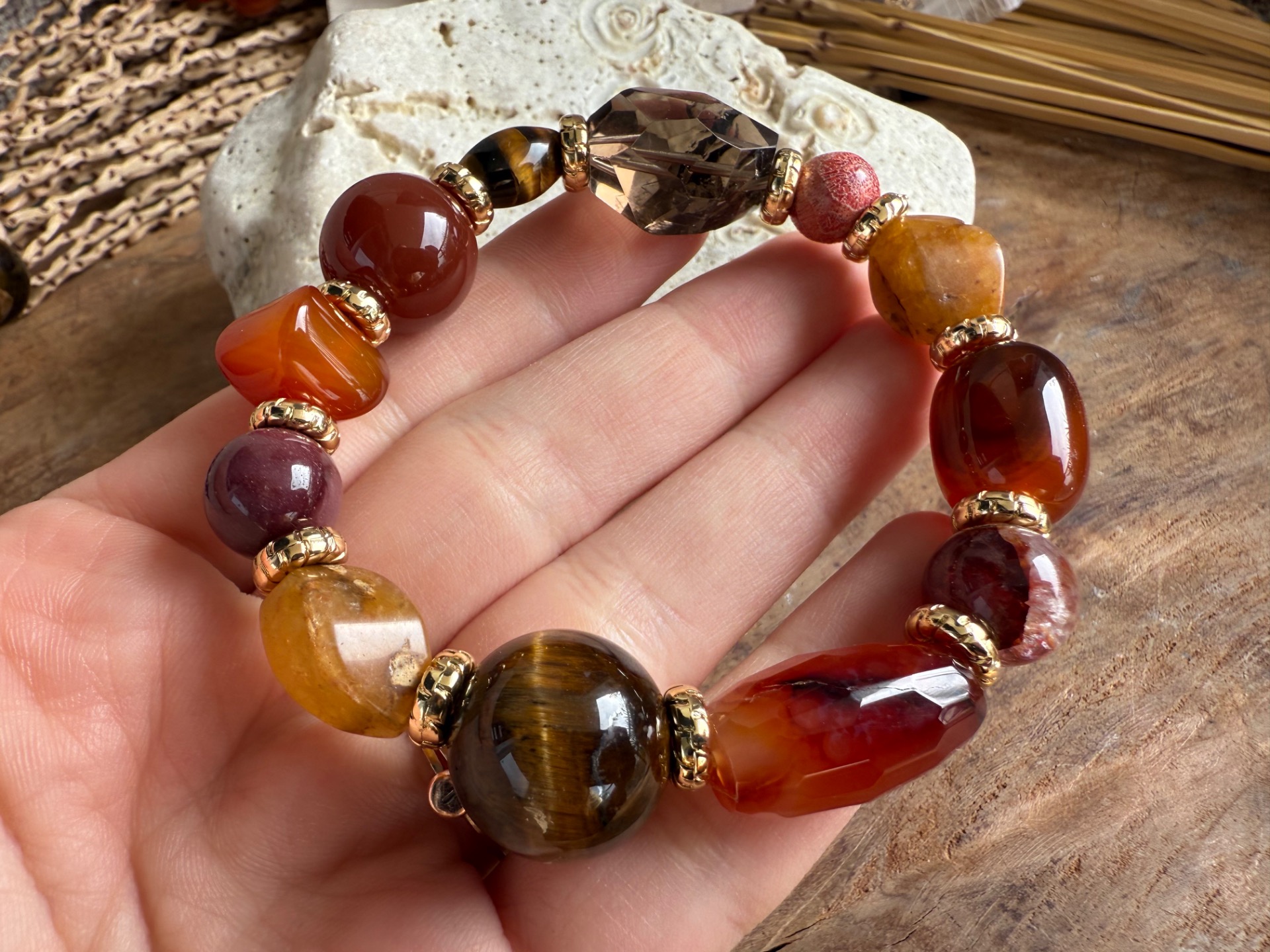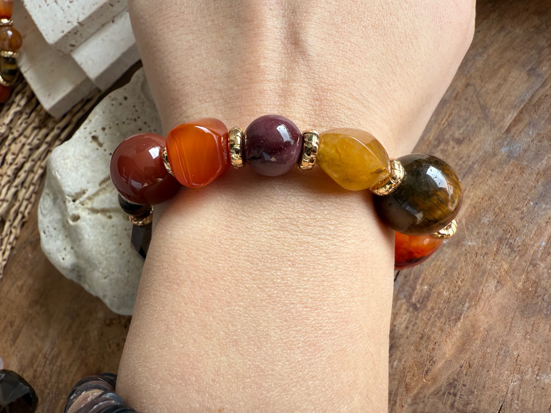 Tento náramok je ako malý zdroj energie a sebavedomia – masívne kamienky rôznych tvarov a veľkostí tvoria harmonický celok, ktorý podporuje vitalitu, odvahu a vnútornú silu. Každý kameň prináša svoju jedinečnú vibráciu a spoločne vytvárajú dynamický, živý šperk.