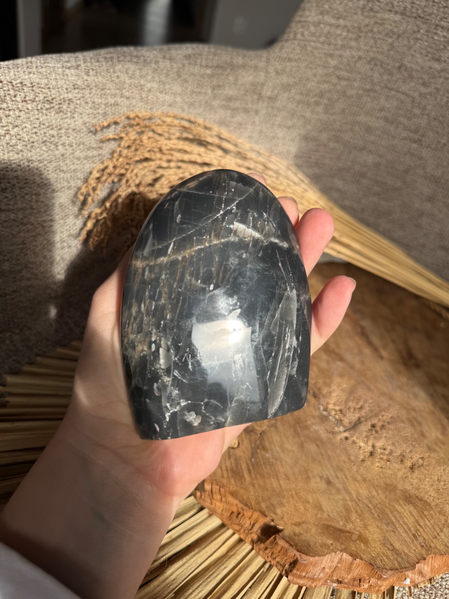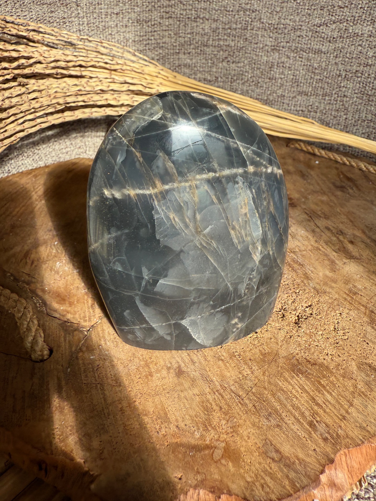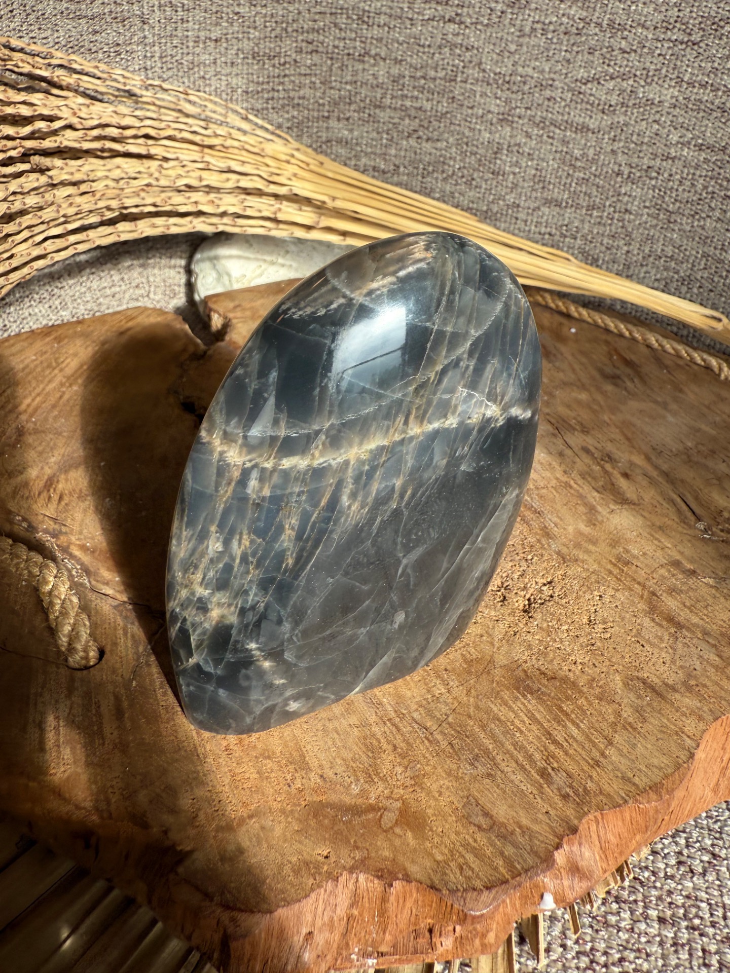 Pôvod a vznik: Čierny mesačný kameň vzniká geologickými procesmi v žule a jeho tmavé varianty prinášajú silnú transformačnú a uzemňujúcu energiu. Free form tvar zachováva autentickosť a prirodzenú štruktúru minerálu.