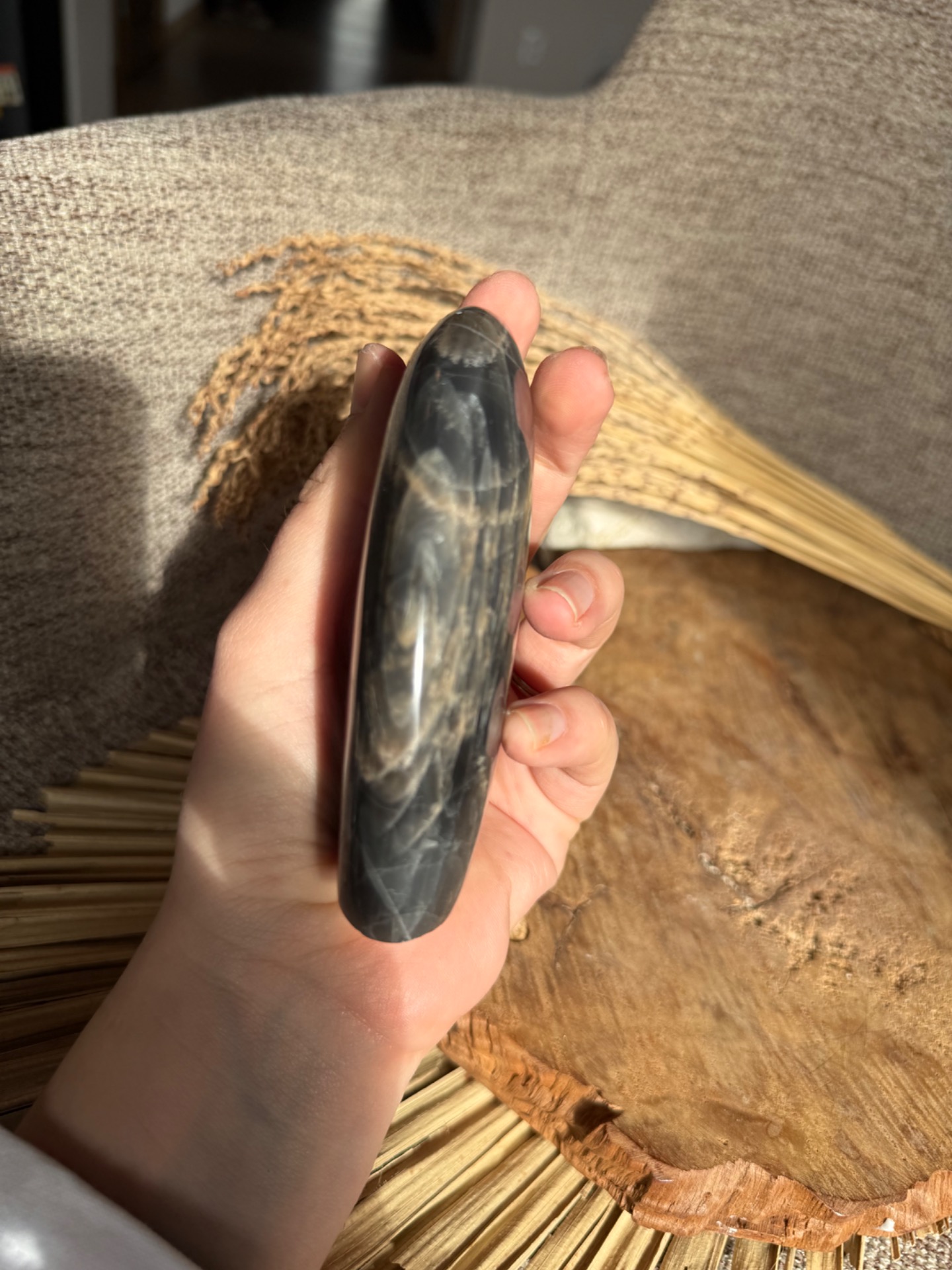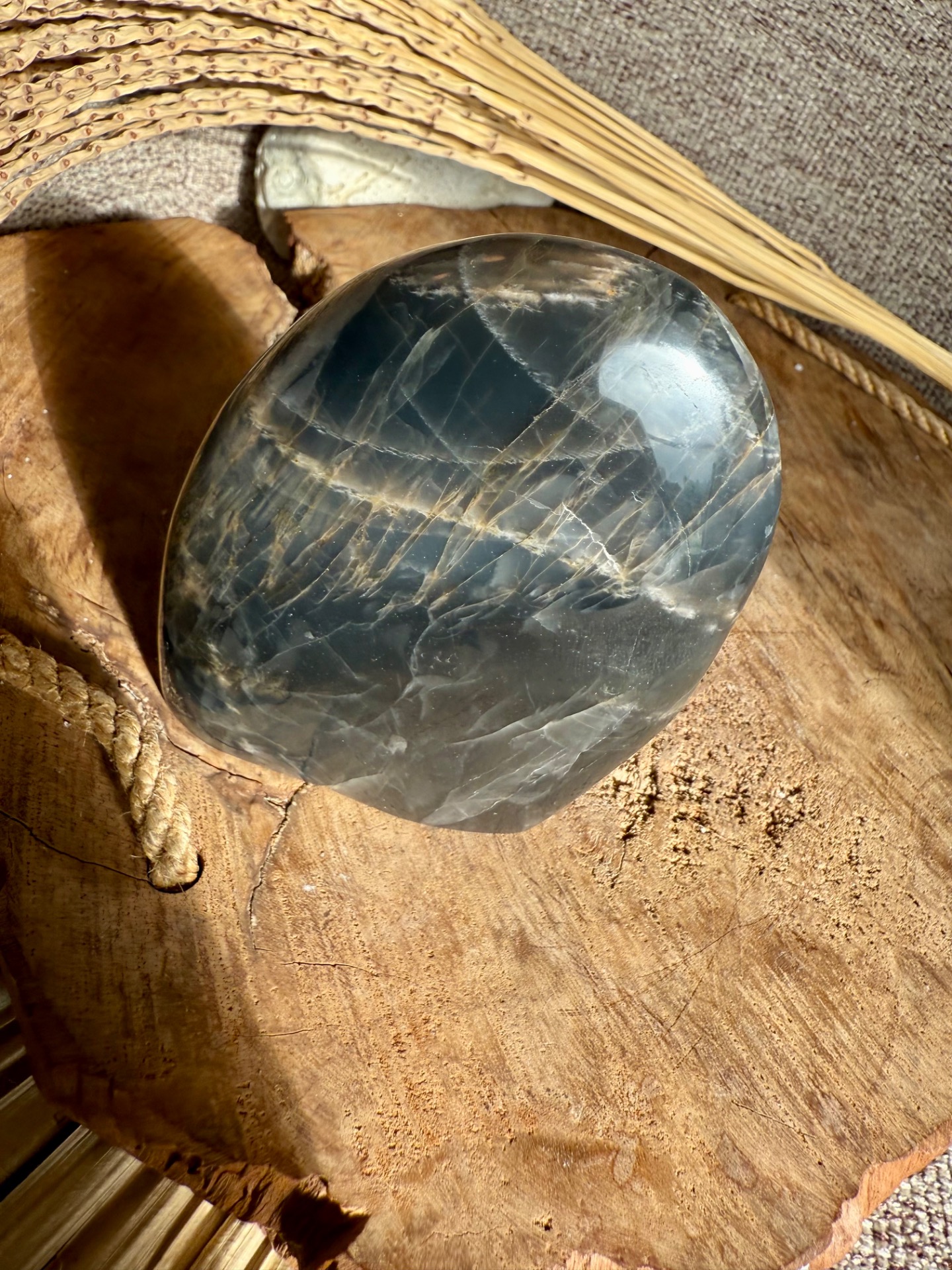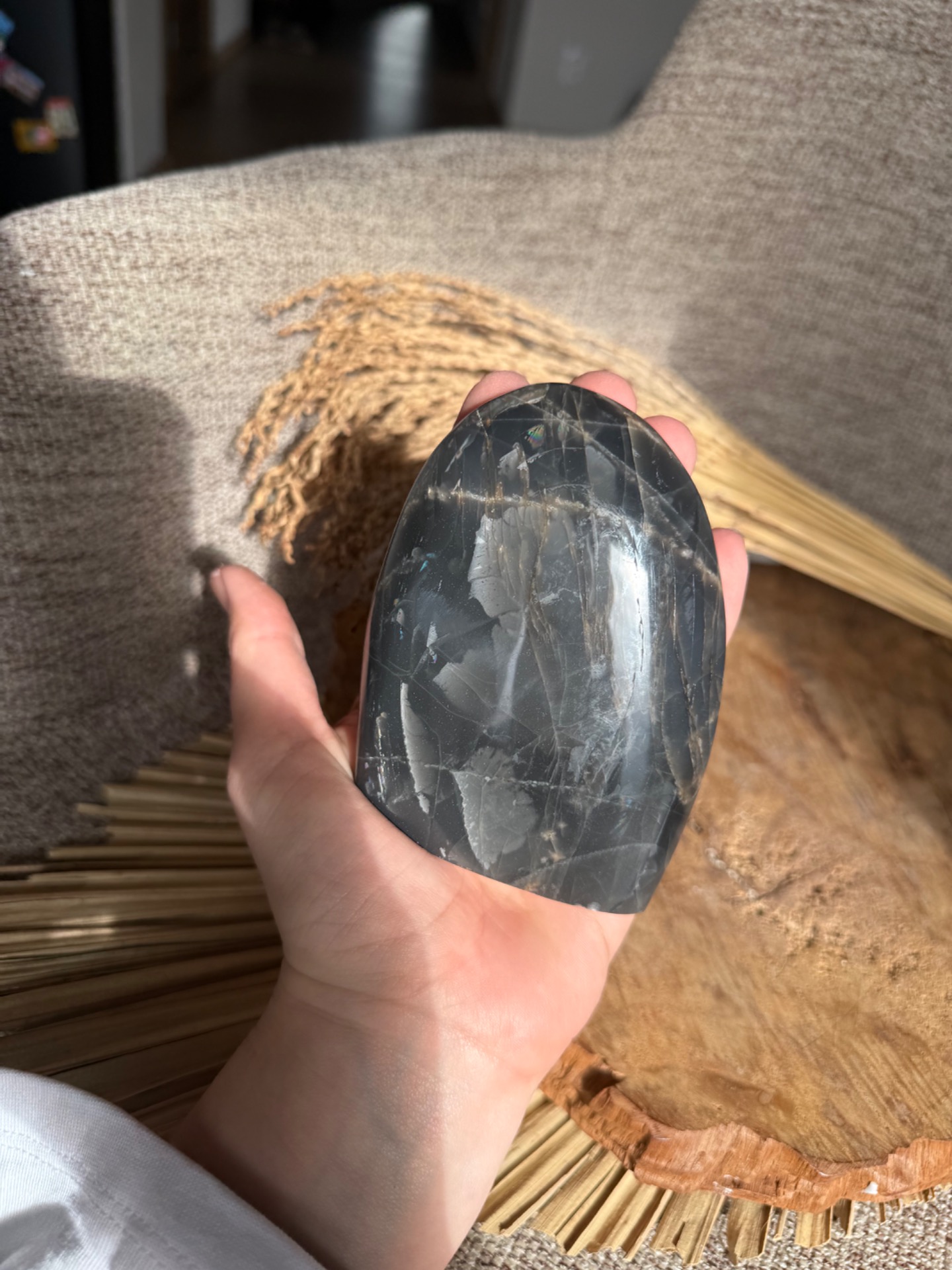 Pôvod a vznik: Čierny mesačný kameň vzniká geologickými procesmi v žule a jeho tmavé varianty prinášajú silnú transformačnú a uzemňujúcu energiu. Free form tvar zachováva autentickosť a prirodzenú štruktúru minerálu.