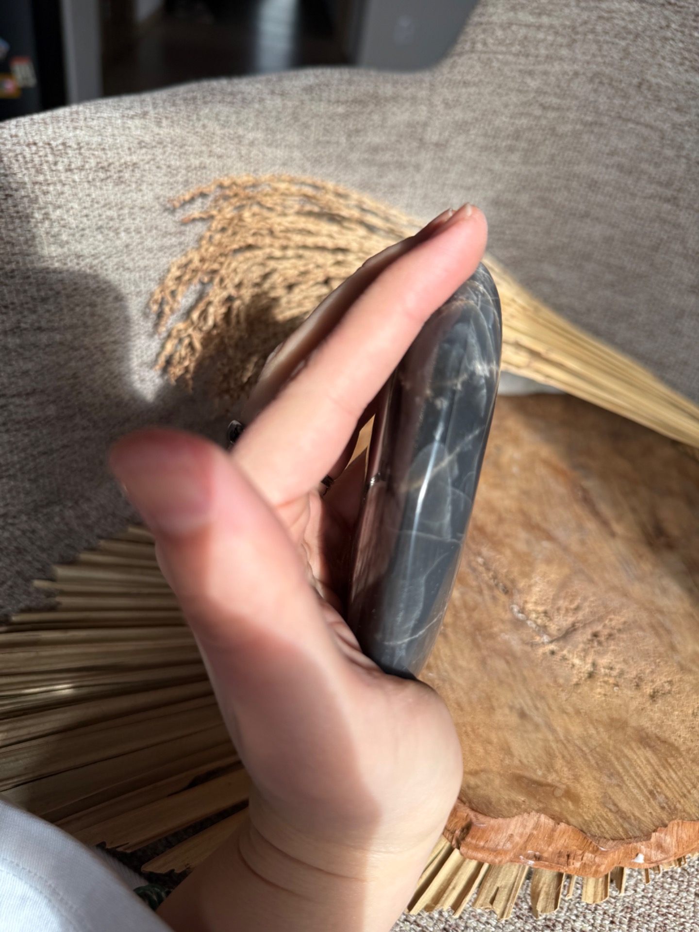 Vizualita a úprava: Kameň je ponechaný v prírodnom free form tvare, ktorý zvýrazňuje jeho tmavé odtiene a jedinečnú textúru. Každý kus je originál – presne tak, ako ho vidíte na fotografiách.