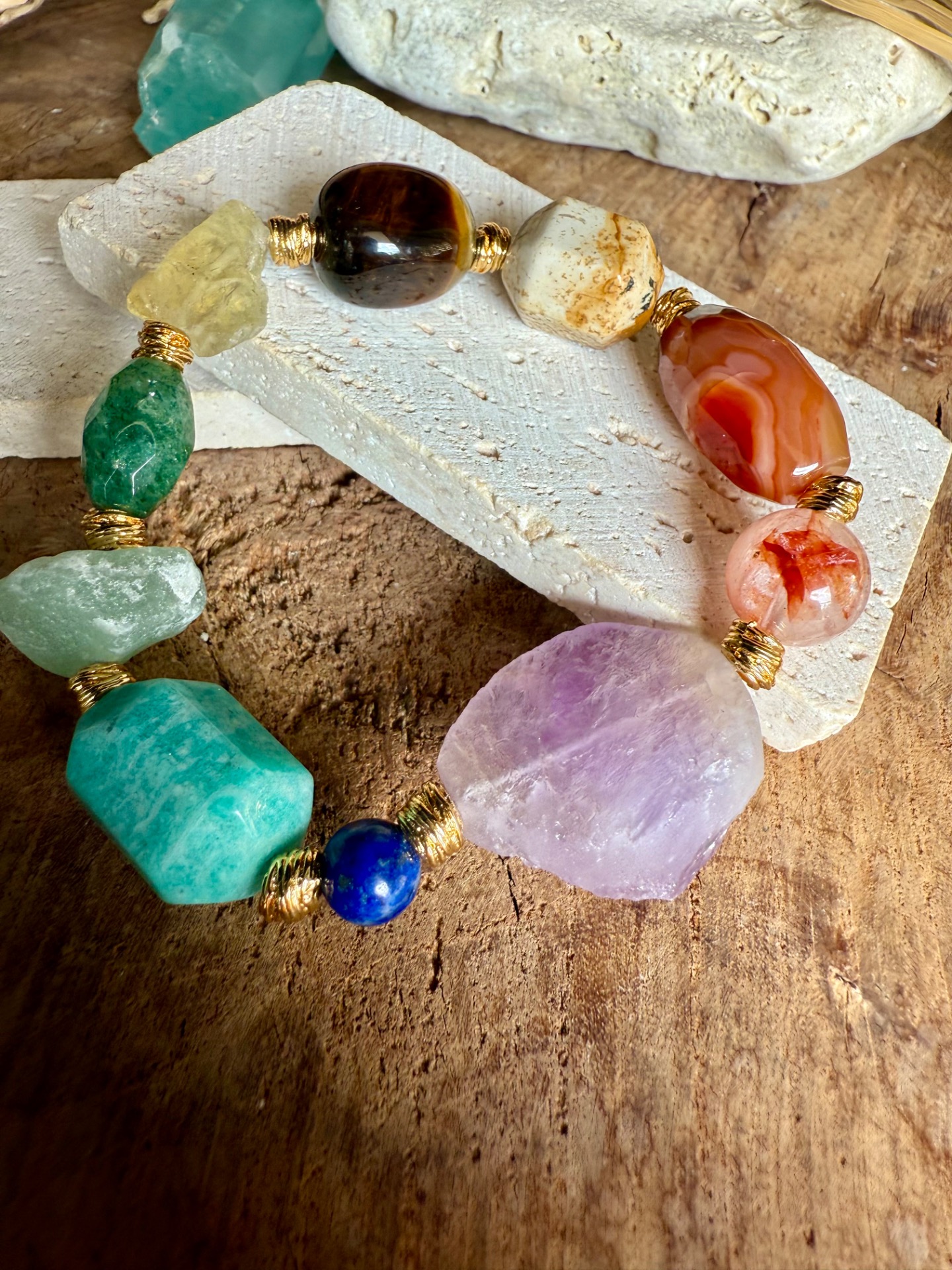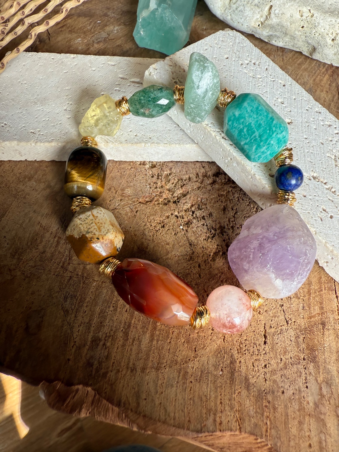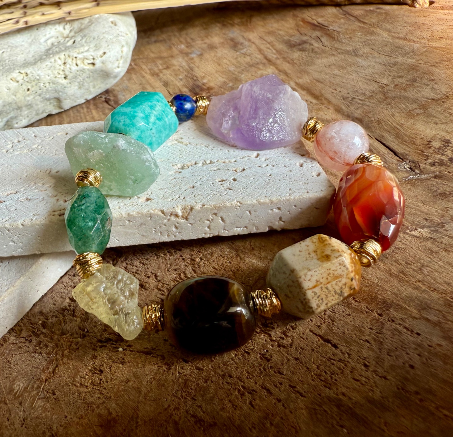 Každý náramok je originál – kamene sa líšia tvarom, kresbou aj odtieňom, čo robí každý kus jedinečným malým umeleckým dielom prírody. Zlaté detaily zvýrazňujú prirodzenú krásu minerálov a dodávajú šperku jemnú boho eleganciu.