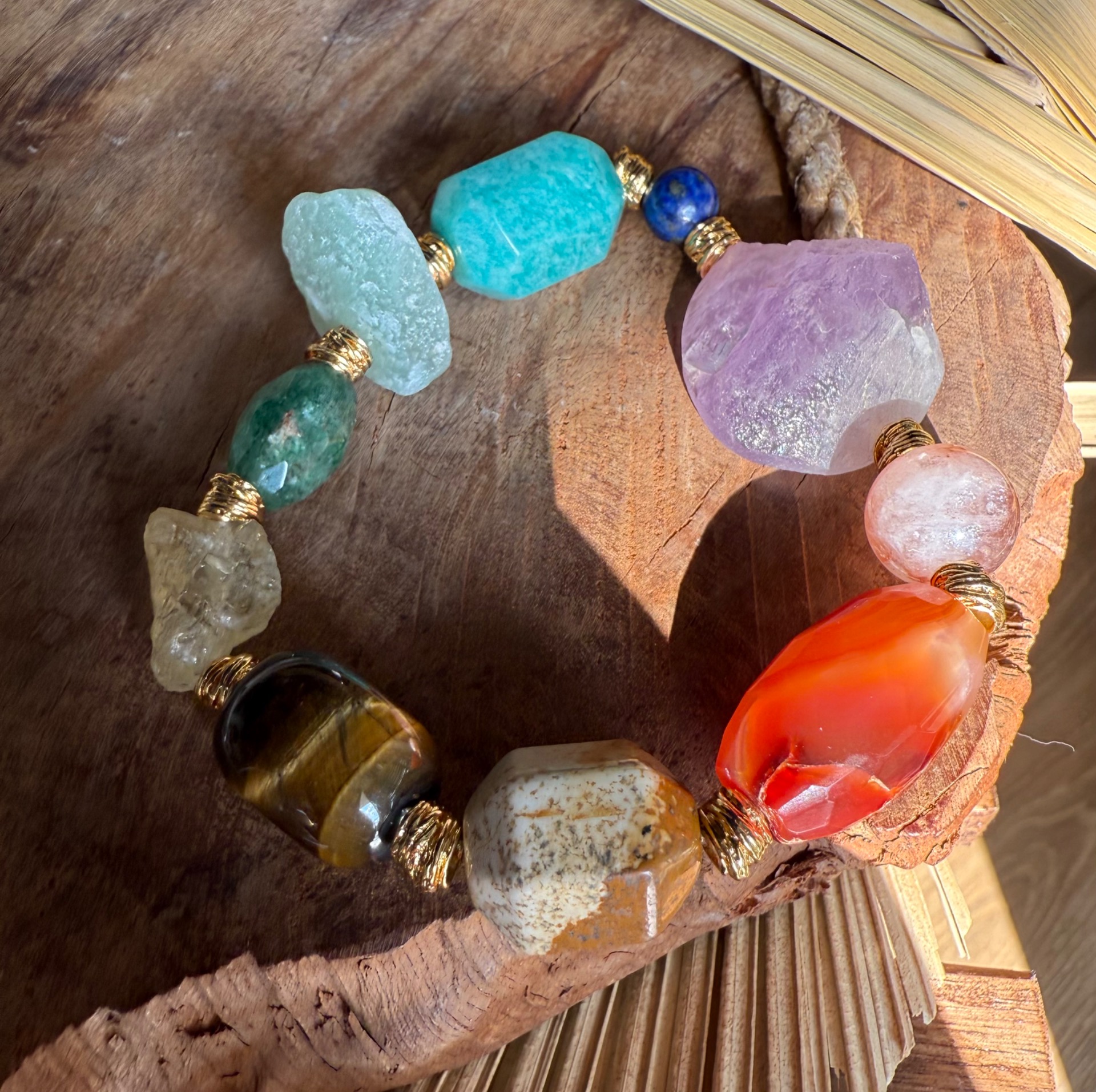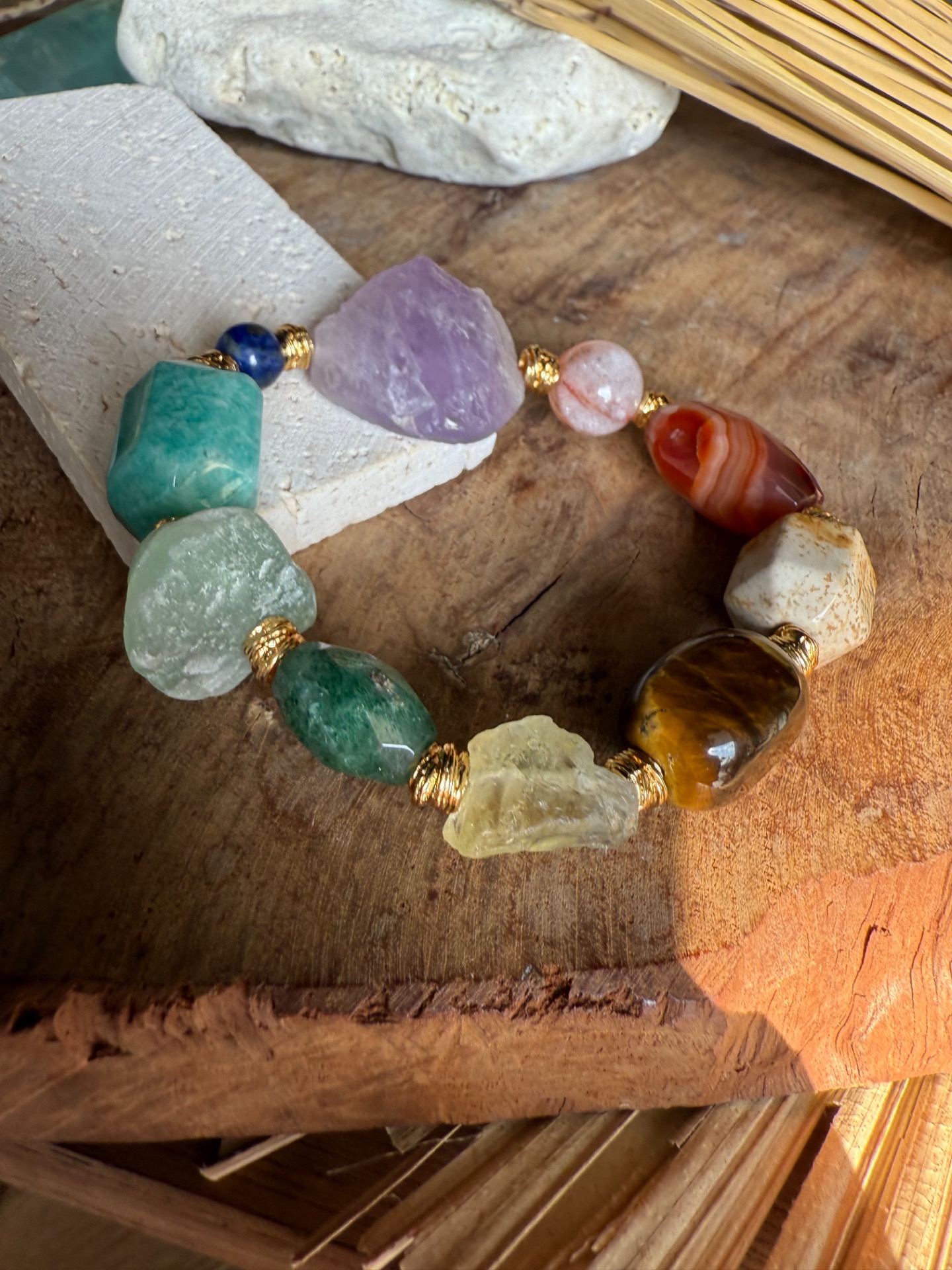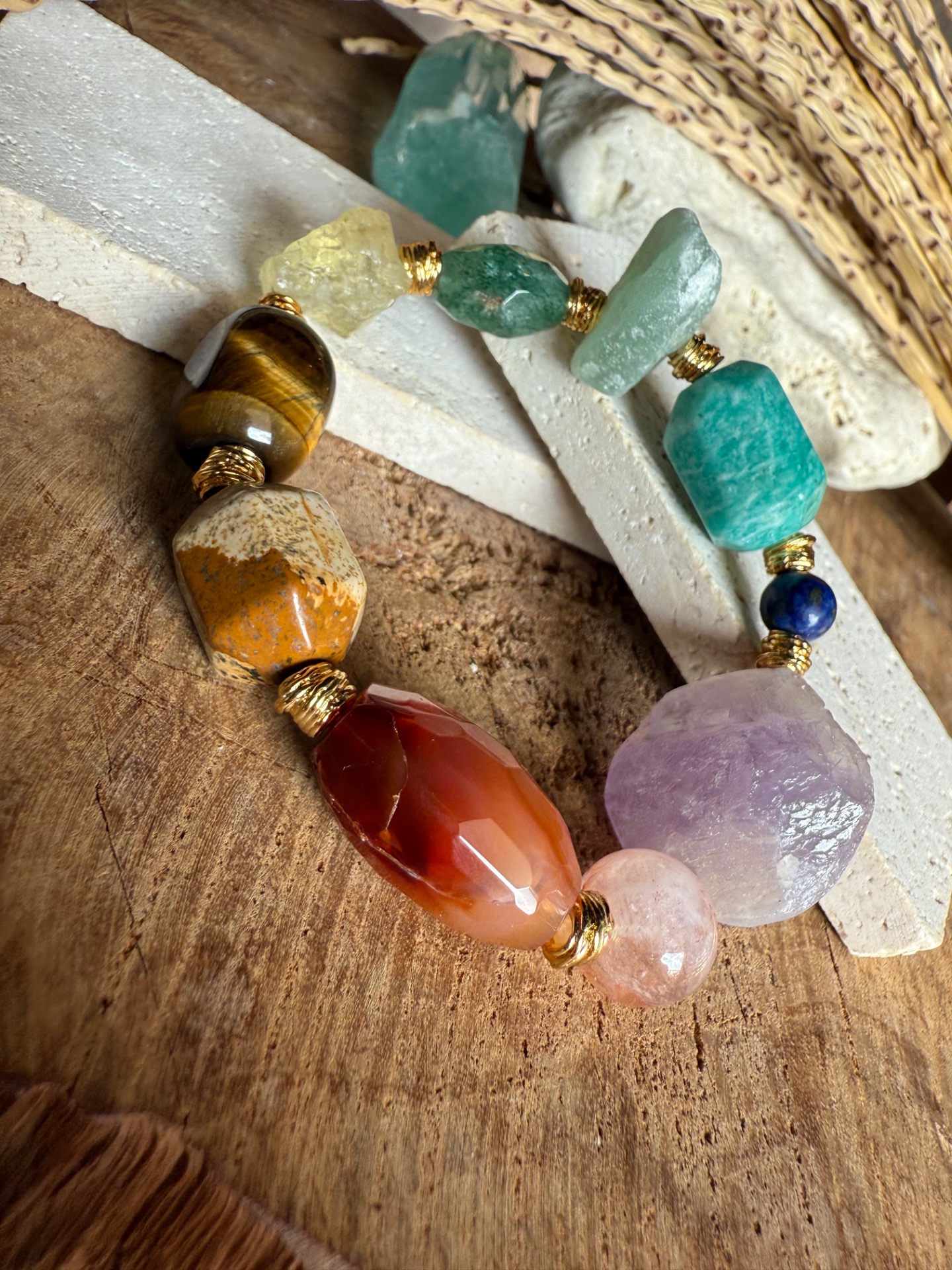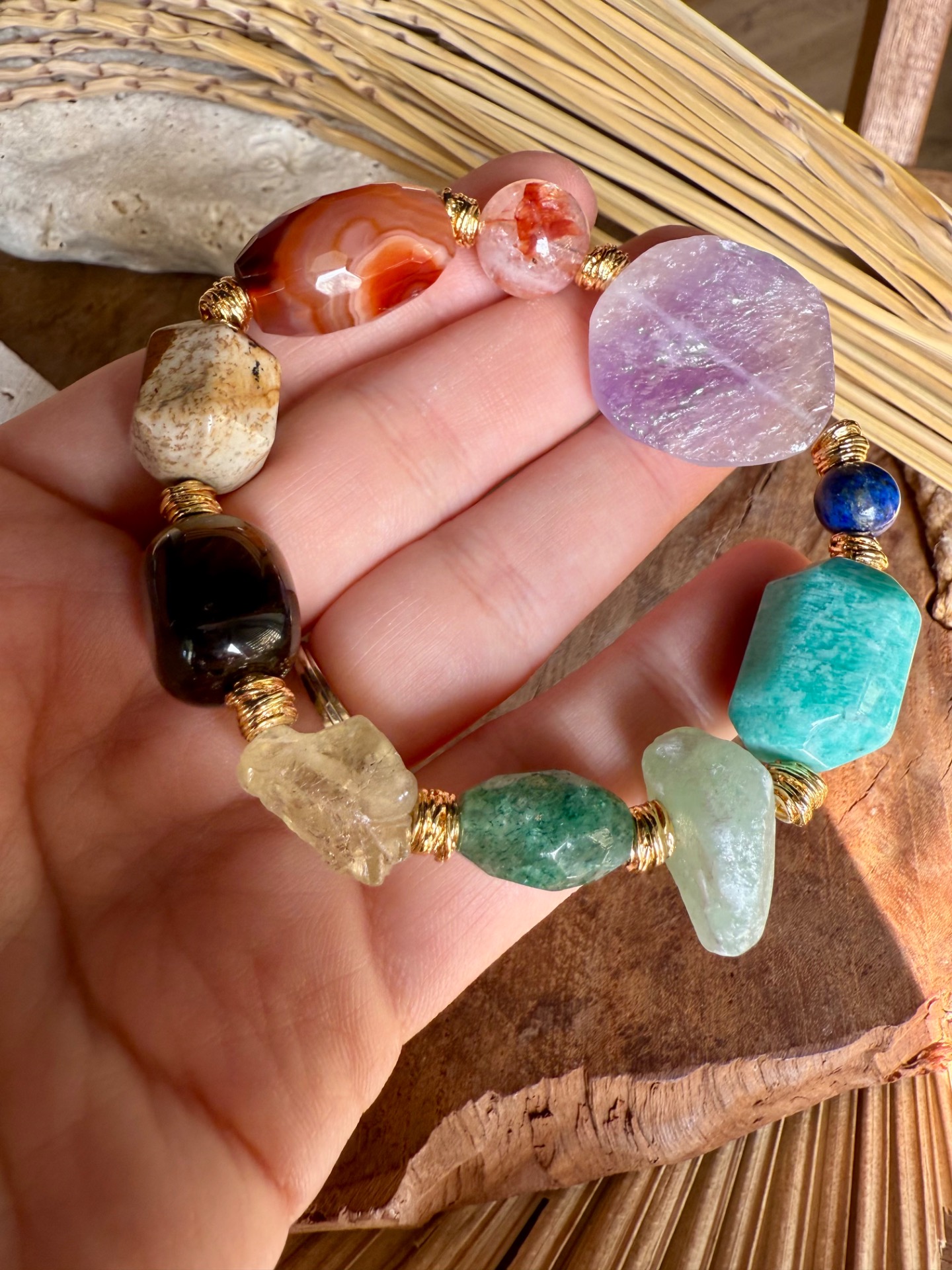 Každý náramok je originál – kamene sa líšia tvarom, kresbou aj odtieňom, čo robí každý kus jedinečným malým umeleckým dielom prírody. Zlaté detaily zvýrazňujú prirodzenú krásu minerálov a dodávajú šperku jemnú boho eleganciu.