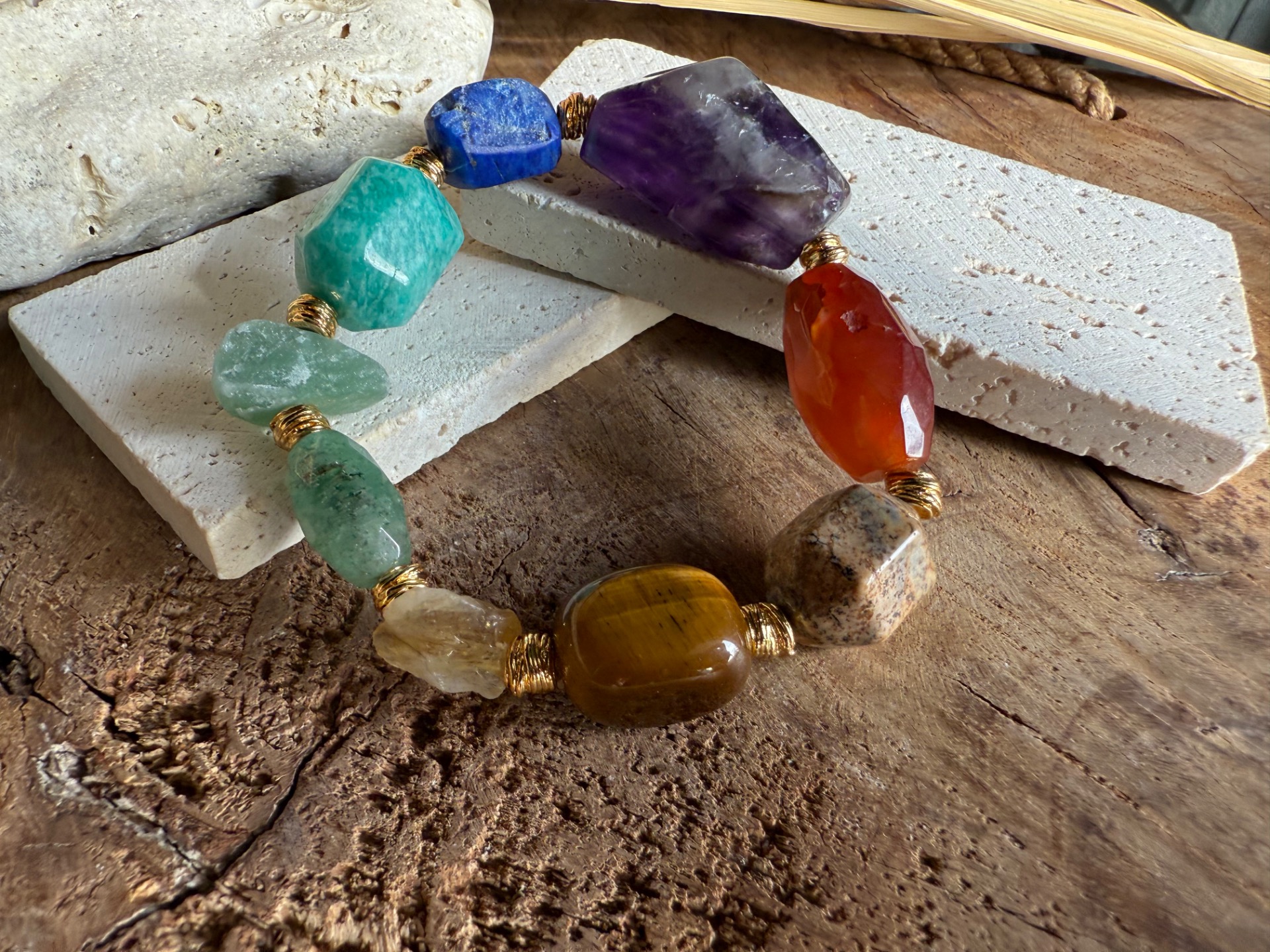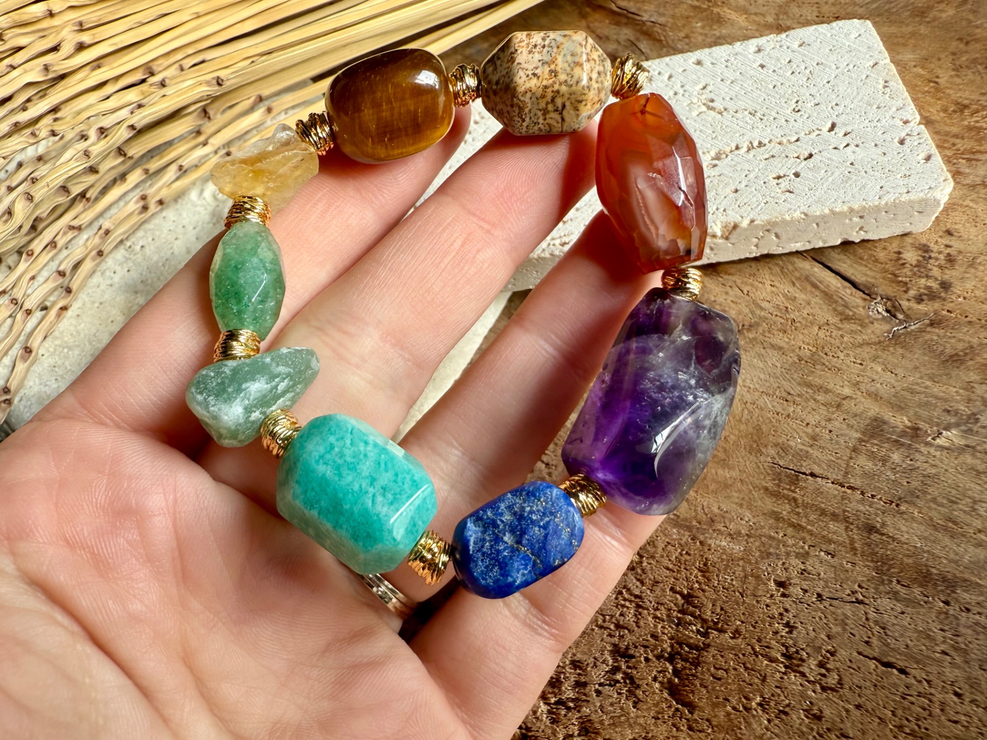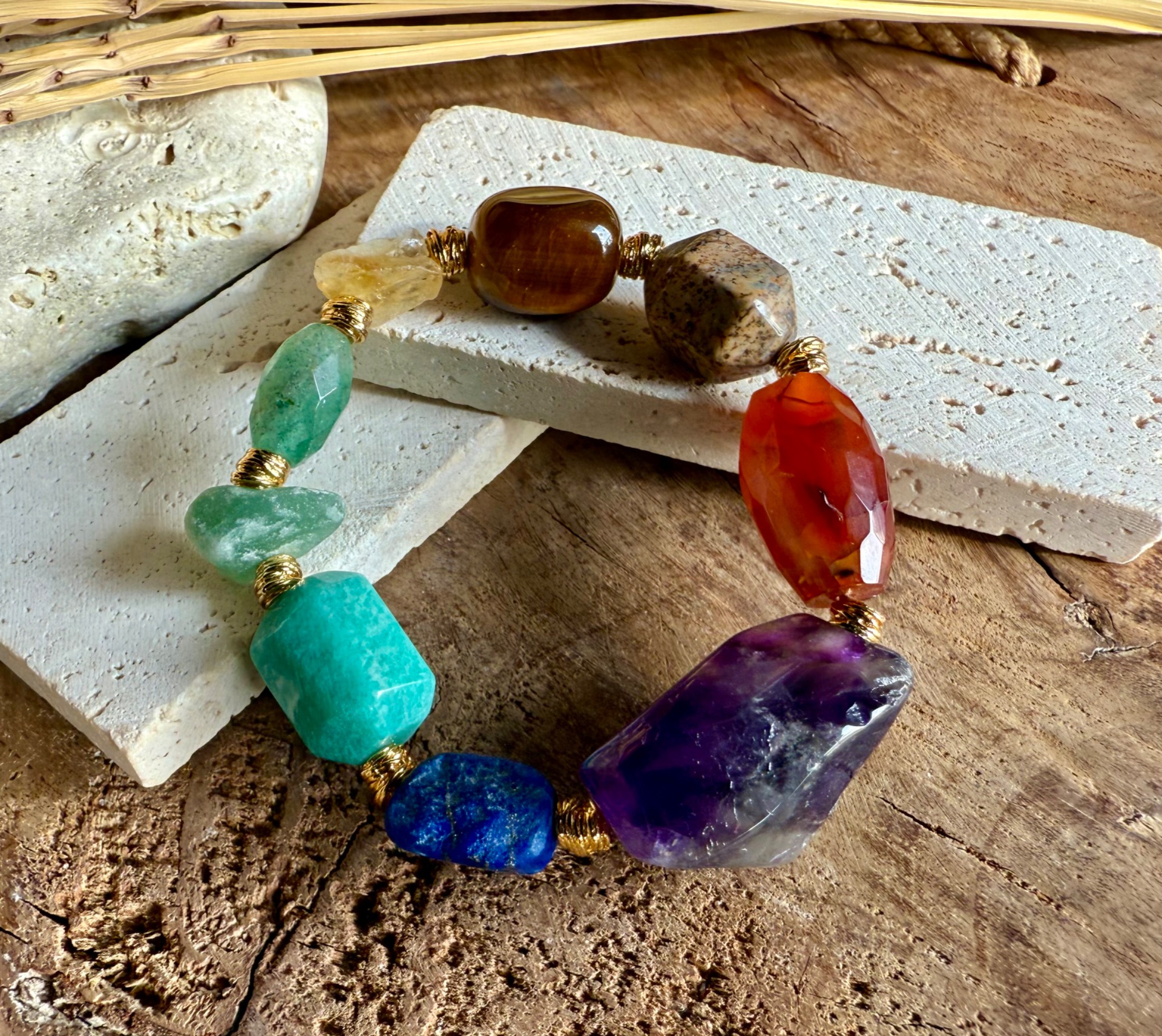 Každý náramok je originál – kamene sa líšia tvarom, kresbou aj odtieňom, čo robí každý kus jedinečným malým umeleckým dielom prírody. Zlaté detaily zvýrazňujú prirodzenú krásu minerálov a dodávajú šperku jemnú boho eleganciu.
