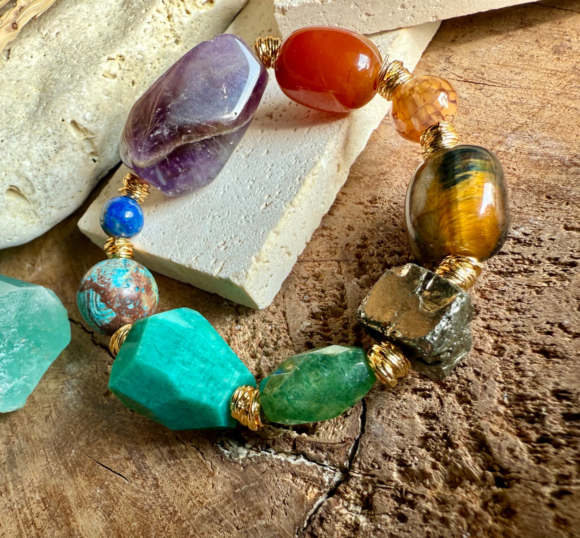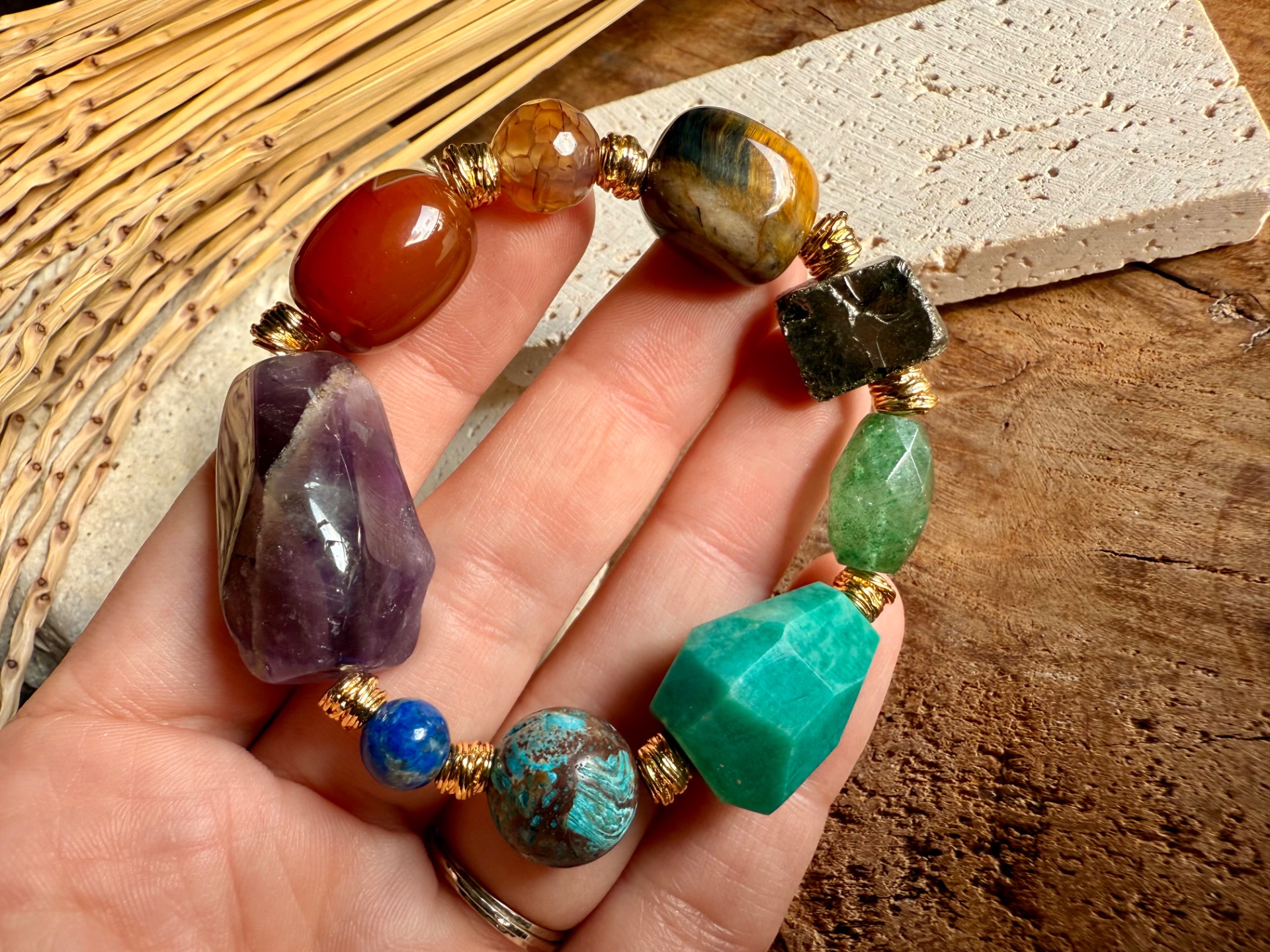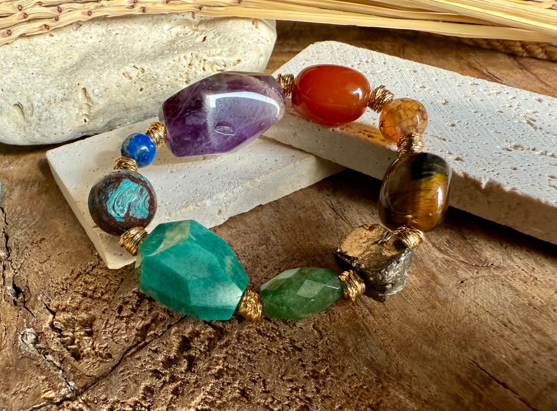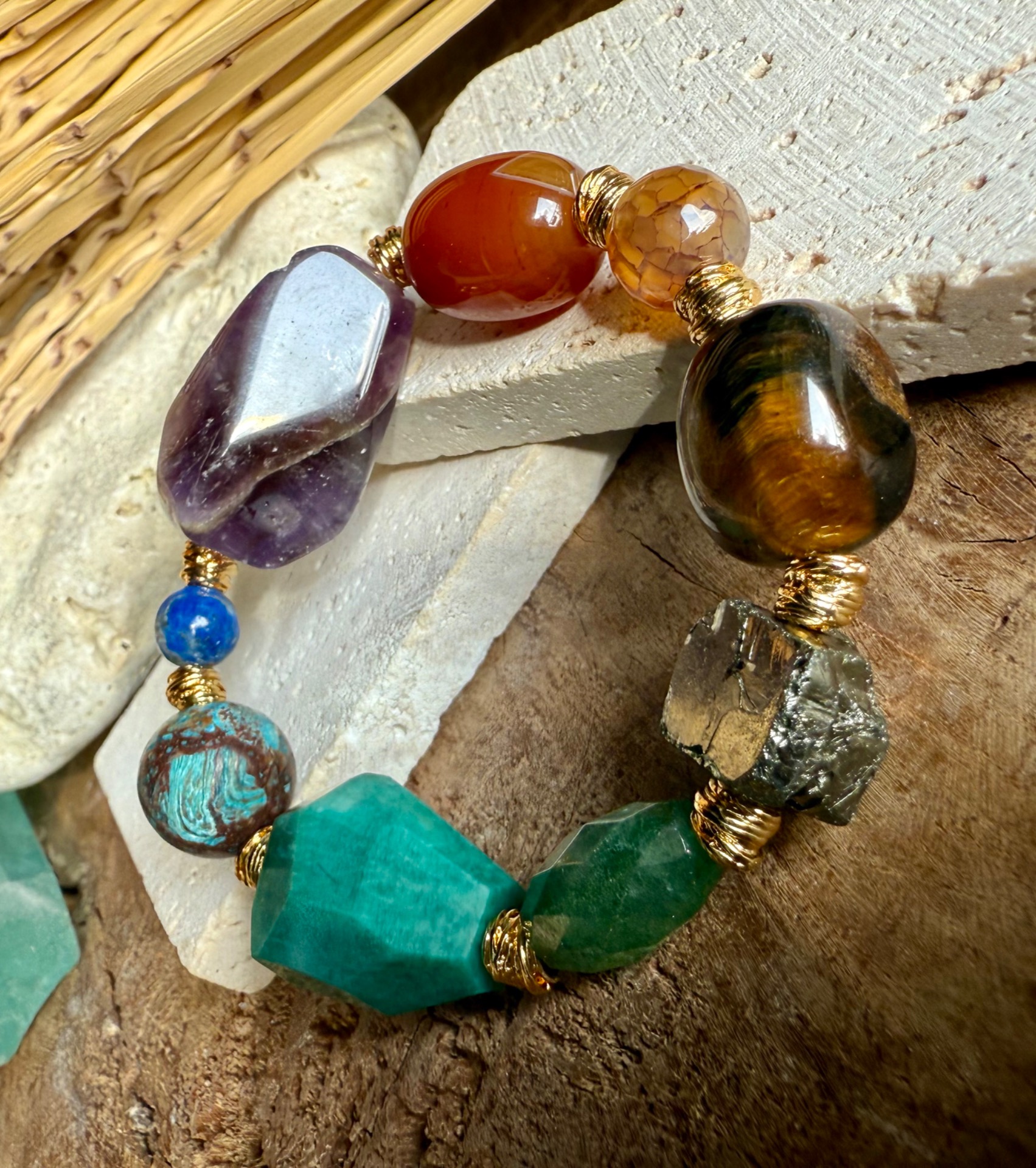 Každý náramok je originál – kamene sa líšia tvarom, kresbou aj odtieňom, čo robí každý kus jedinečným malým umeleckým dielom prírody. Zlaté detaily zvýrazňujú prirodzenú krásu minerálov a dodávajú šperku jemnú boho eleganciu.