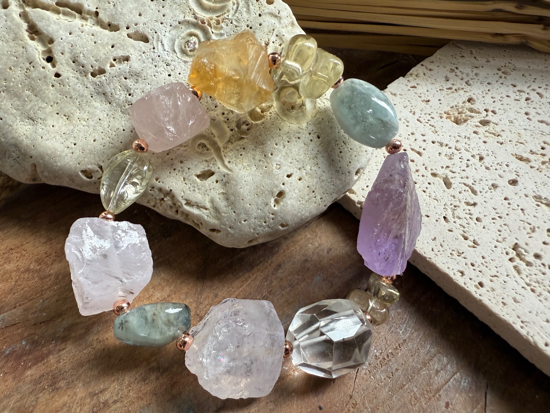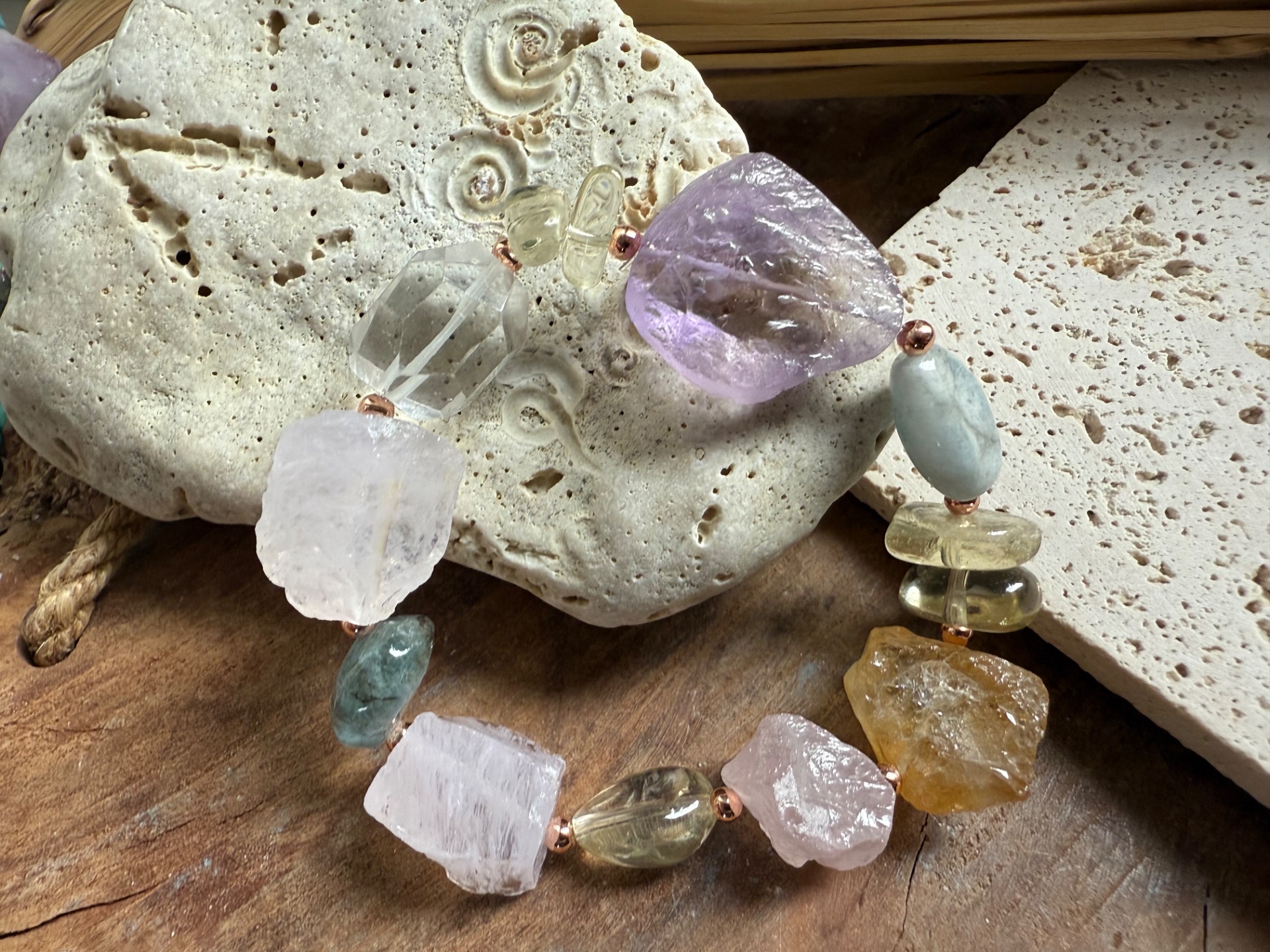 Obsahuje veľký ametyst, fazetovaný krištáľ, surový krištál, surový ruženín, surový citrín, aquamarín, nugety a citrónový kremeň – každý kameň má svoj jedinečný tvar, farbu a energiu.