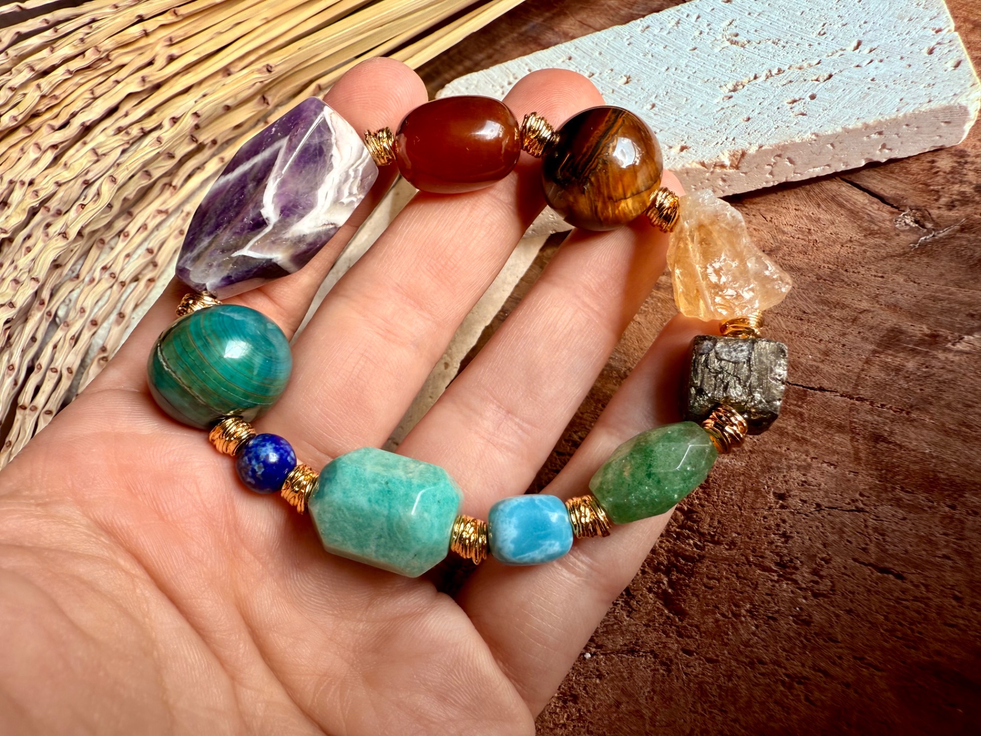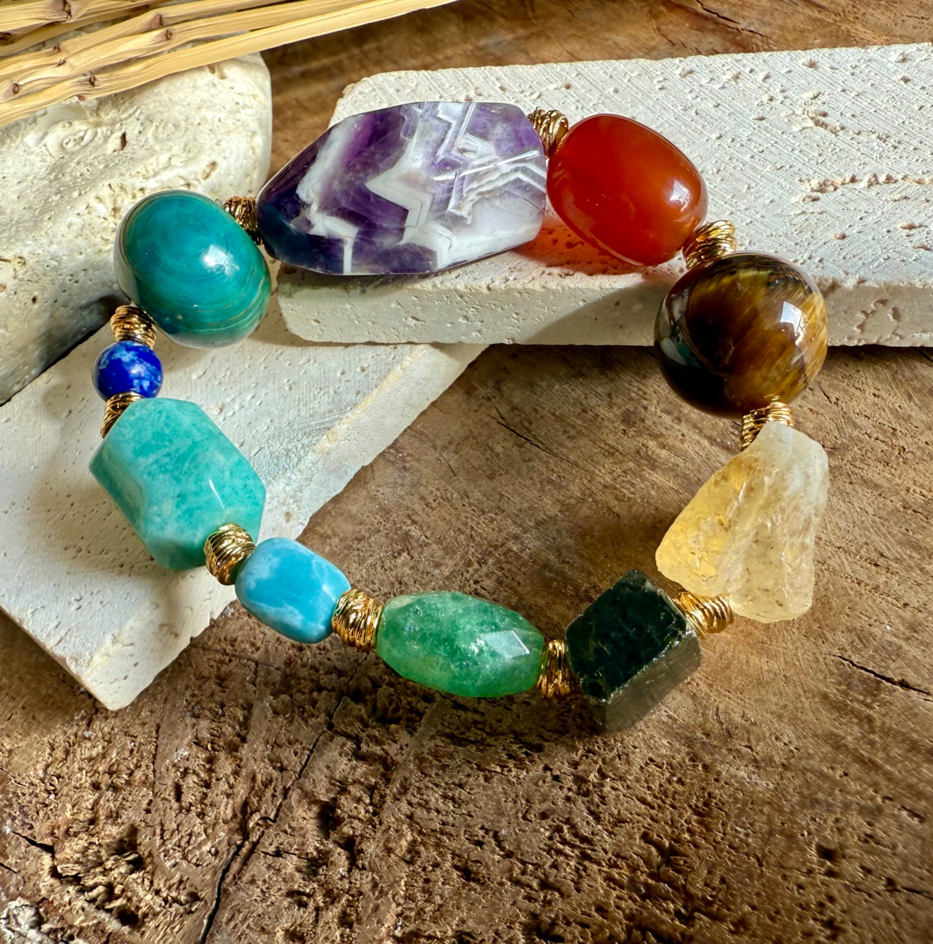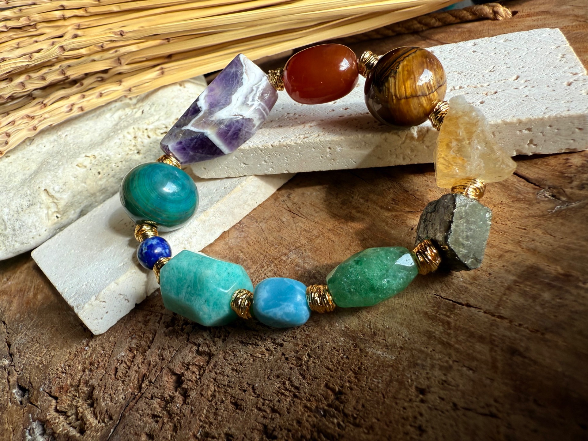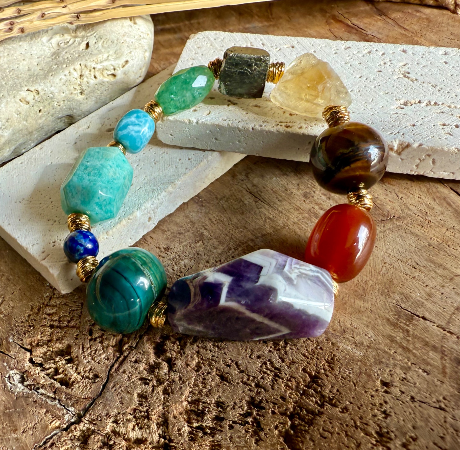Jedinečný boho náramok vytvorený z pestrej kombinácie prírodných minerálov v rôznych tvaroch a farbách. Hravé cik-cak radenie kameňov symbolizuje rozmanitosť života – jeho rytmus, zmeny a krásu, ktorá vzniká z kontrastov.