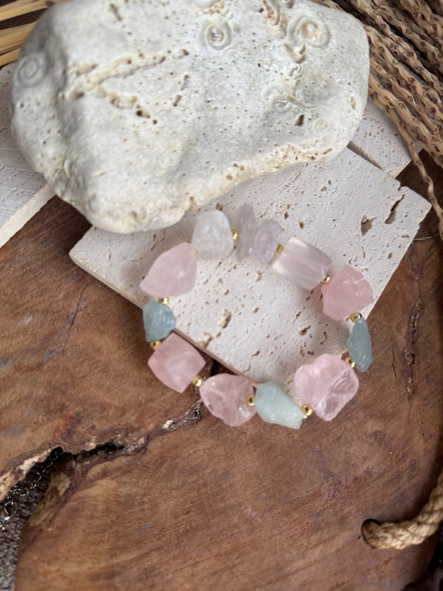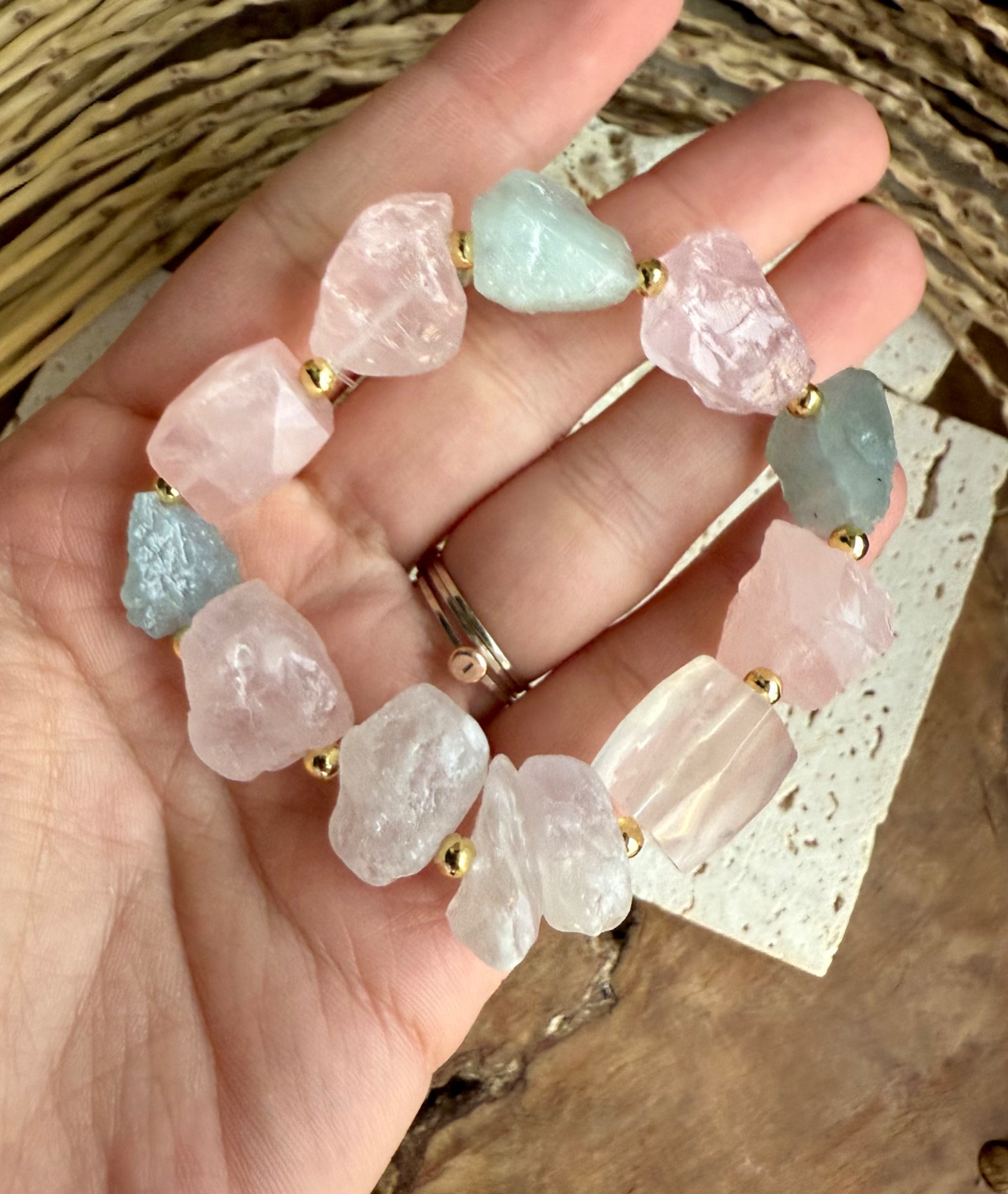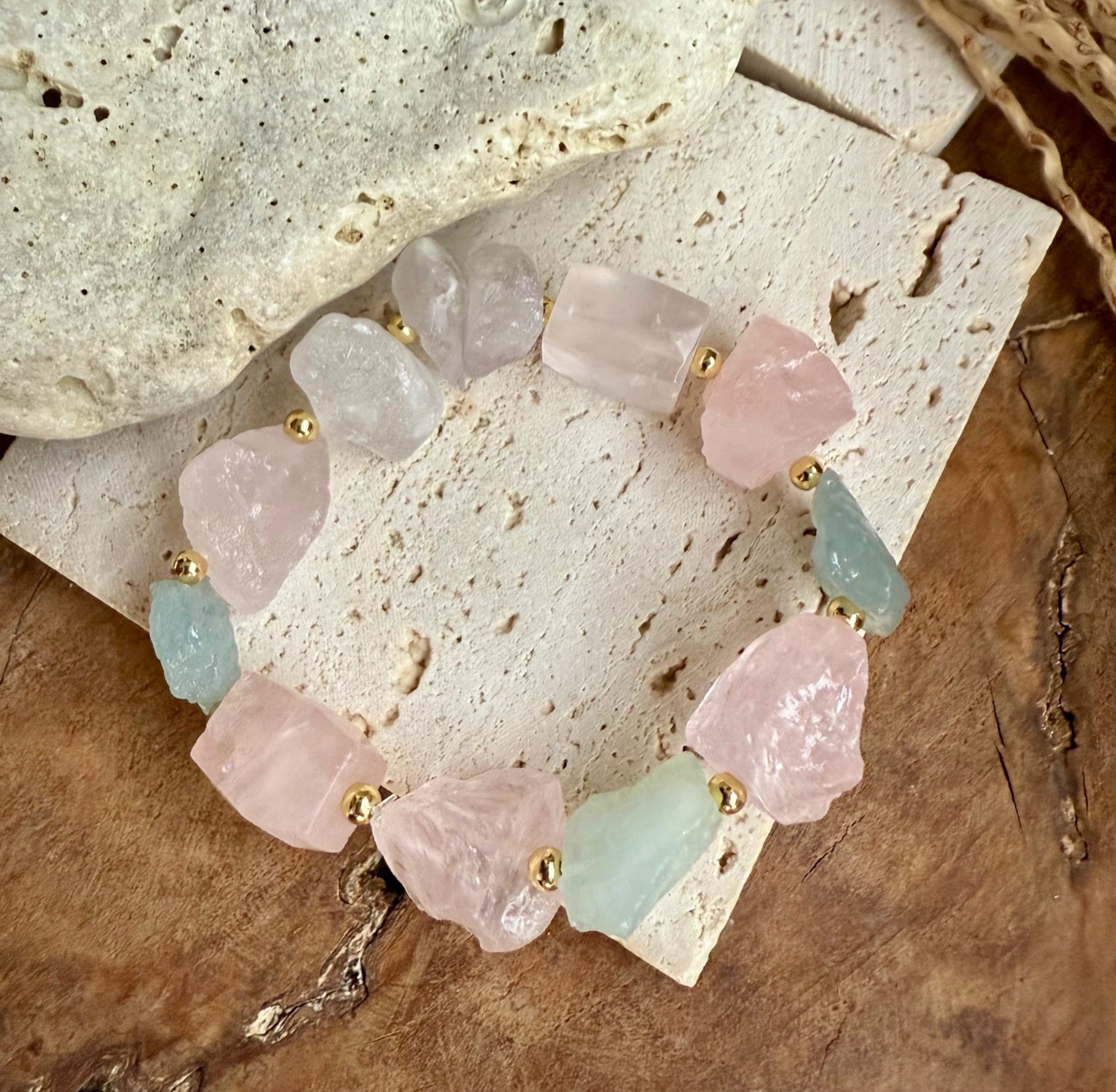Spojenie týchto minerálov prináša harmóniu medzi srdcom, mysľou a vnútorným pokojom – jemnosť ruženínu, čistotu krištáľu a ľahkosť akvamarínu.
