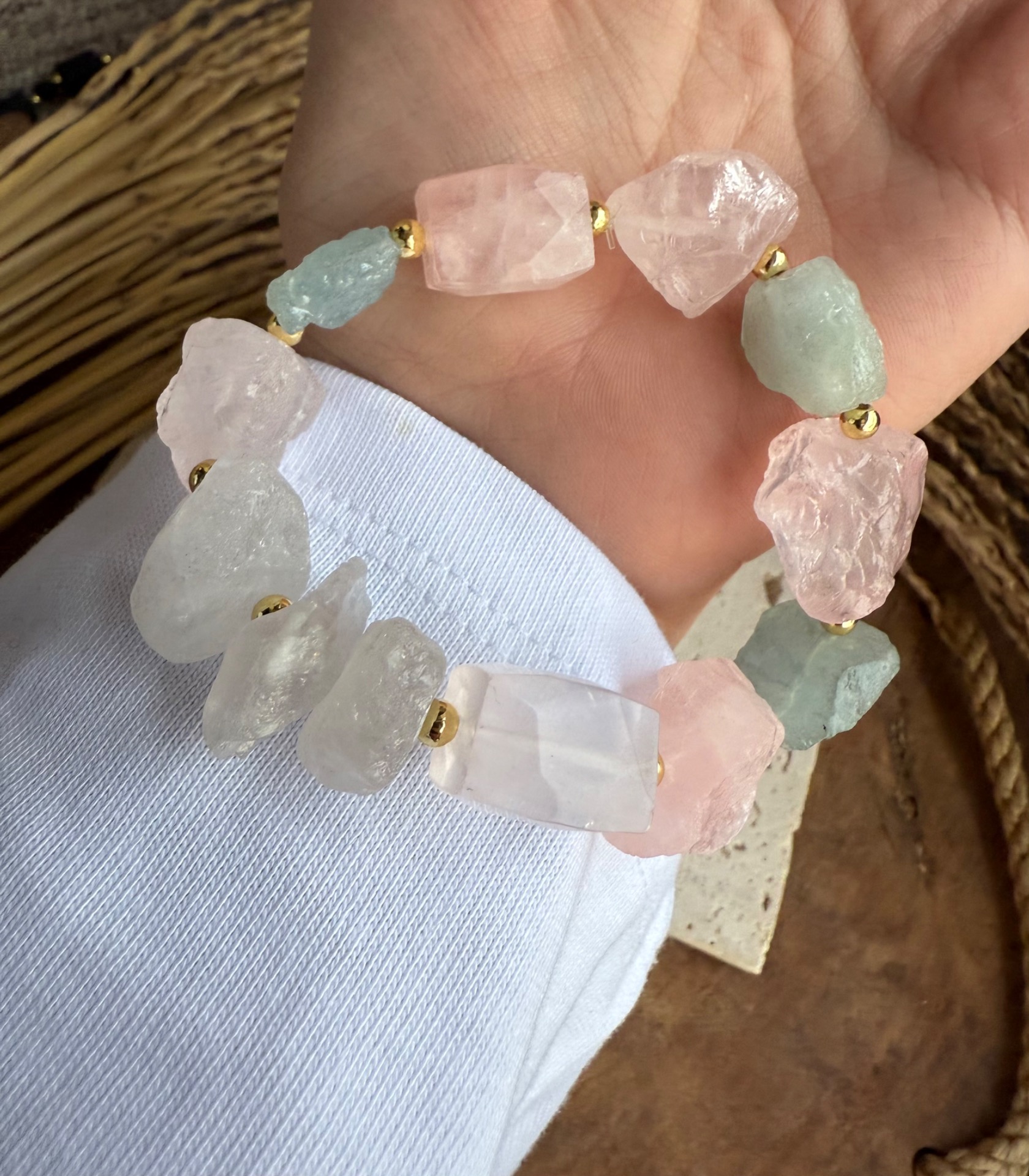 Tento cik-cak boho náramok zo surových, neopracovaných minerálov je oslavou prirodzenej krásy Zeme v jej najautentickejšej podobe. Veľké surové kusy krištáľu, ruženínu a akvamarínu si zachovávajú svoju pôvodnú štruktúru, energiu a jedinečný charakter – každý kameň rozpráva vlastný príbeh.
