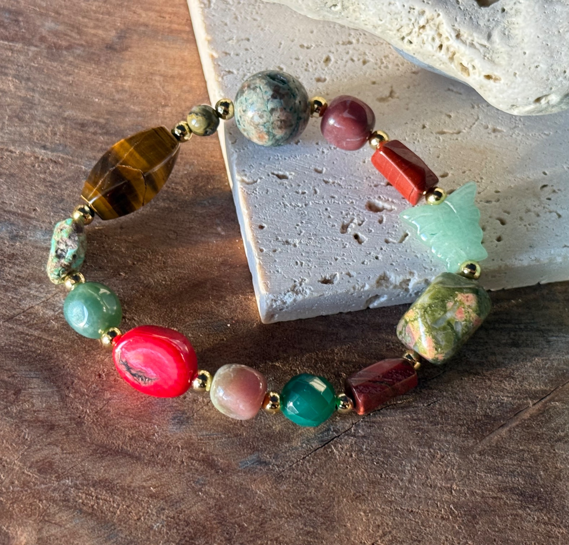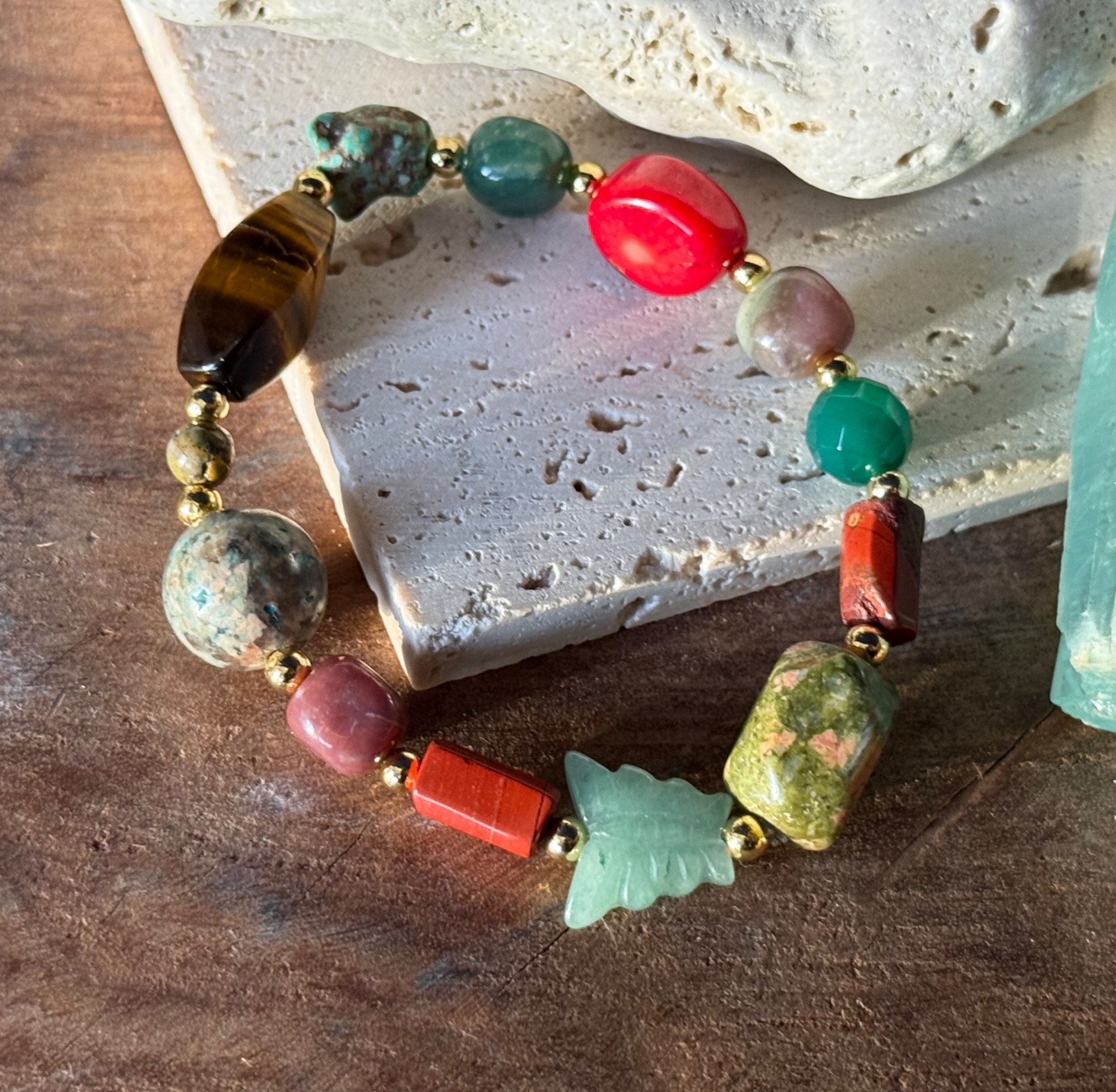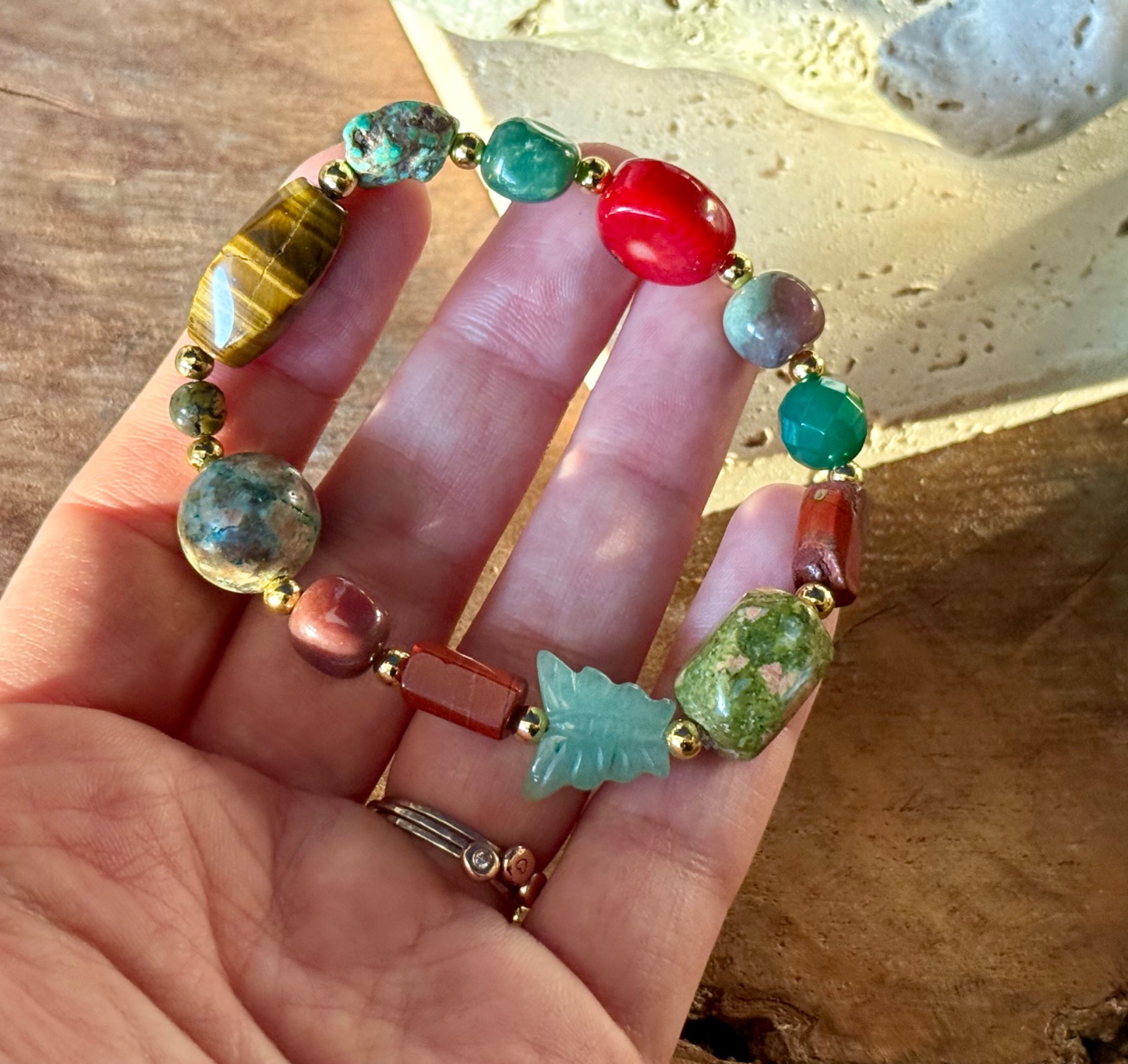 Každý kameň je starostlivo vybraný, aby vytváral harmonický mix farieb a energií Zeme. Náramok je ideálny pre každodenné nosenie alebo ako energetický talizman, ktorý prináša vnútornú rovnováhu, vitalitu a spojenie s prírodou.