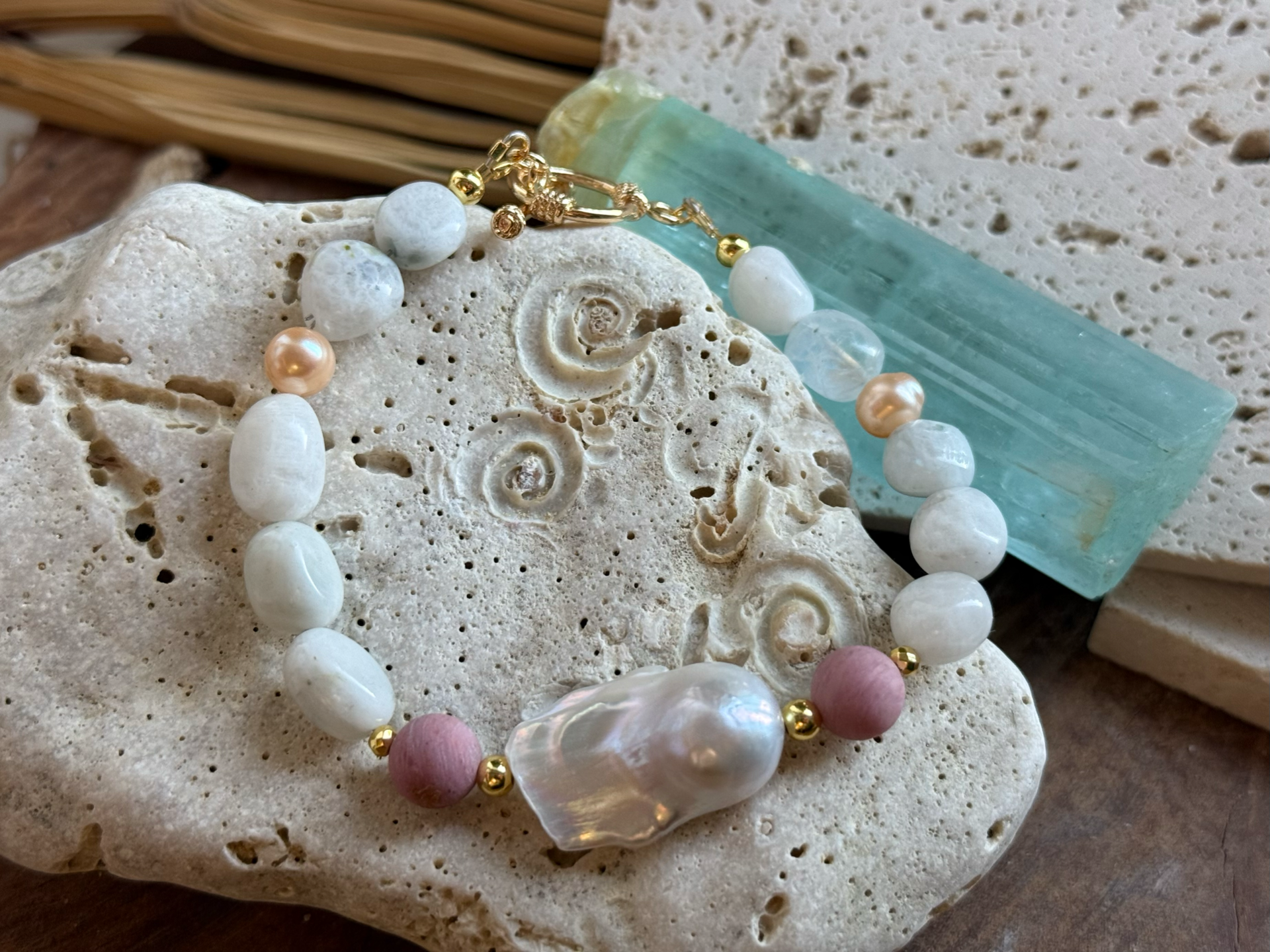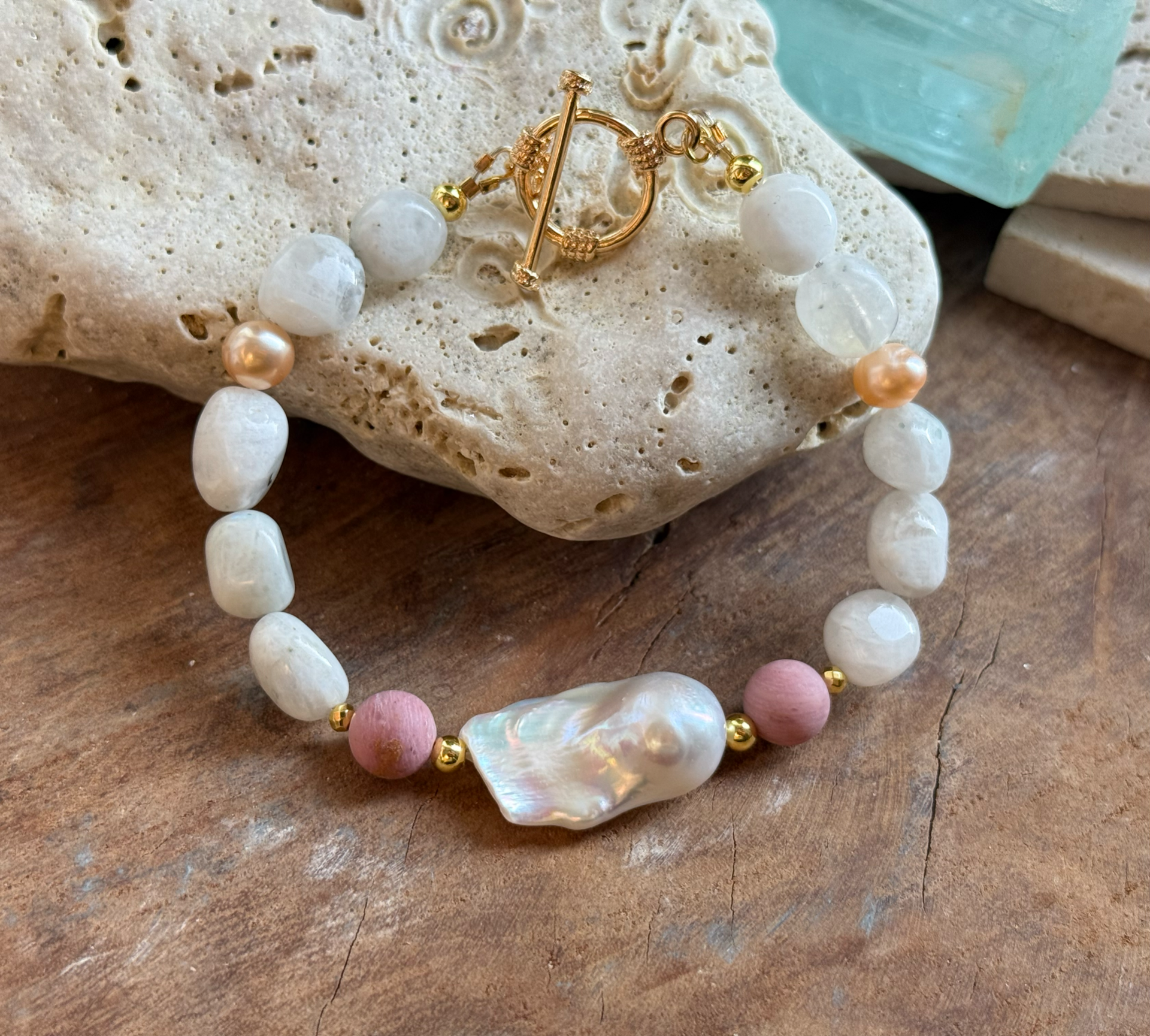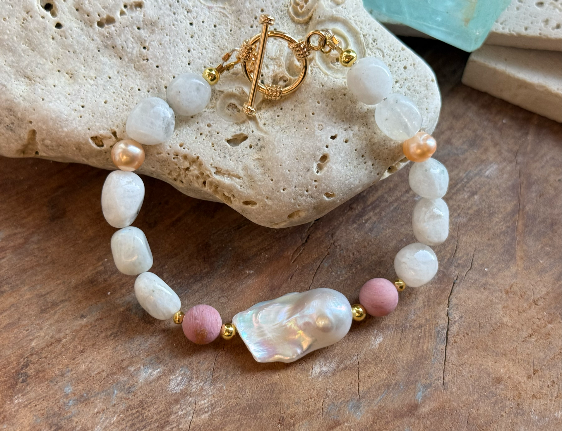 Náramok z barokovej perly, mesačného kameňa, rodonitu a marhuľových perál – Nežná láska