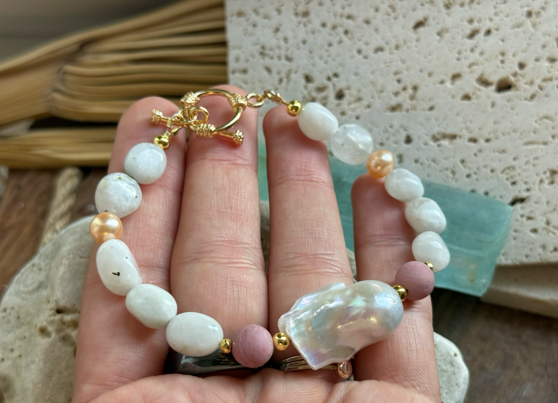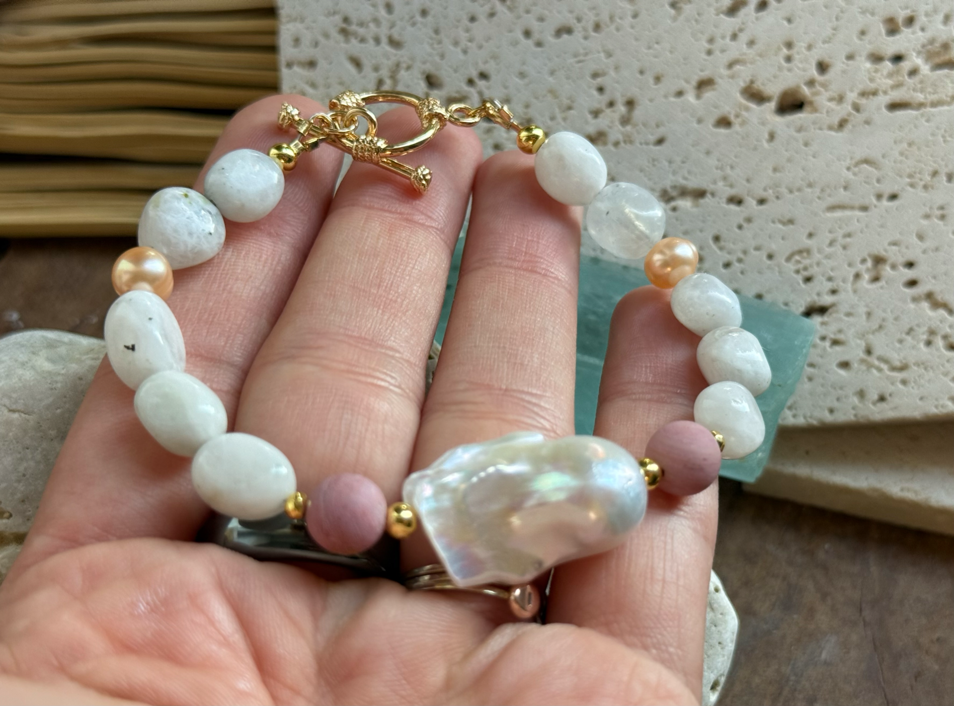 Jemný a ženský náramok, ktorý spája eleganciu s hlbokou energiou lásky a nežnosti. Hlavnou dominantou je veľká baroková perla, doplnená o nugety mesačného kameňa, rodonitu a dve marhuľové perly, ktoré vytvárajú harmonický a romantický celok.