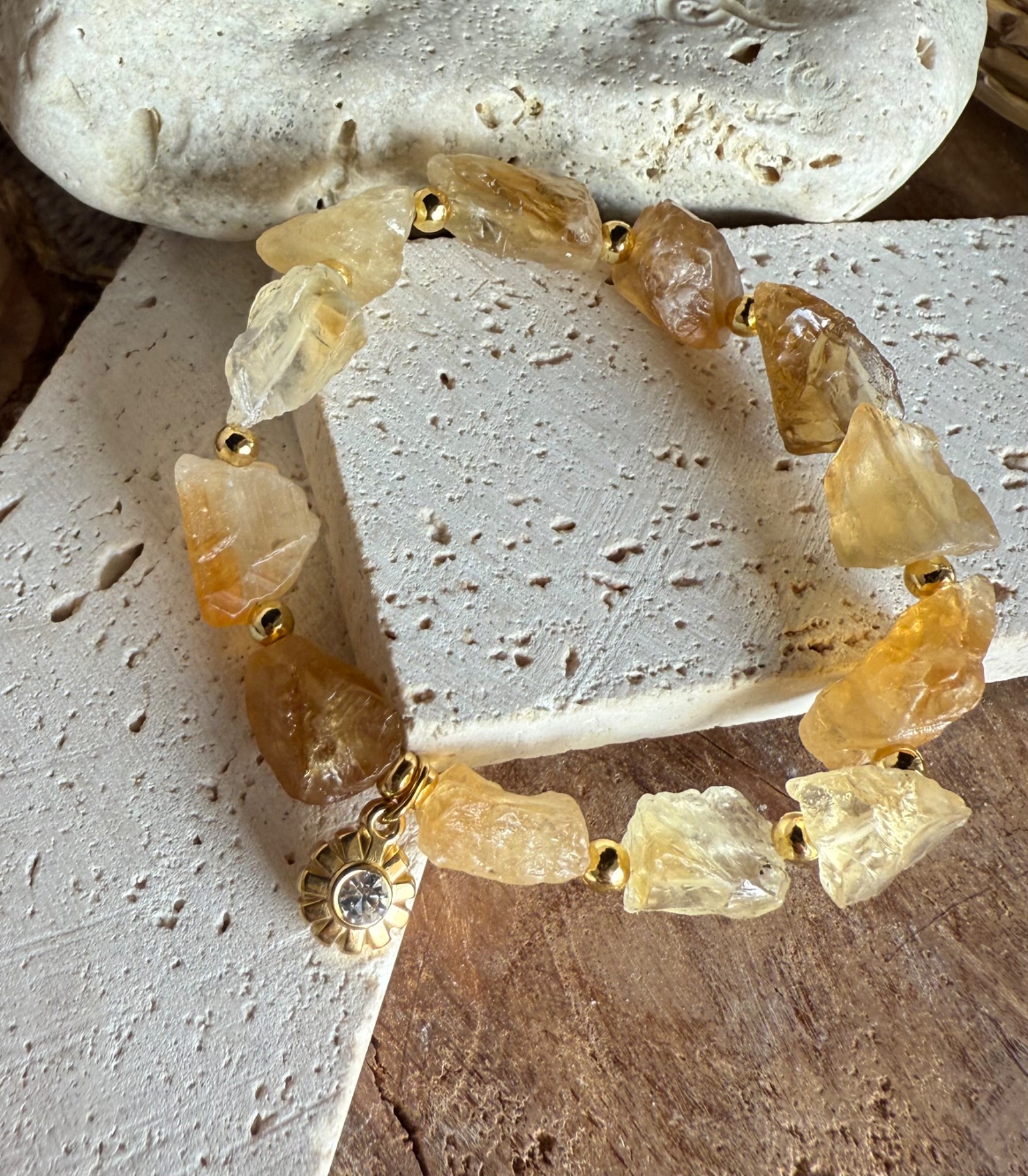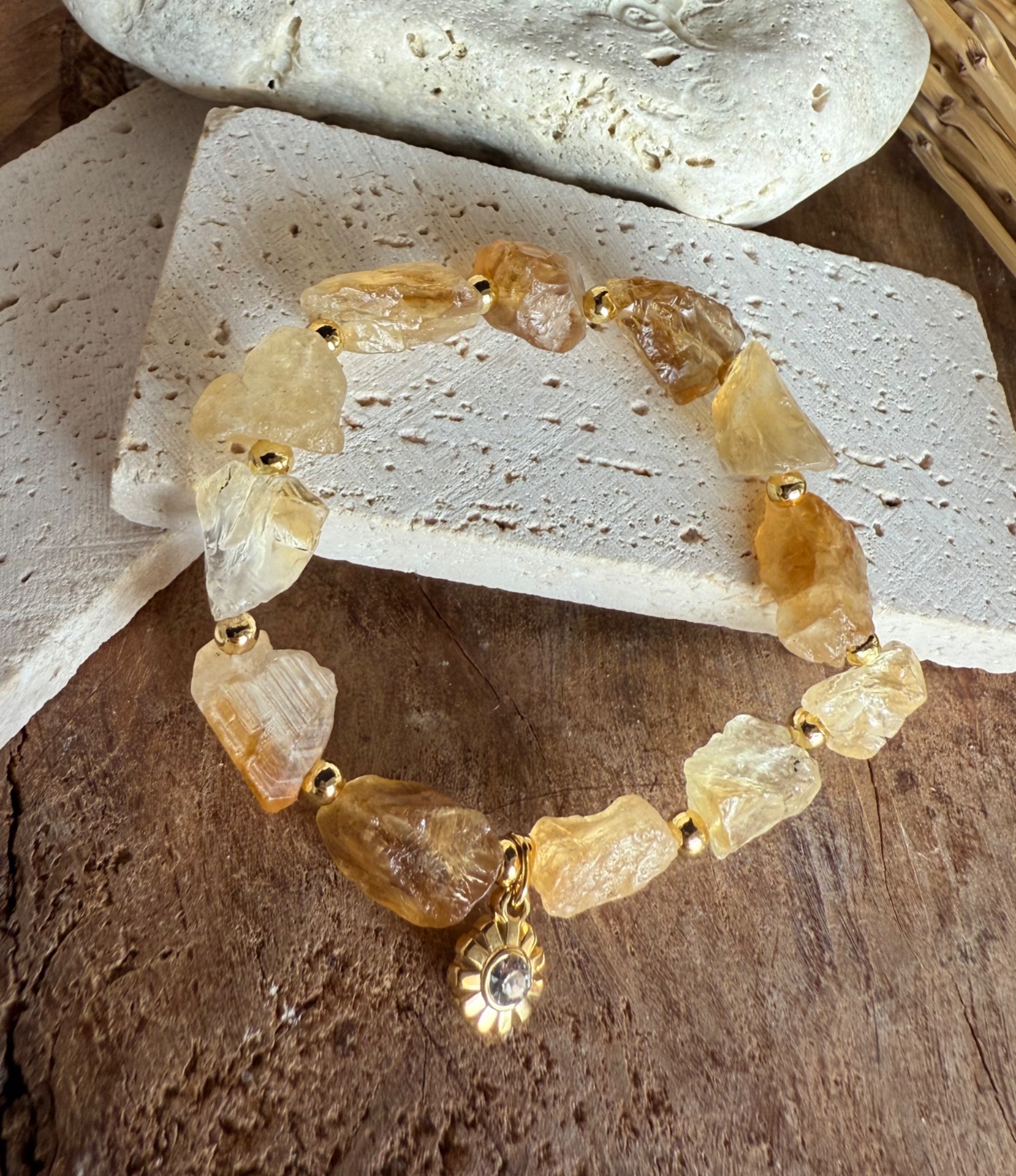 Rozžiari svoj deň s týmto jedinečným náramkom zo surového citrínu. Každý kameň je veľký, prírodný a nepravidelný, oddelený elegantnou nerezovou guličkou, čo náramku dodáva šmrnc, luxus a energiu hojnosti. Nerezový prívesok v tvare kvietku zjemňuje celkový dizajn a robí z náramku štýlový a energetický doplnok.