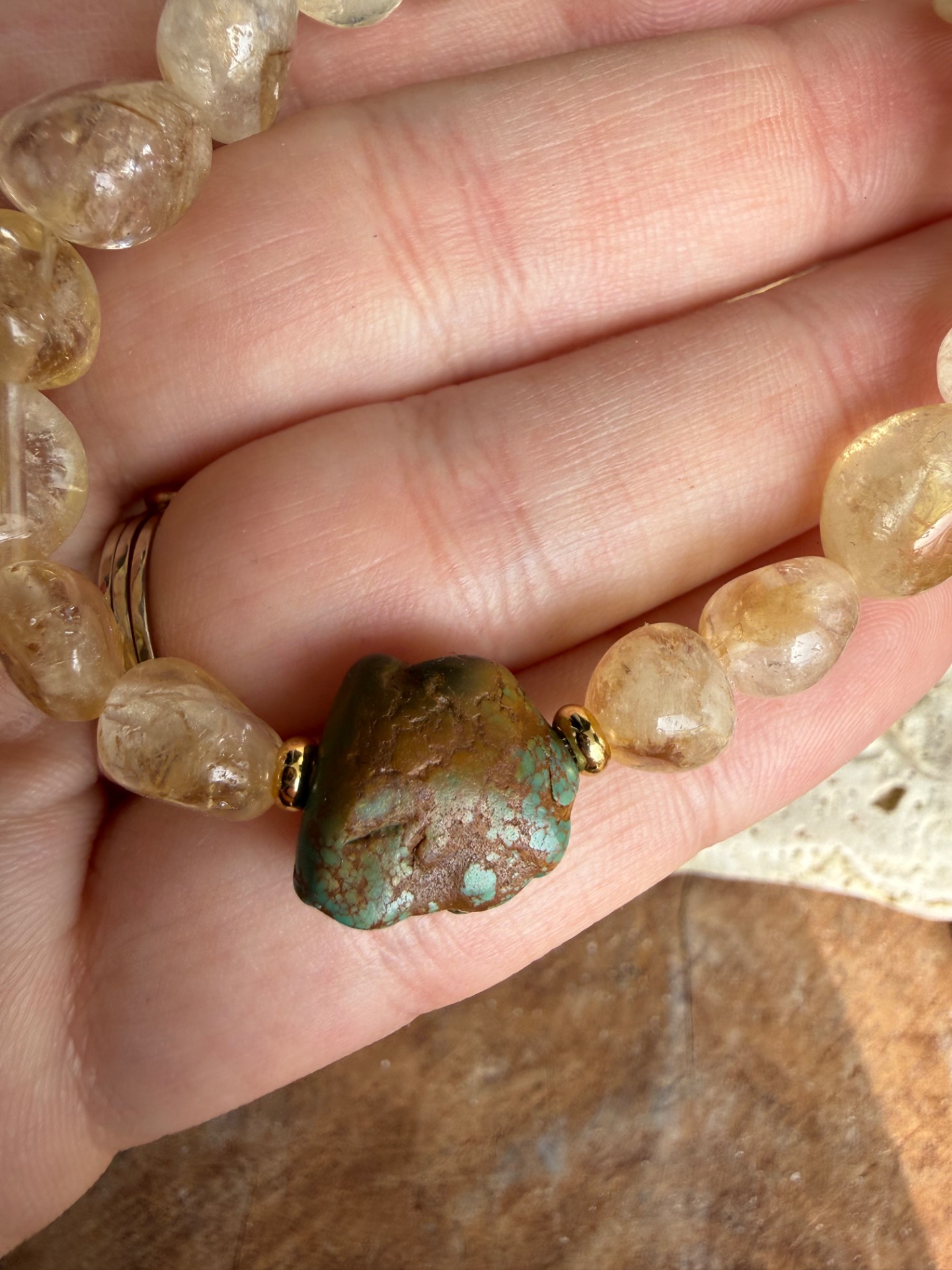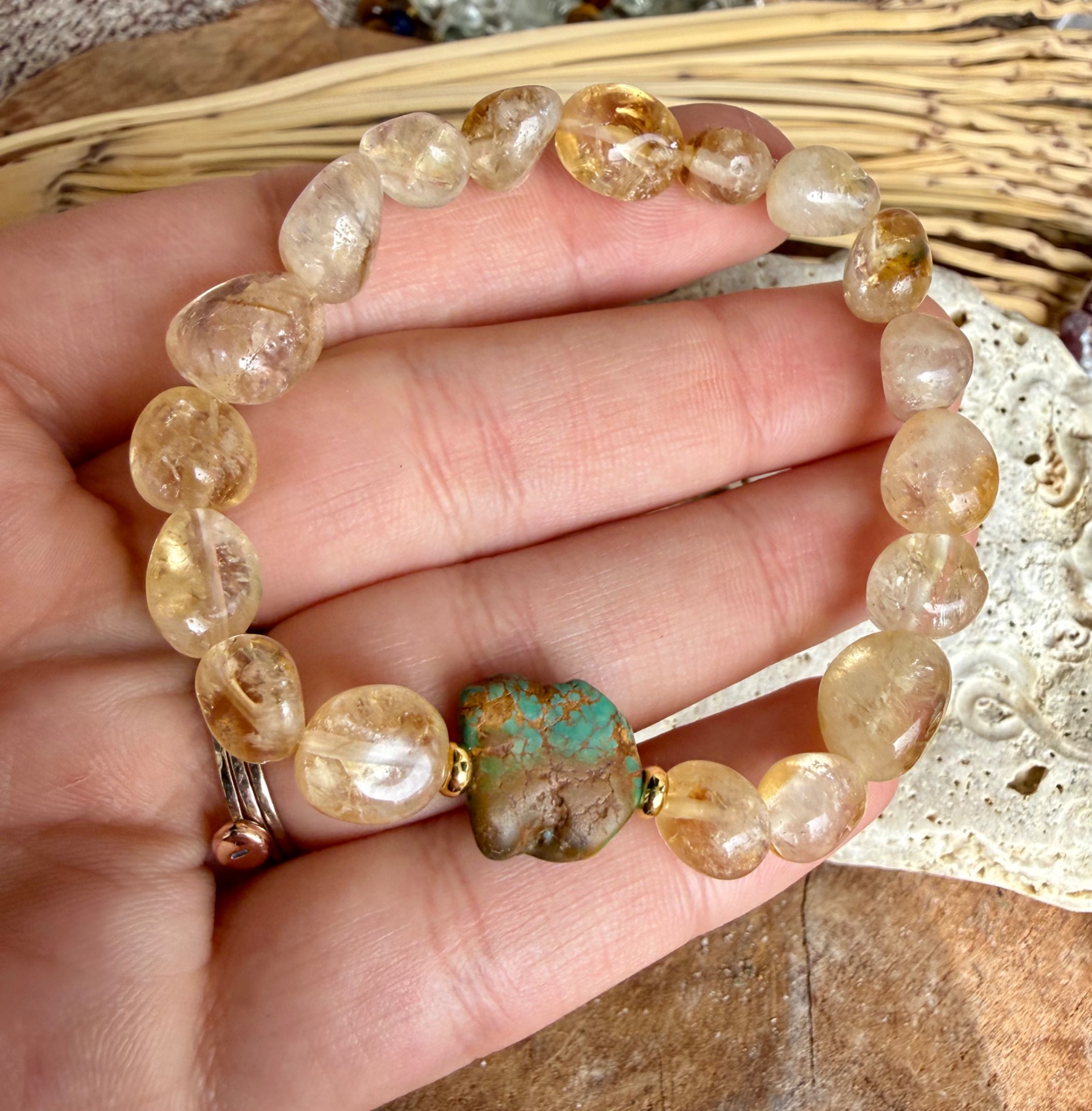 Výrazný, no zároveň svieži náramok z jemných nugiet citrínu doplnený o nepravidelné kúsky tyrkysu Hubei. Spojenie teplej slnečnej energie a ochrannej sily mora vytvára harmonický, živý šperk, ktorý okamžite pritiahne pozornosť.