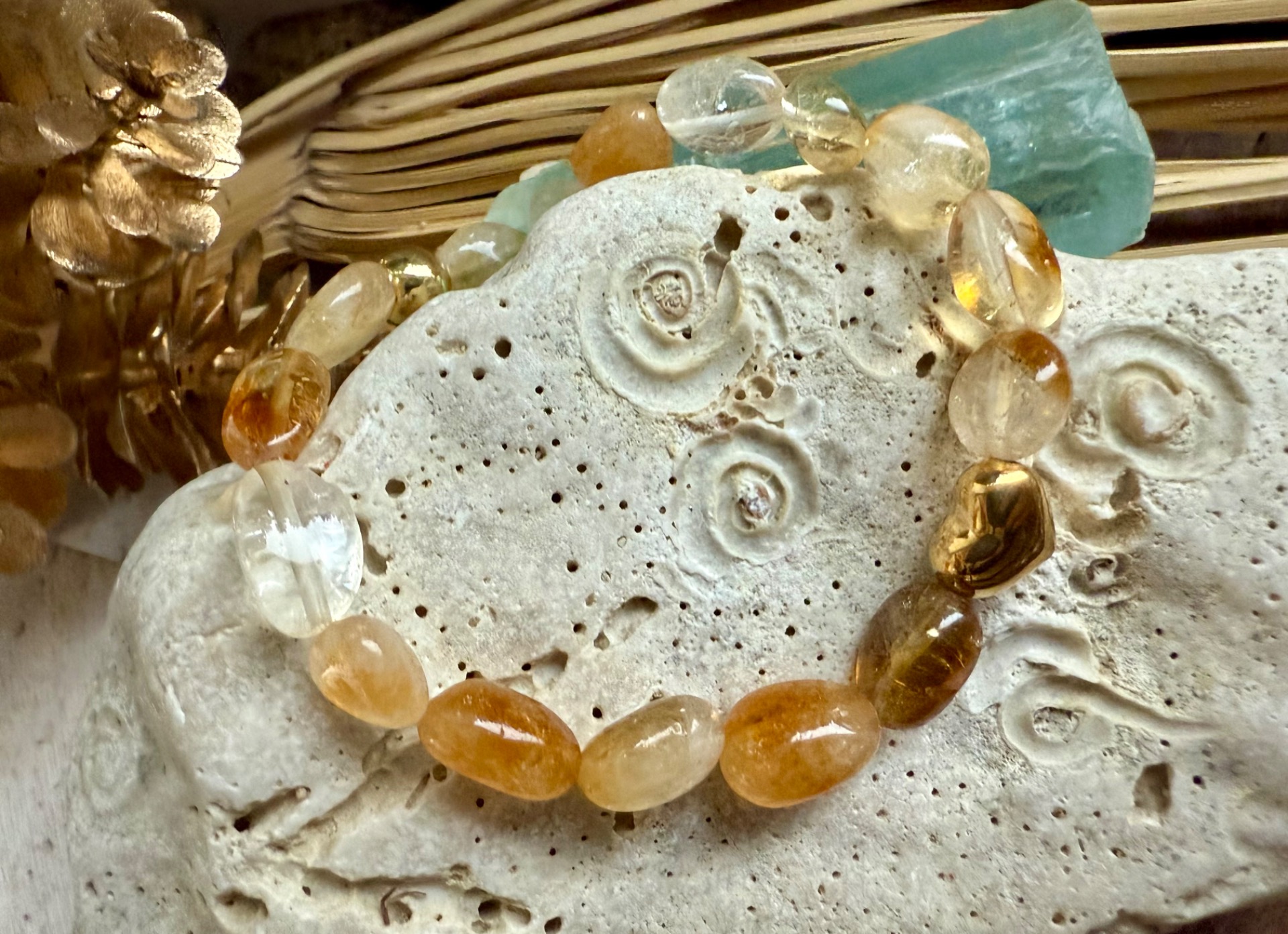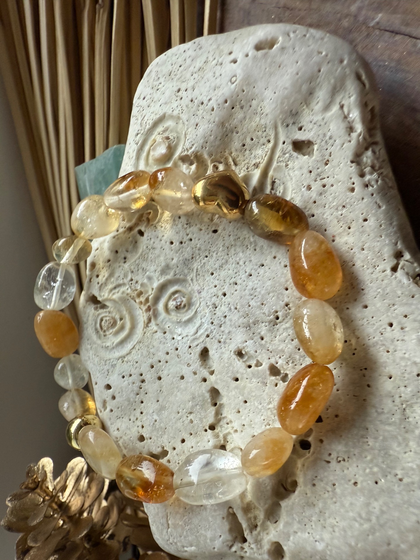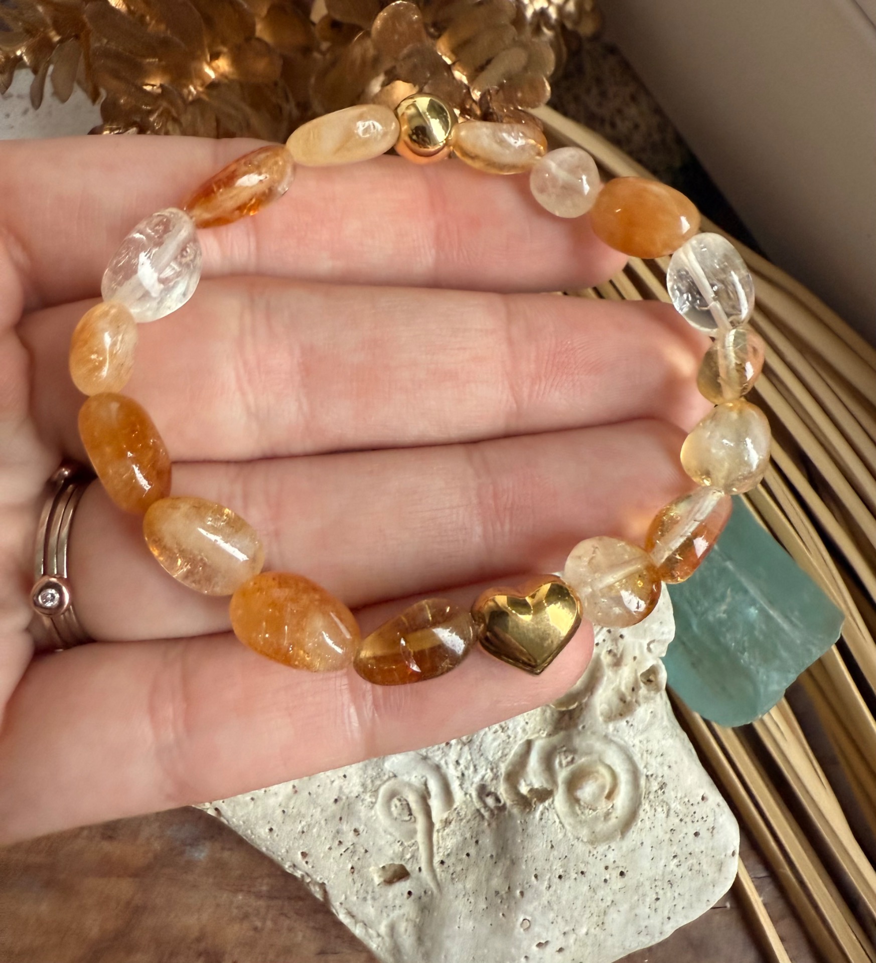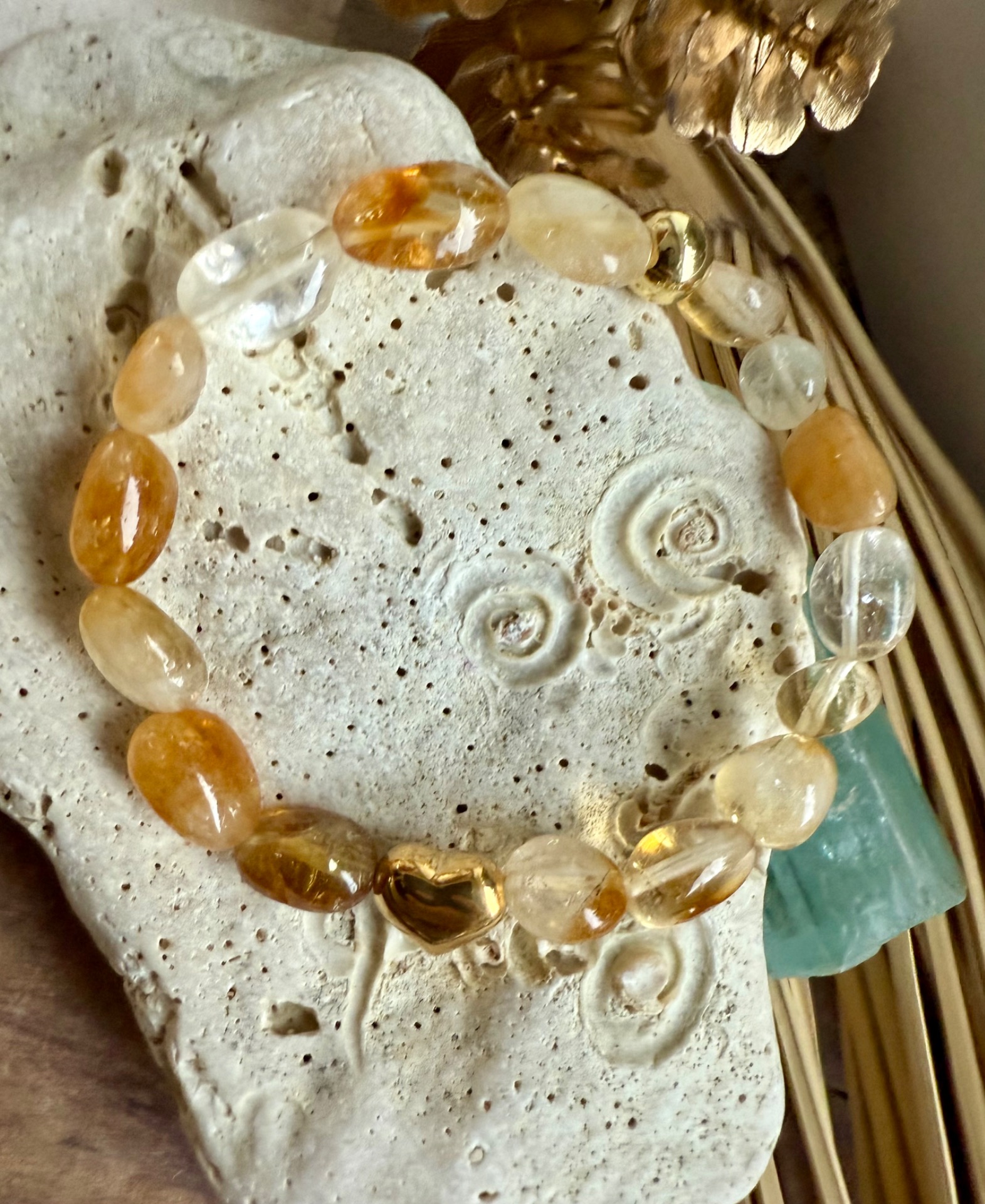 Náramok z minerálu citrín nugety nepravdidelné , doplnený nerezovým srdiečkom gold.