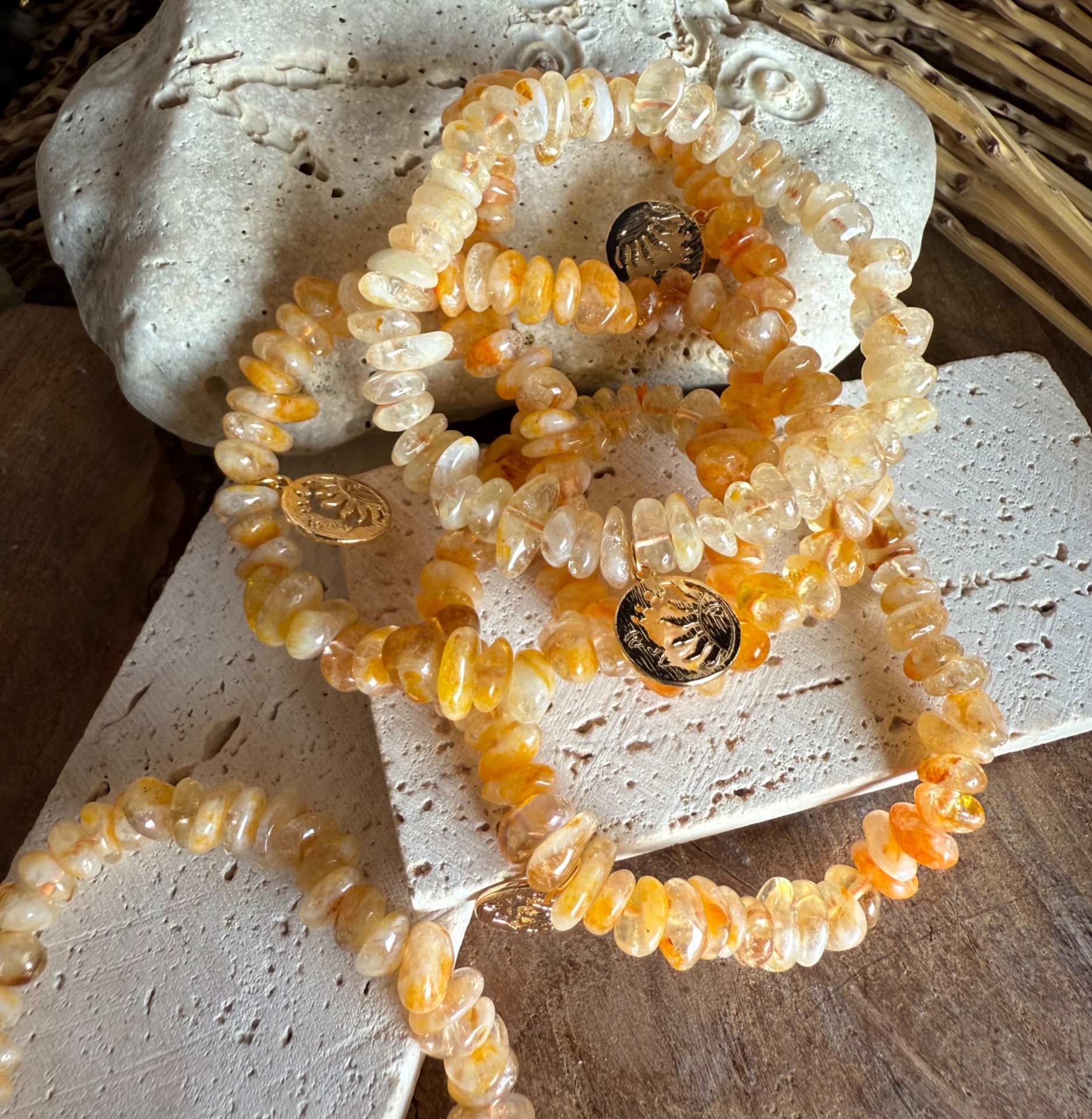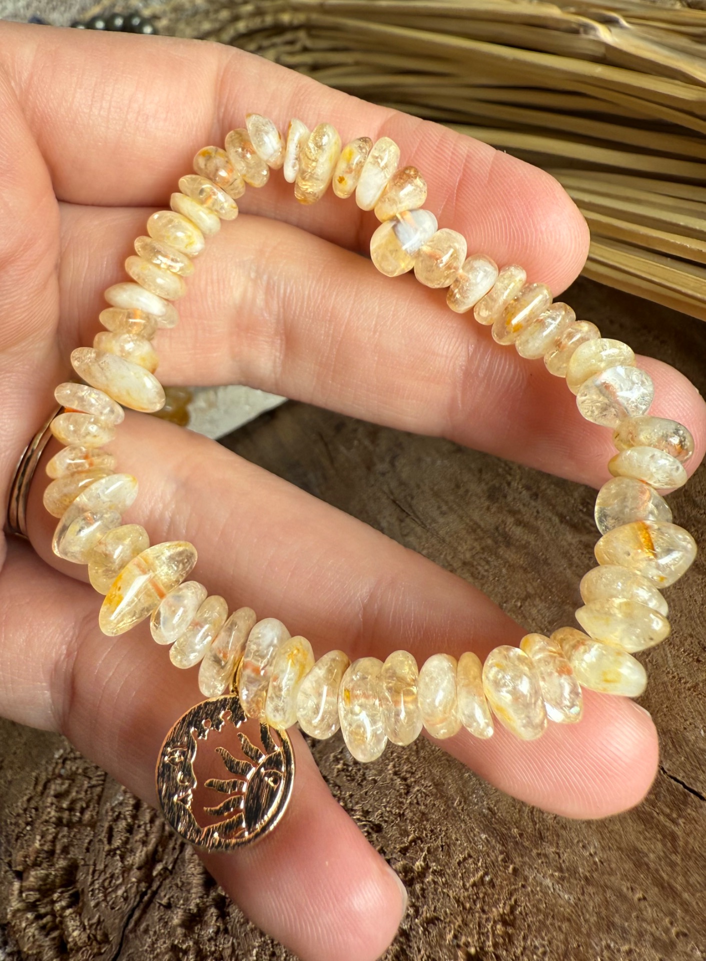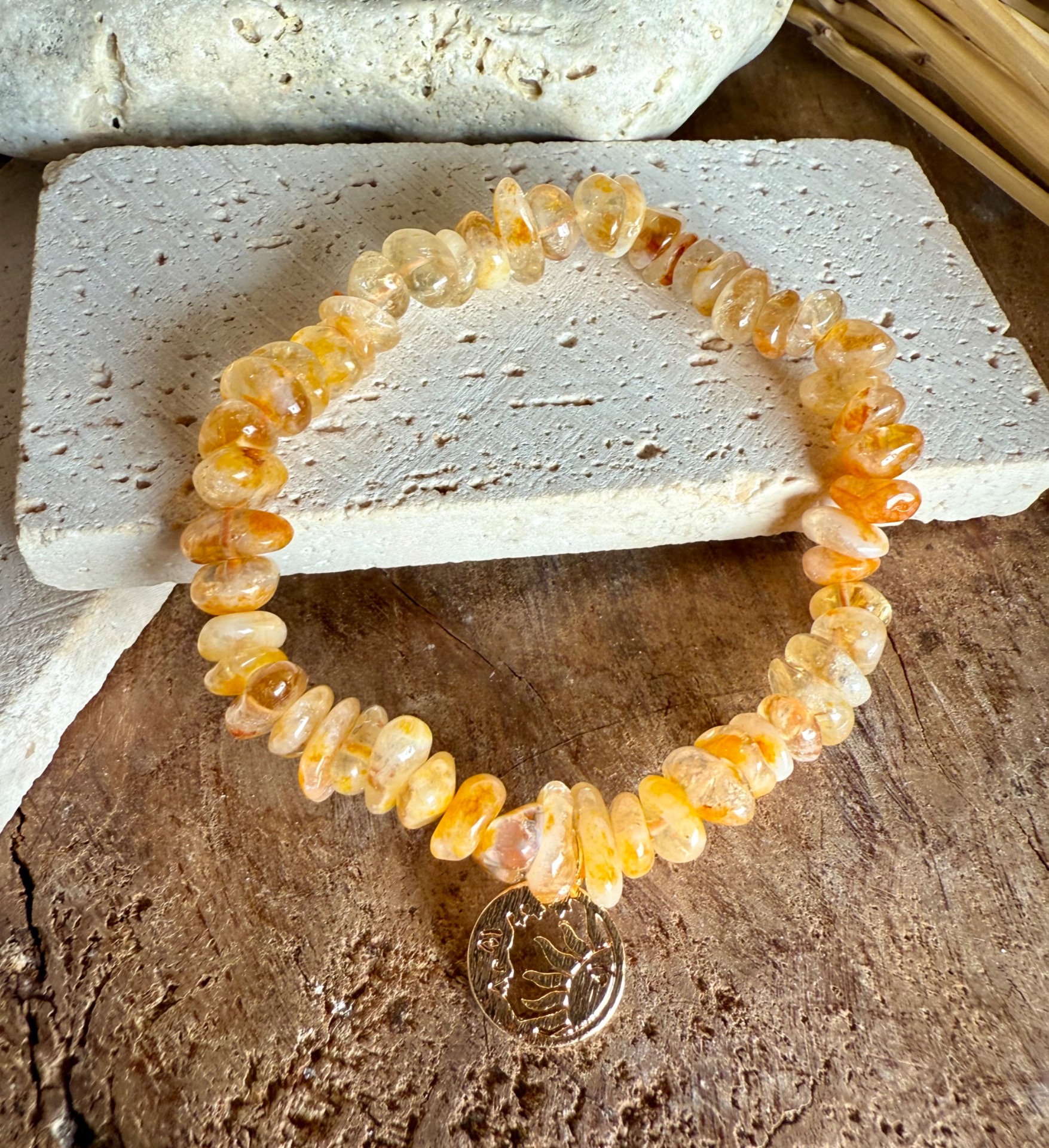 Nabite svoj deň slnečnou energiou s týmto jedinečným náramkom. Citrín a kalcit v sekanej a leštenej podobe prinášajú optimistickú, radostnú a energizujúcu vibráciu, zatiaľ čo prívesok mesiac a slnko spája protiklady a symbolizuje rovnováhu, harmonickú energiu a nové začiatky.