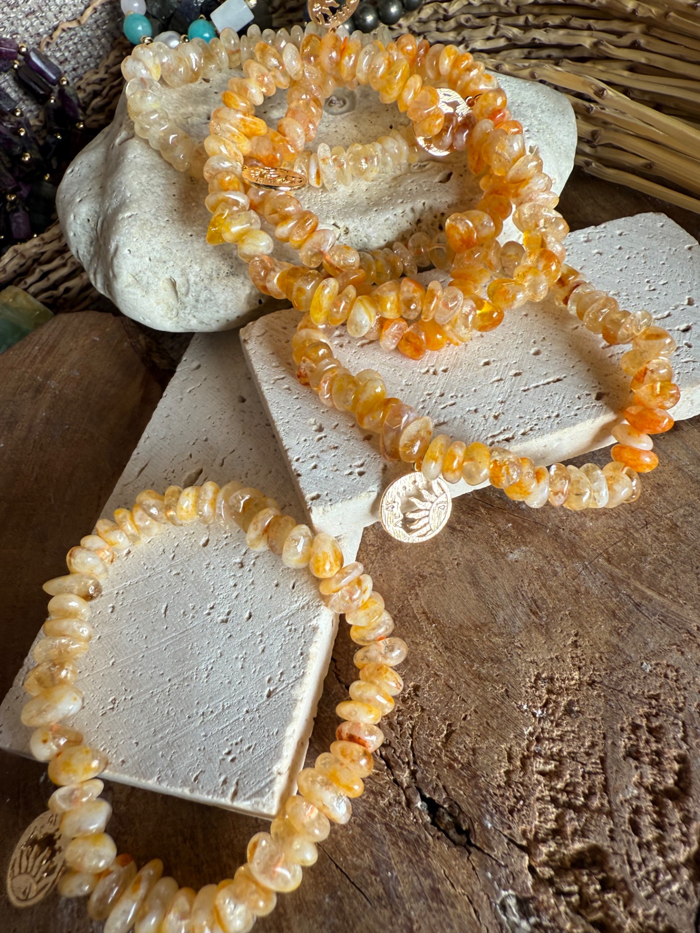 Rozmery: ručne vyrobený, sekané a leštené minerály s hladkými hranami, doplnený príveskom spájajúcim mesiac a slnko