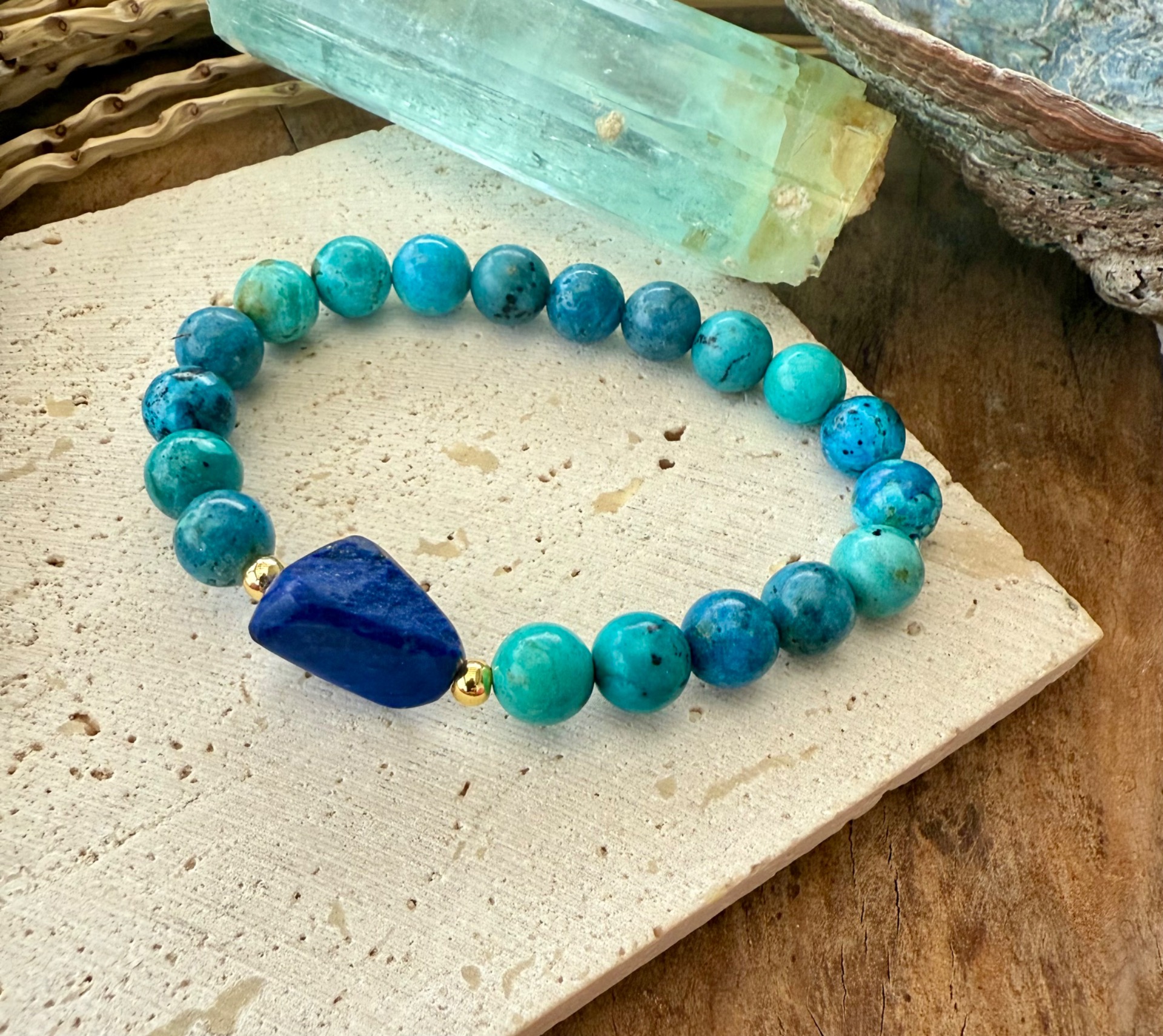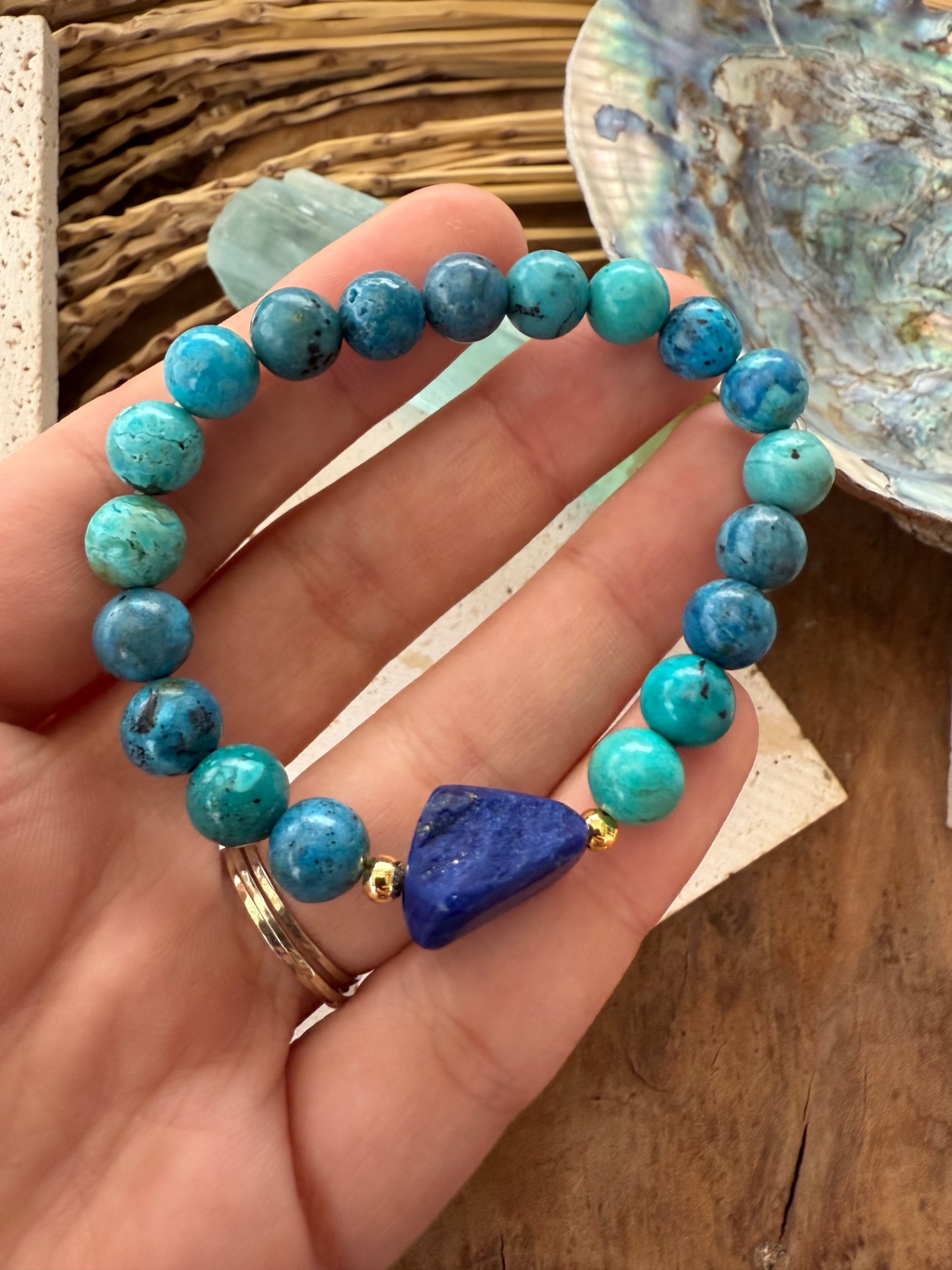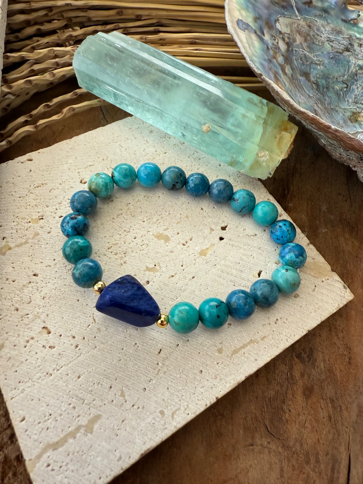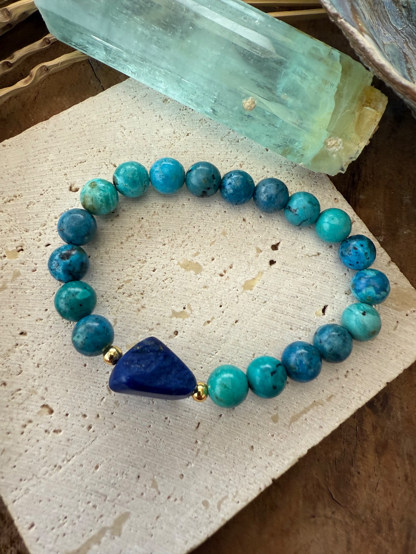 Náramok Hlas intuície spája energiu hlbokých vôd s jasom oblohy – shattuckit prináša vnútorný pokoj, duchovnú múdrosť a schopnosť načúvať svojmu vnútornému hlasu, zatiaľ čo lapis lazuli v podobe väčšieho nugetu posilňuje pravdu, odvahu a jasné videnie.