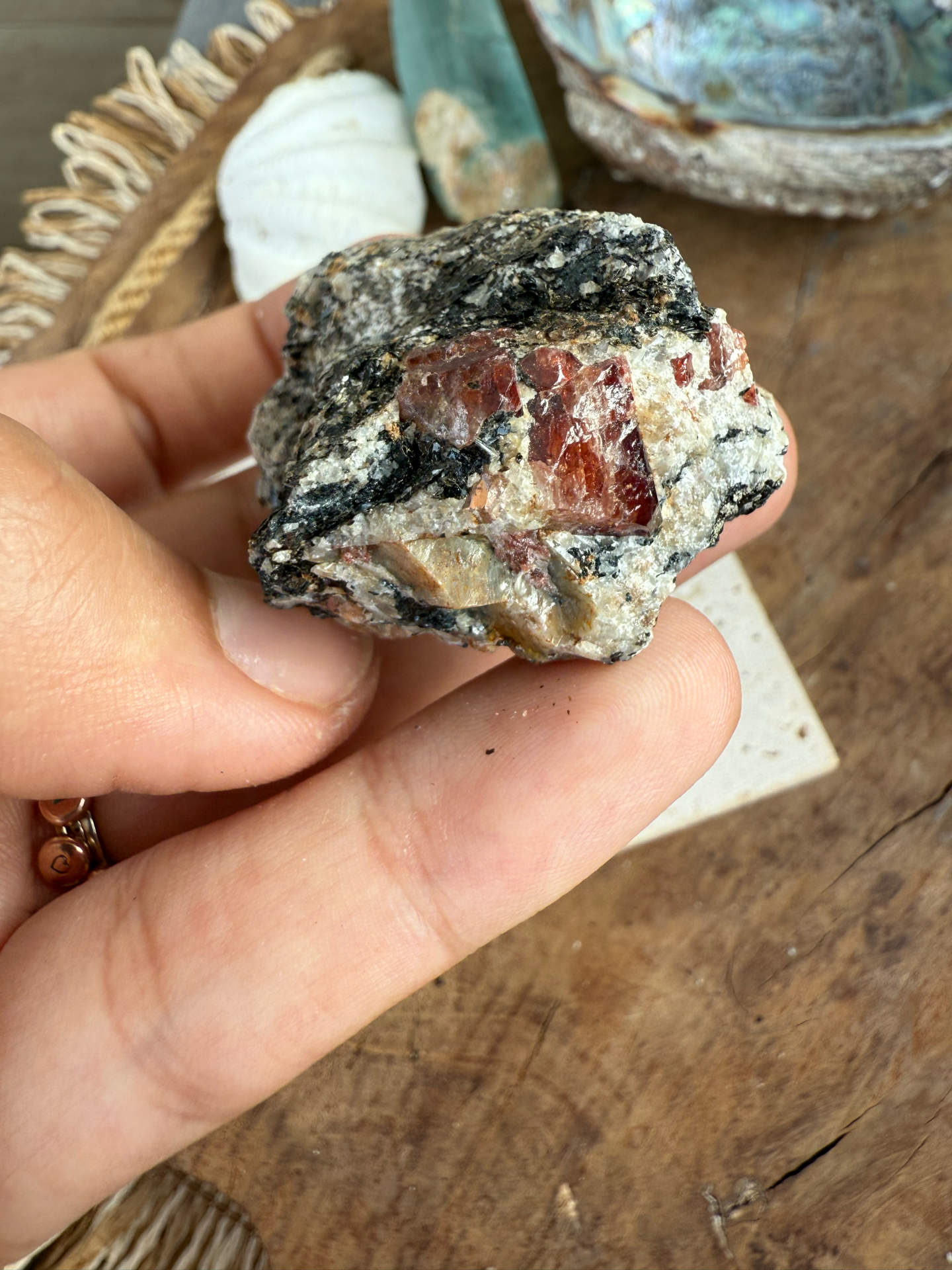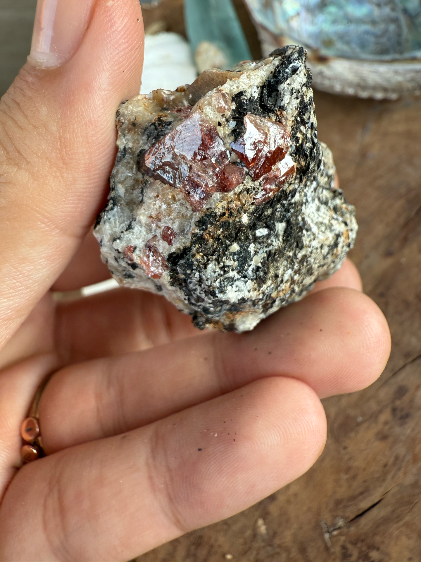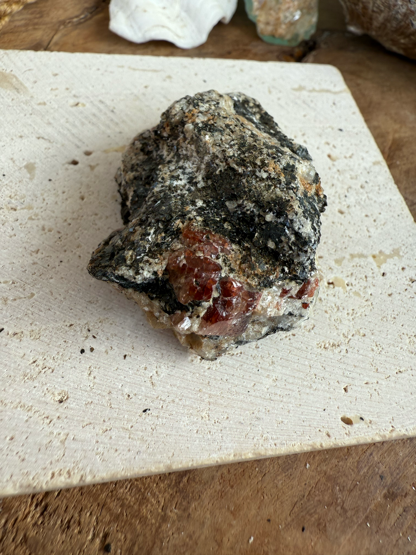 Jeho sýte červeno-krvavé odtiene žiaria v kontraste s horninou, z ktorej sa zrodil. Tento minerál v matrici pôsobí mimoriadne surovo, silno a pravdivo – ako by v sebe niesol samotný dych Zeme.