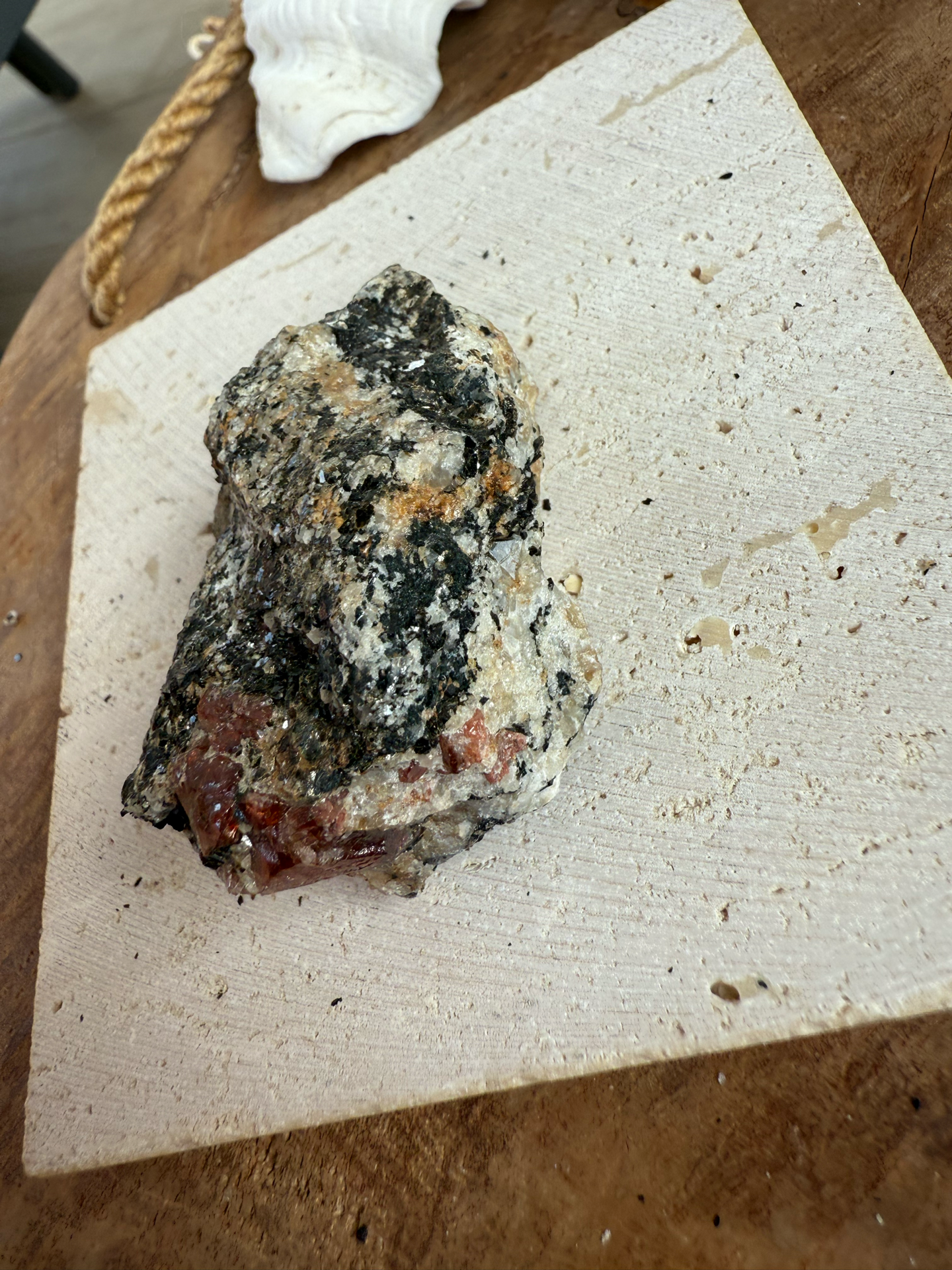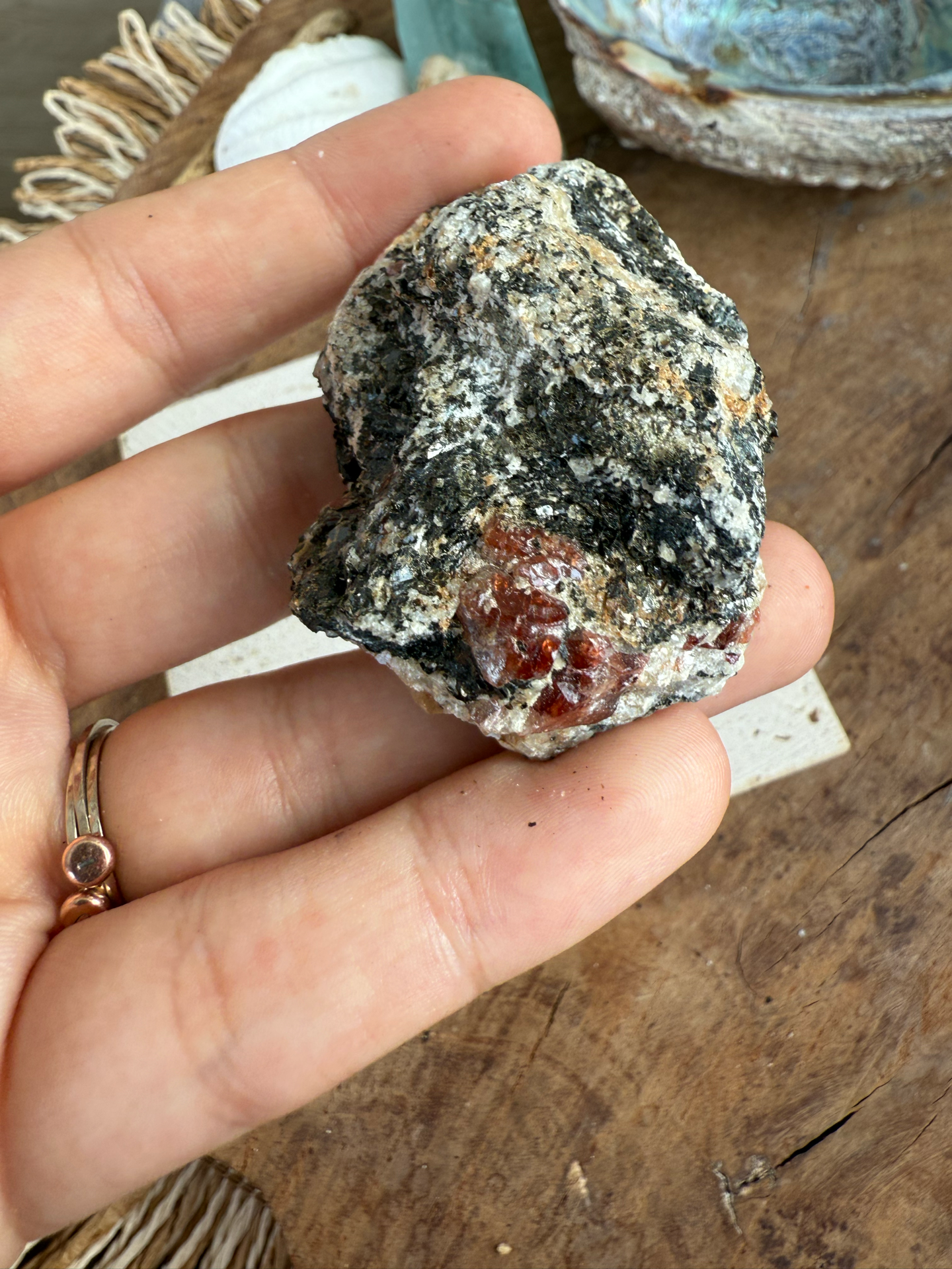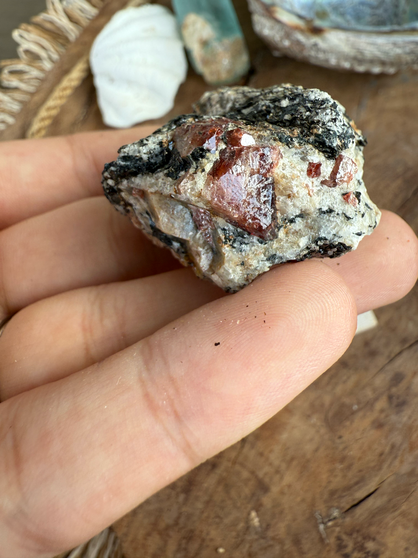 Jeho sýte červeno-krvavé odtiene žiaria v kontraste s horninou, z ktorej sa zrodil. Tento minerál v matrici pôsobí mimoriadne surovo, silno a pravdivo – ako by v sebe niesol samotný dych Zeme.