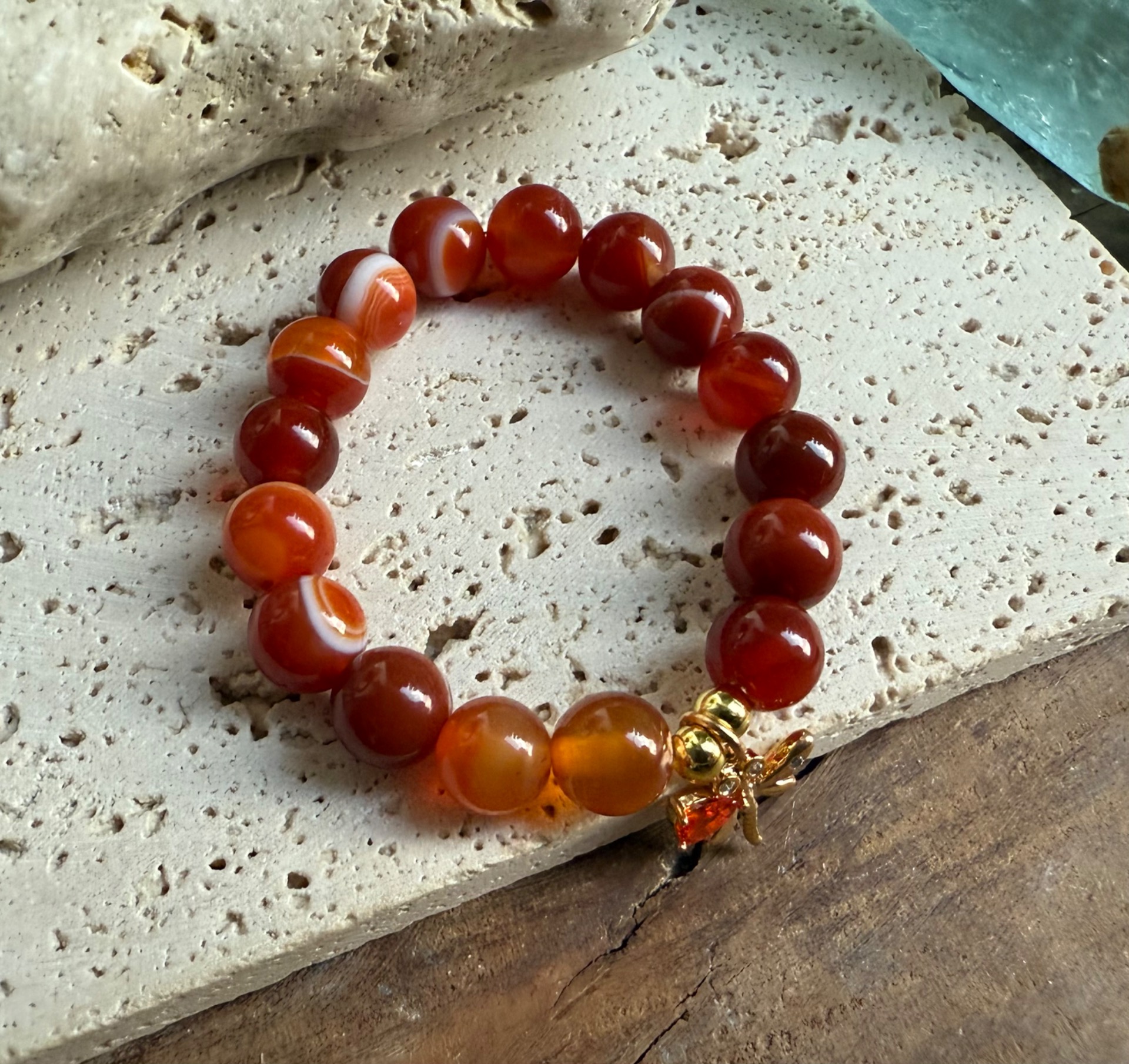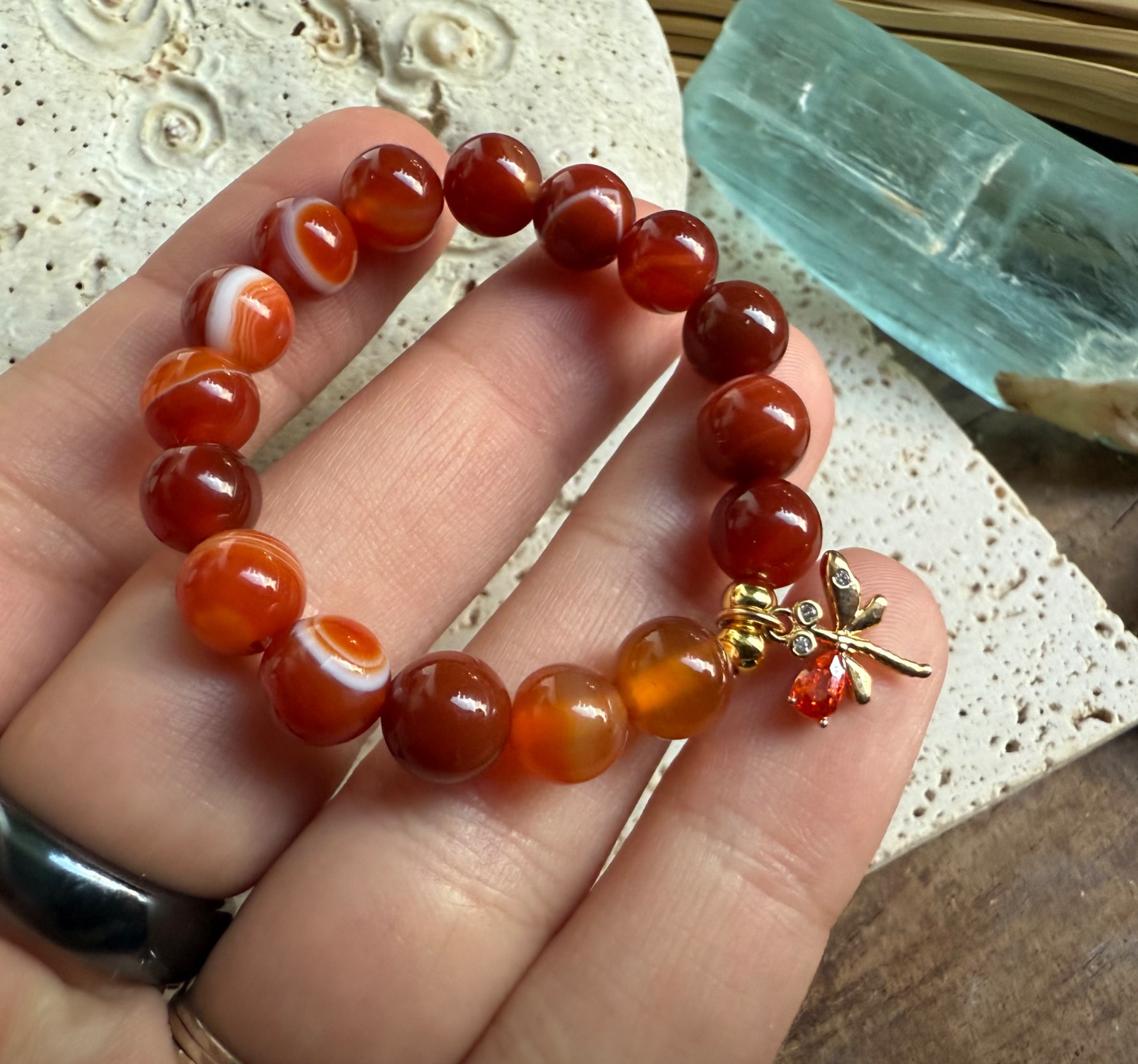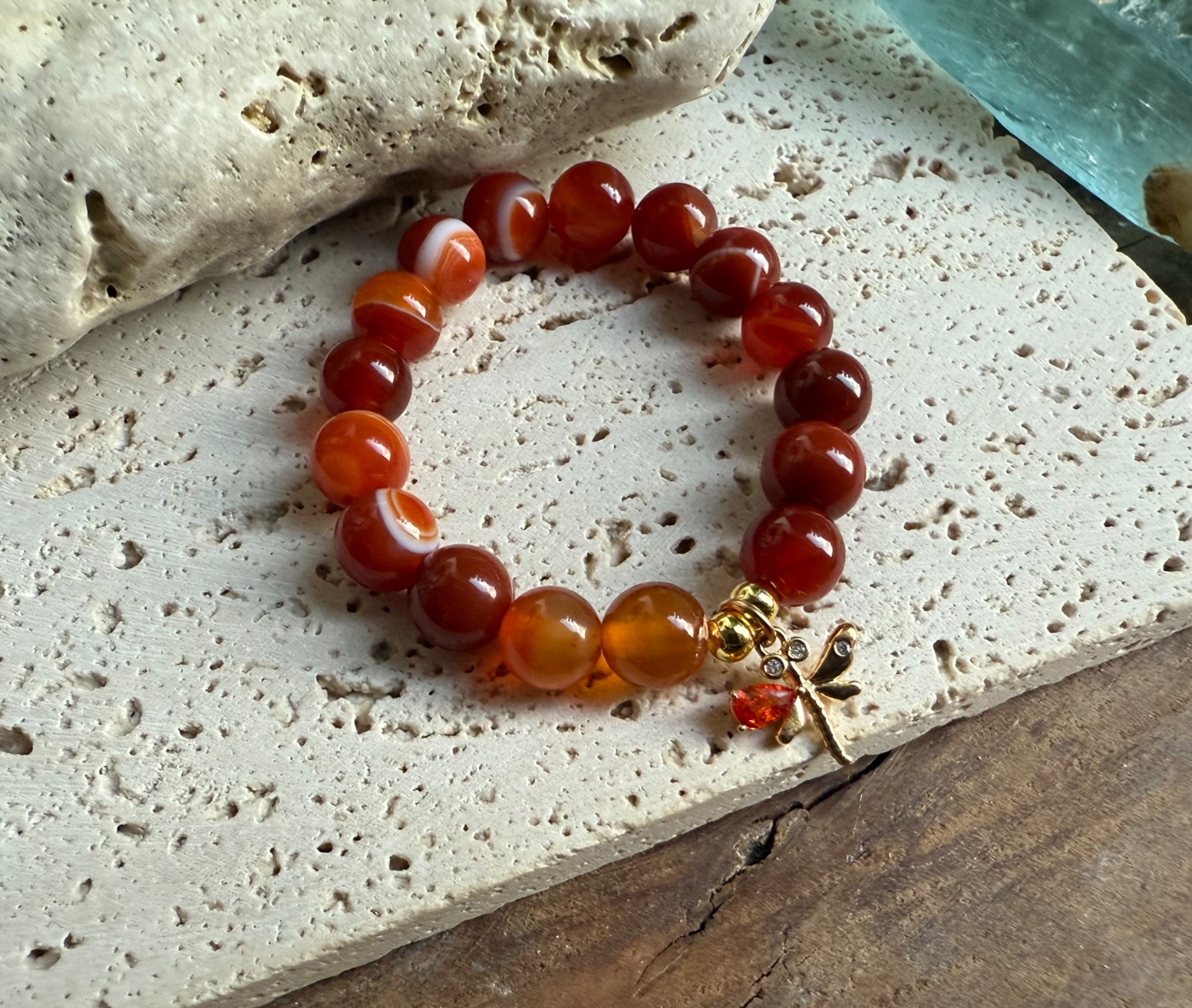 Detský náramok z minerálu – karneol + prívesok vážka – Energia a radosť