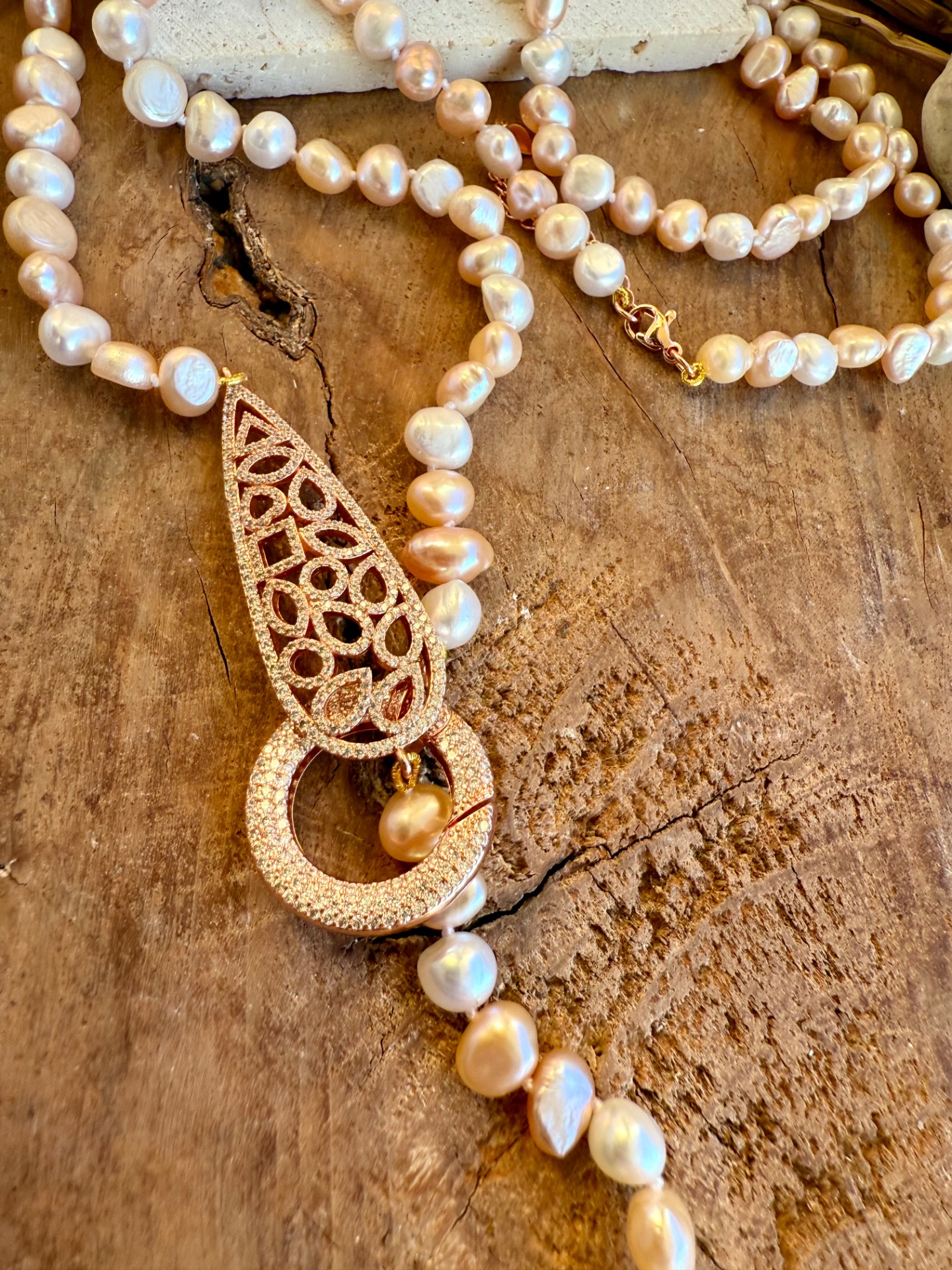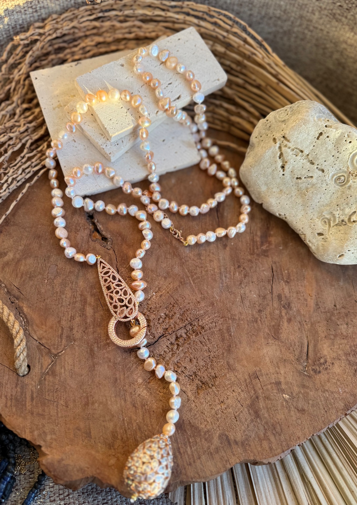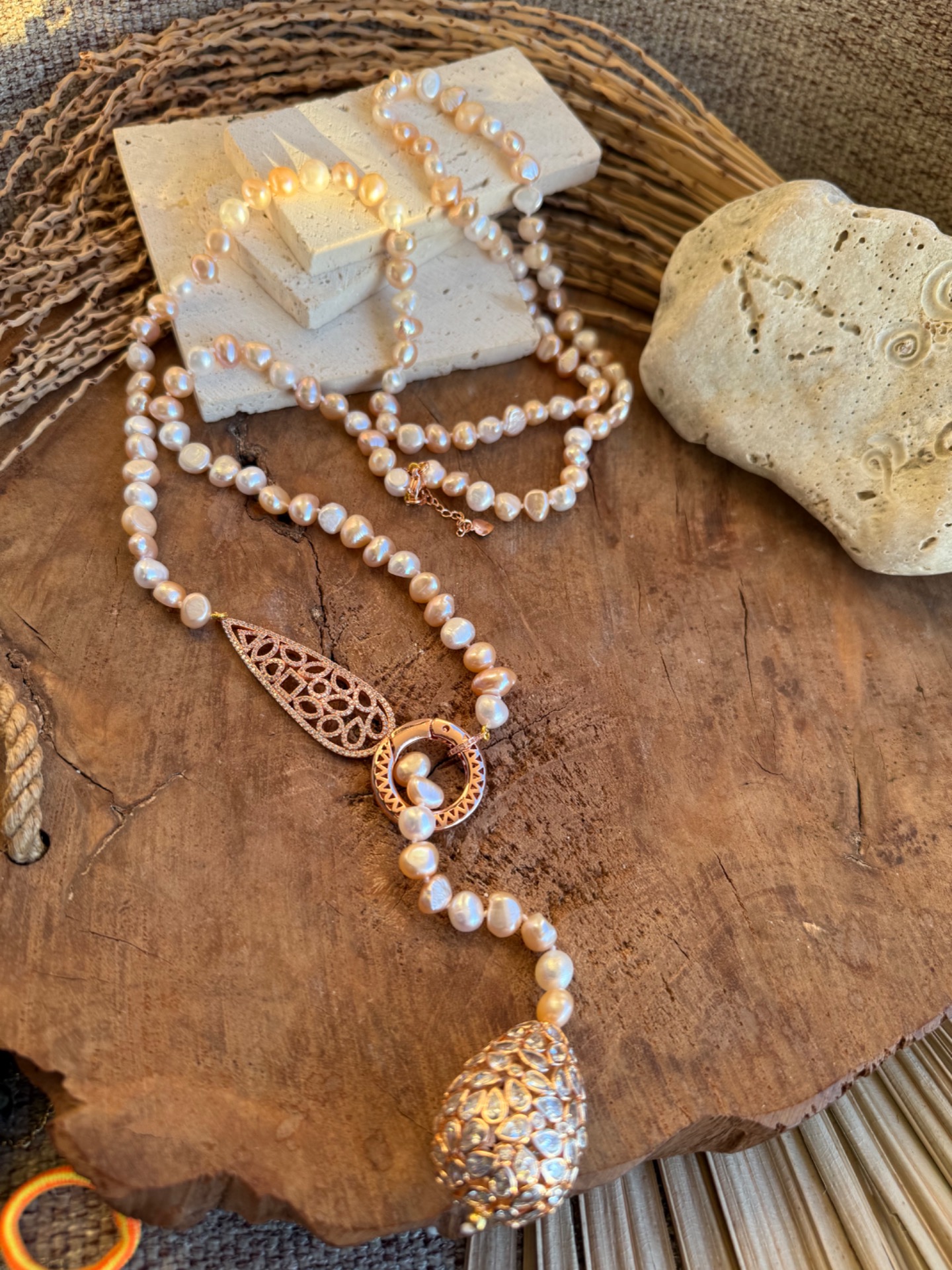 "Plynutie života" je dlhý Ypsilon náhrdelník z pravých riečnych perál v jemnom rose gold odtieni, ktorý prirodzene kopíruje líniu tela a pohyb ženy. Má 126 cm dokola (63 cm jedna strana) a vytvára elegantnú, predlžujúcu siluetu.