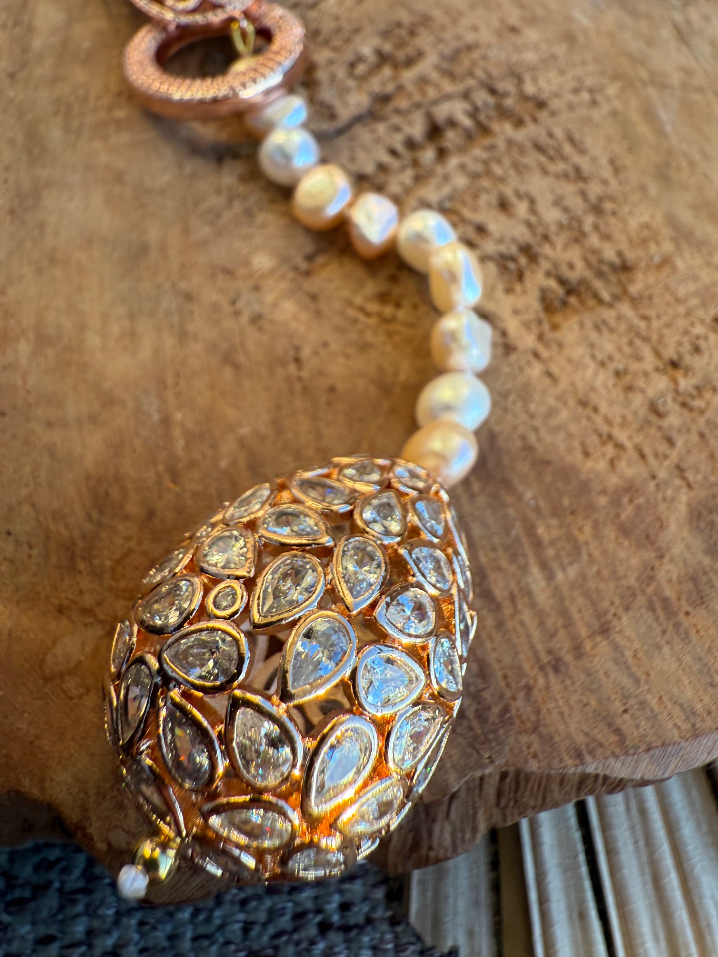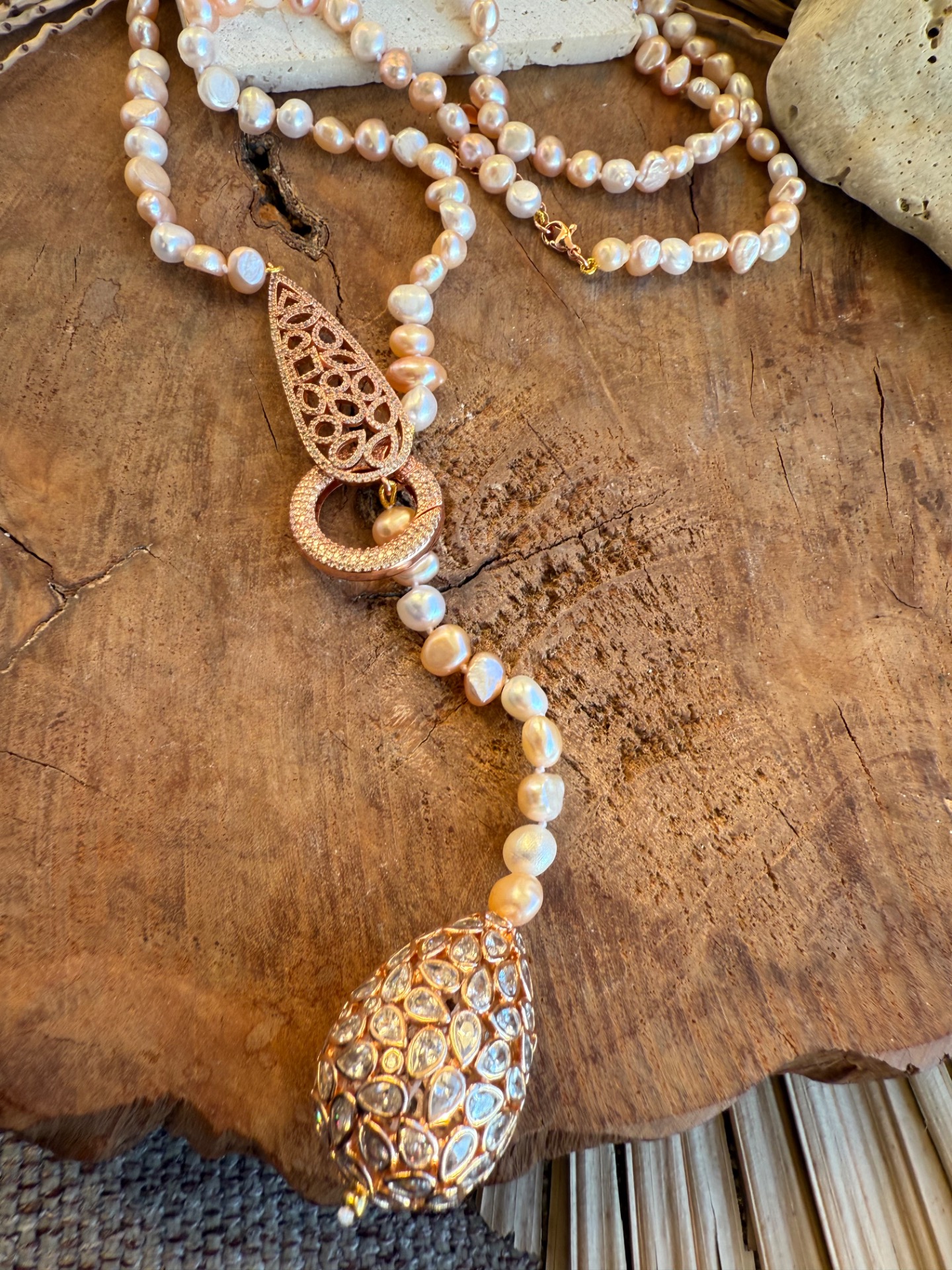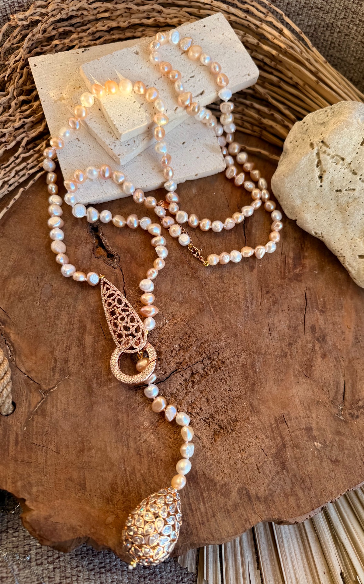 "Plynutie života" je dlhý Ypsilon náhrdelník z pravých riečnych perál v jemnom rose gold odtieni, ktorý prirodzene kopíruje líniu tela a pohyb ženy. Má 126 cm dokola (63 cm jedna strana) a vytvára elegantnú, predlžujúcu siluetu.