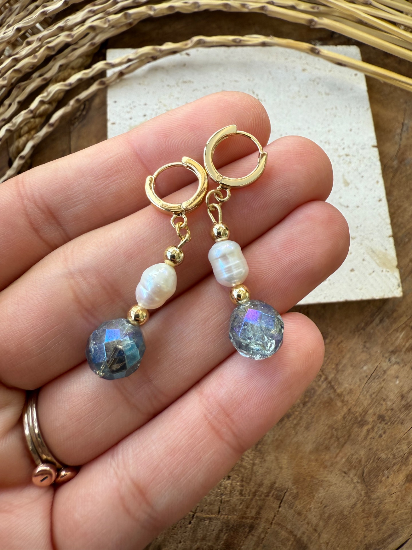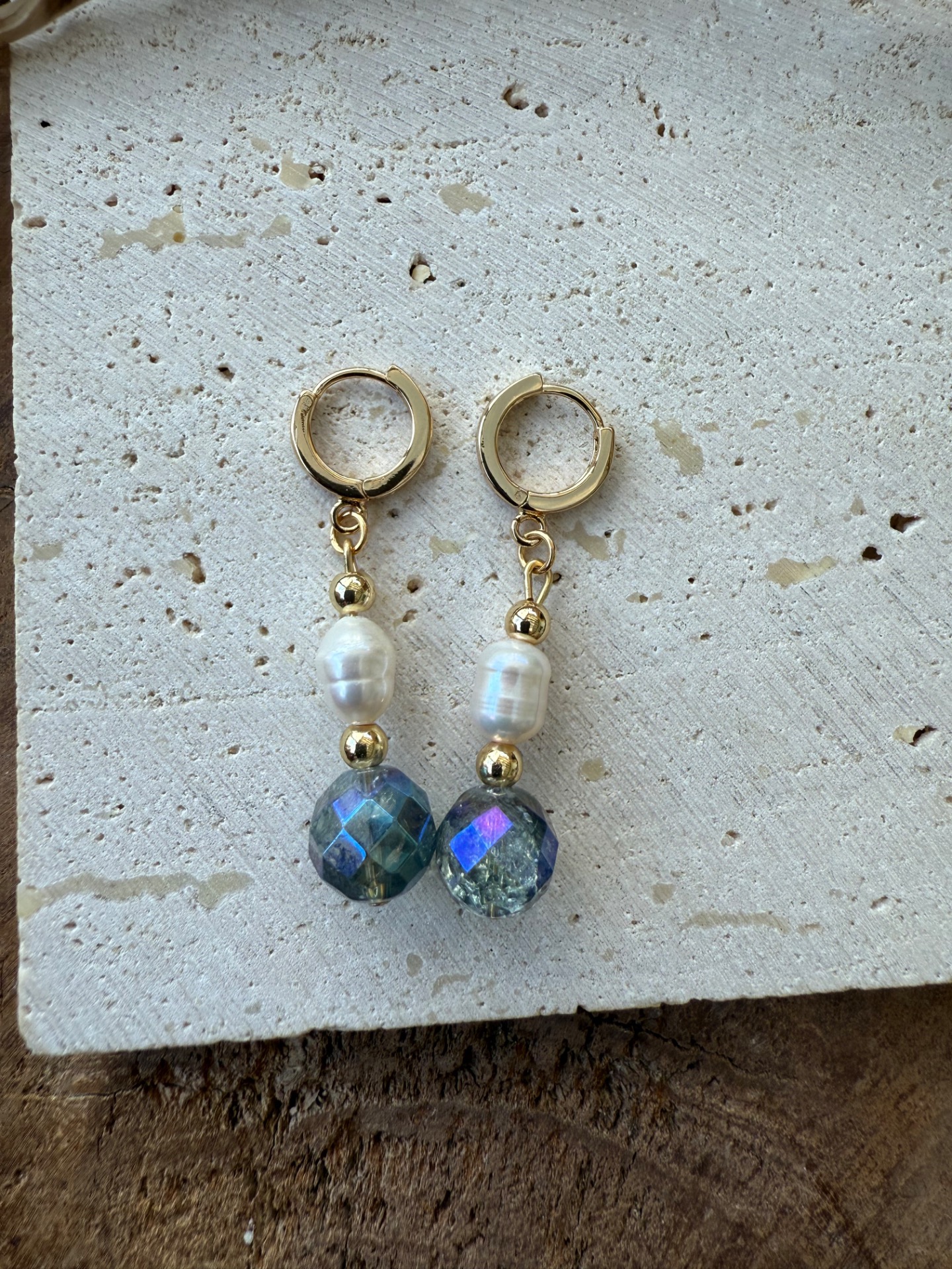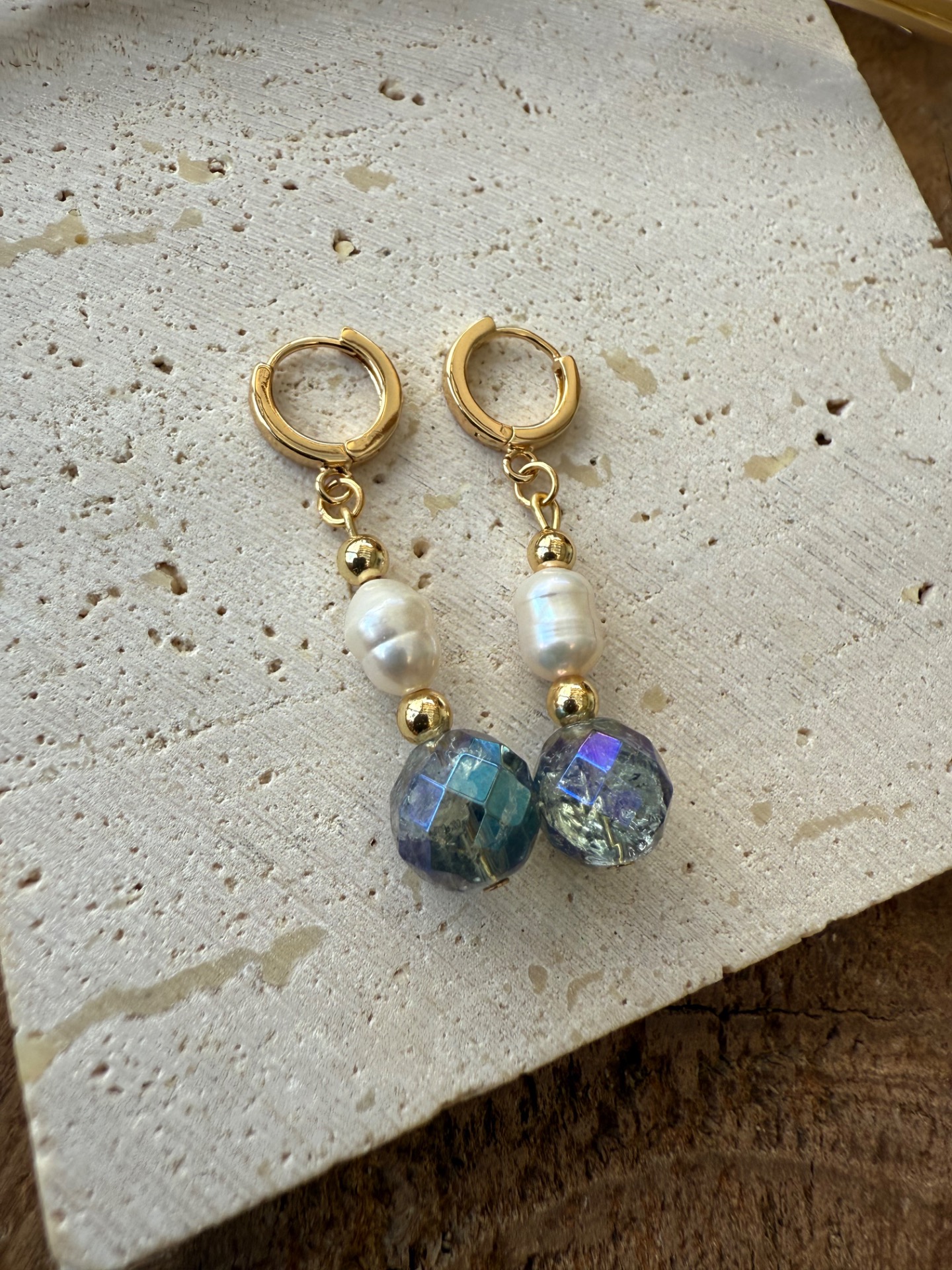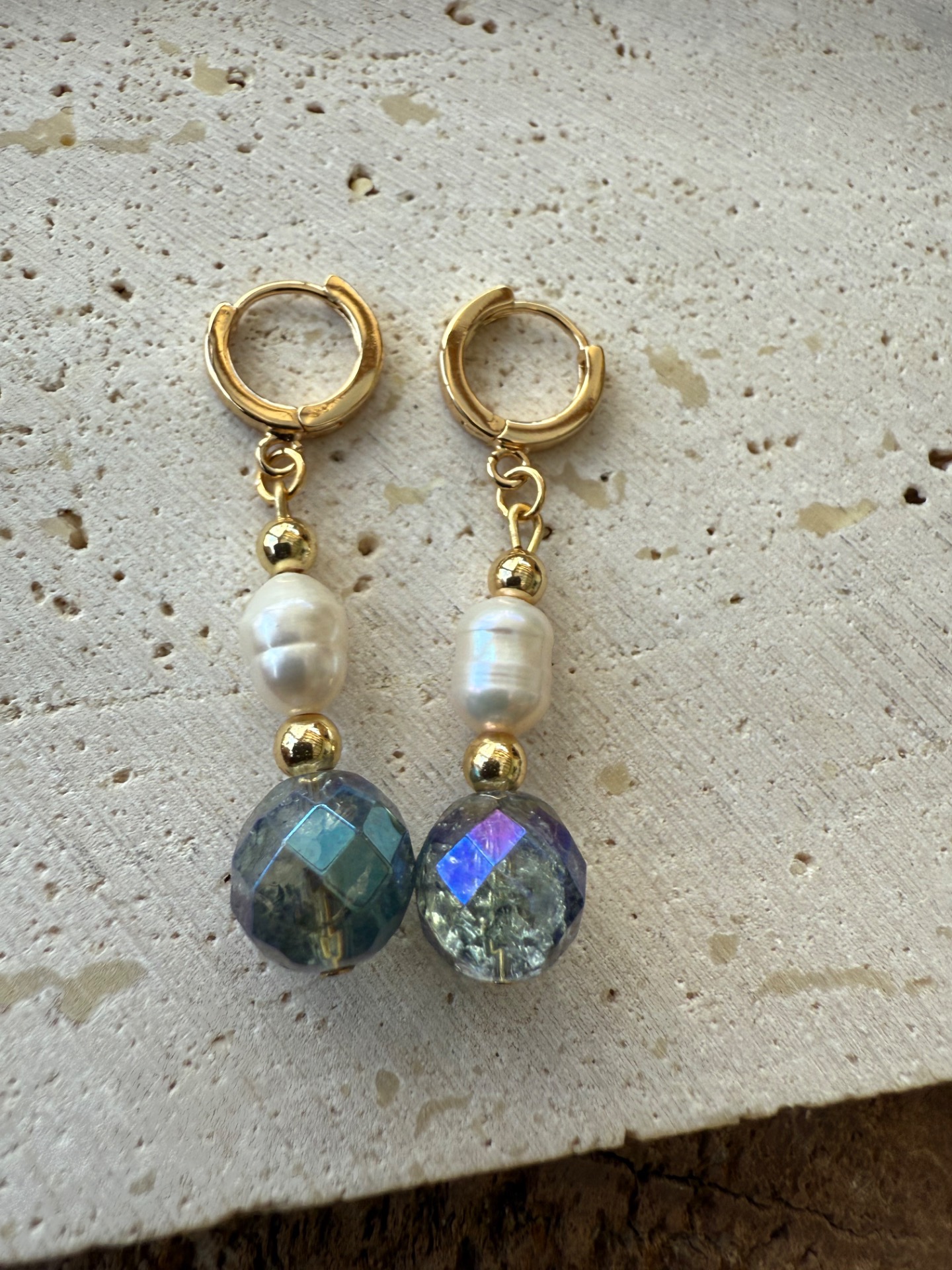 Tieto visiace náušnice kombinujú jasný, farebný aqua-aura kryštál s jemnými perlami, čím vzniká hravý, no elegantný šperk. Kryštál odráža svetlo a jemné perly pridávajú nežnosť a harmóniu. Ideálne pre ženu, ktorá miluje výrazné, ale stále elegantné doplnky.