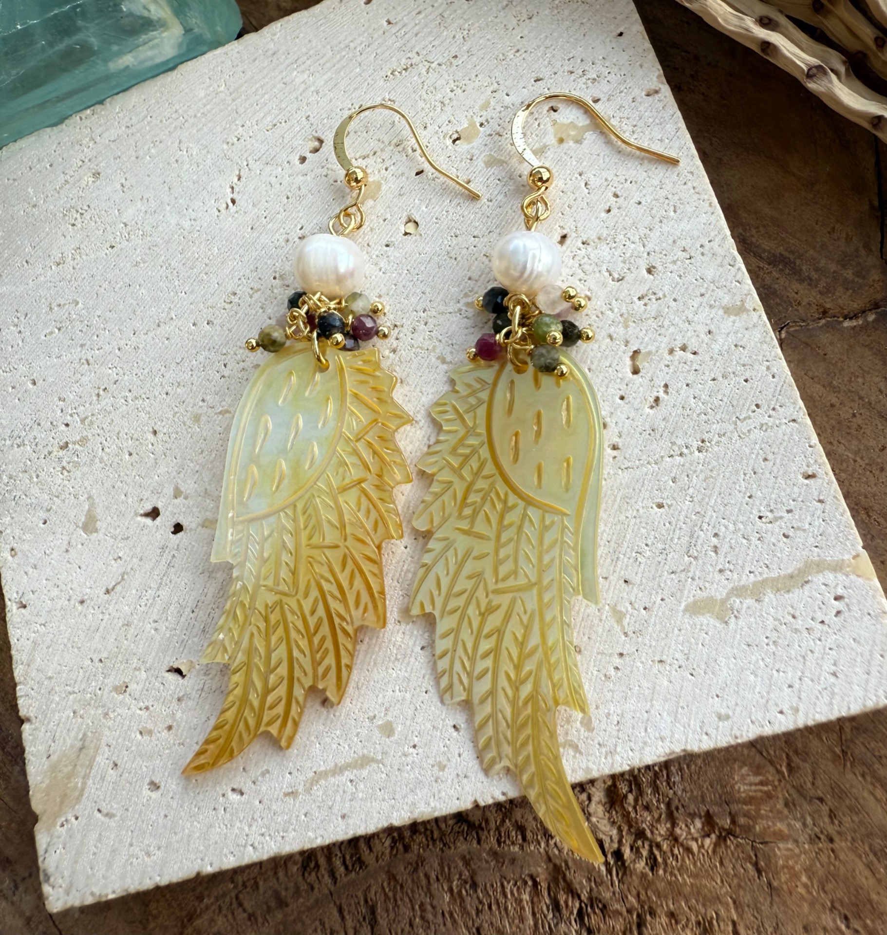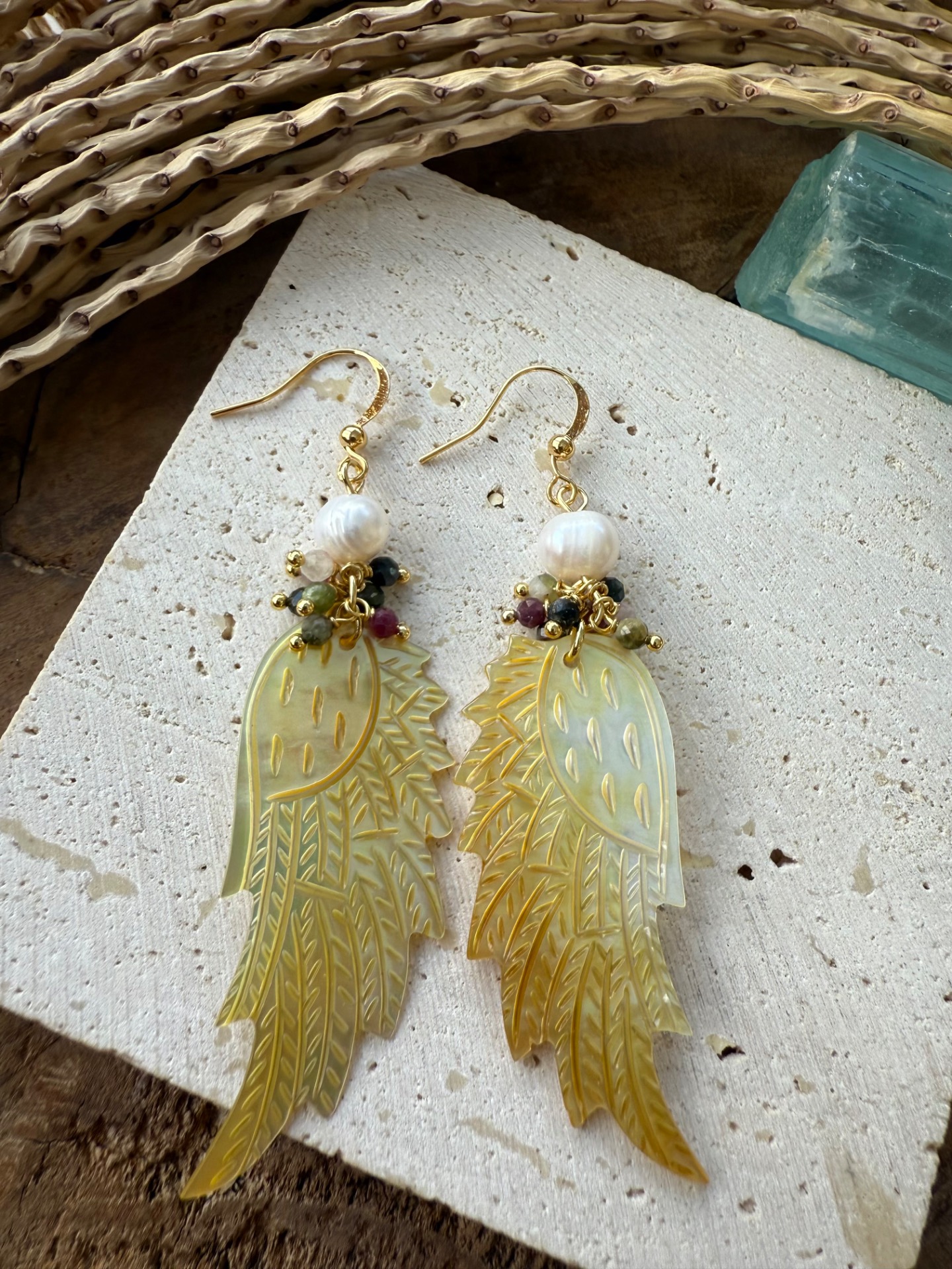 "Krídla svetla" – luxusné visiace náušnice z perlete, riečnej perly a melónového turmalínu