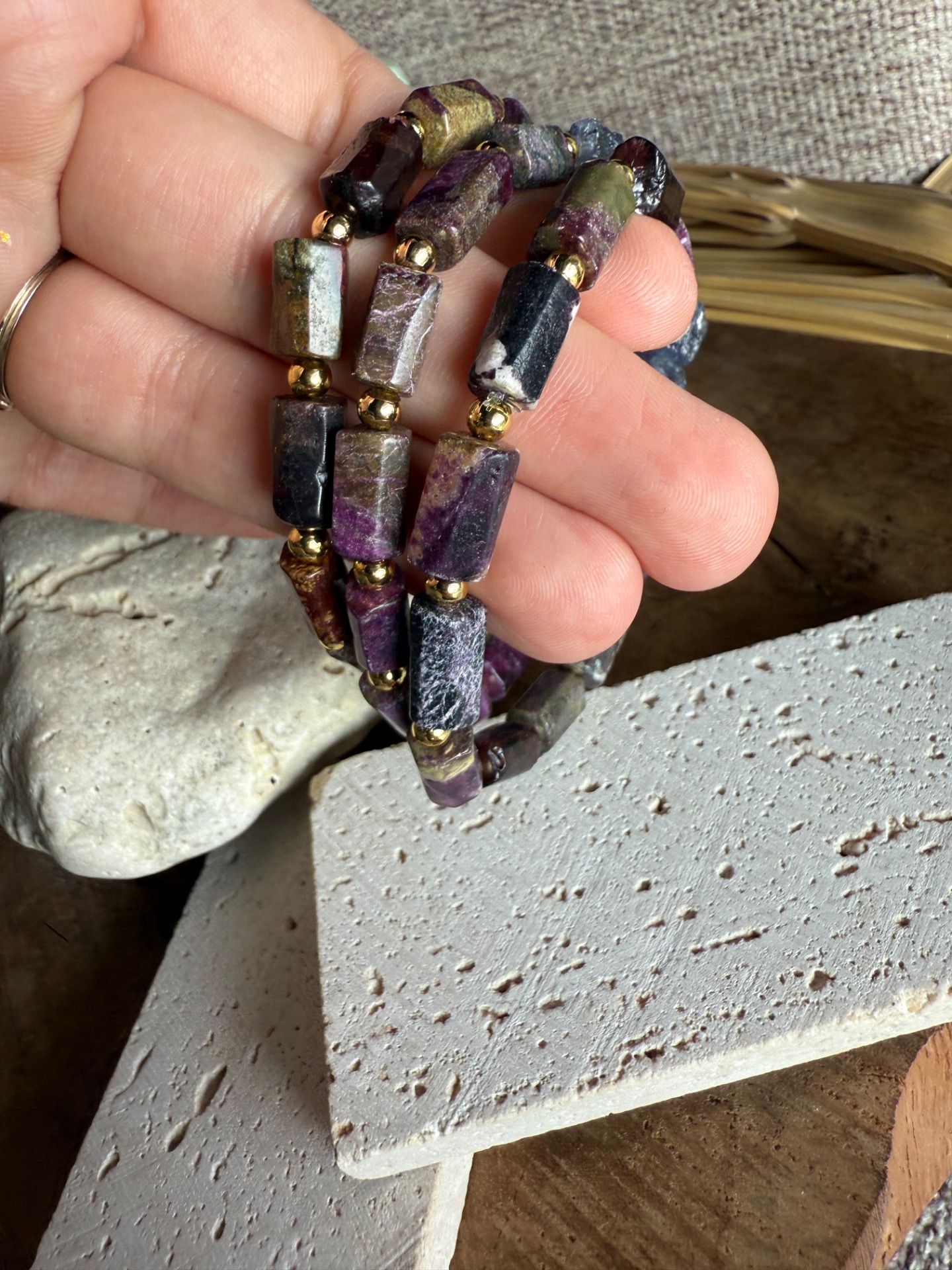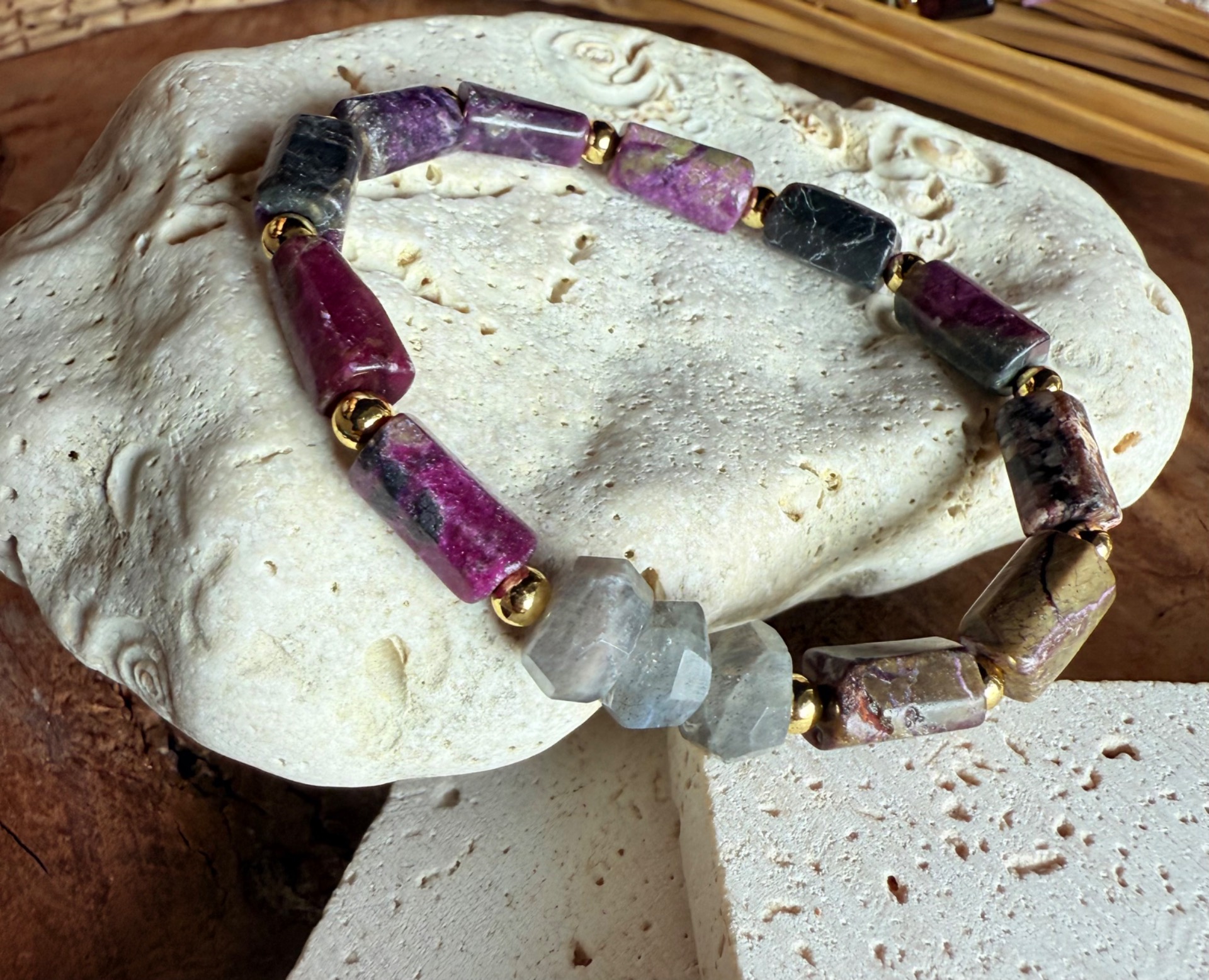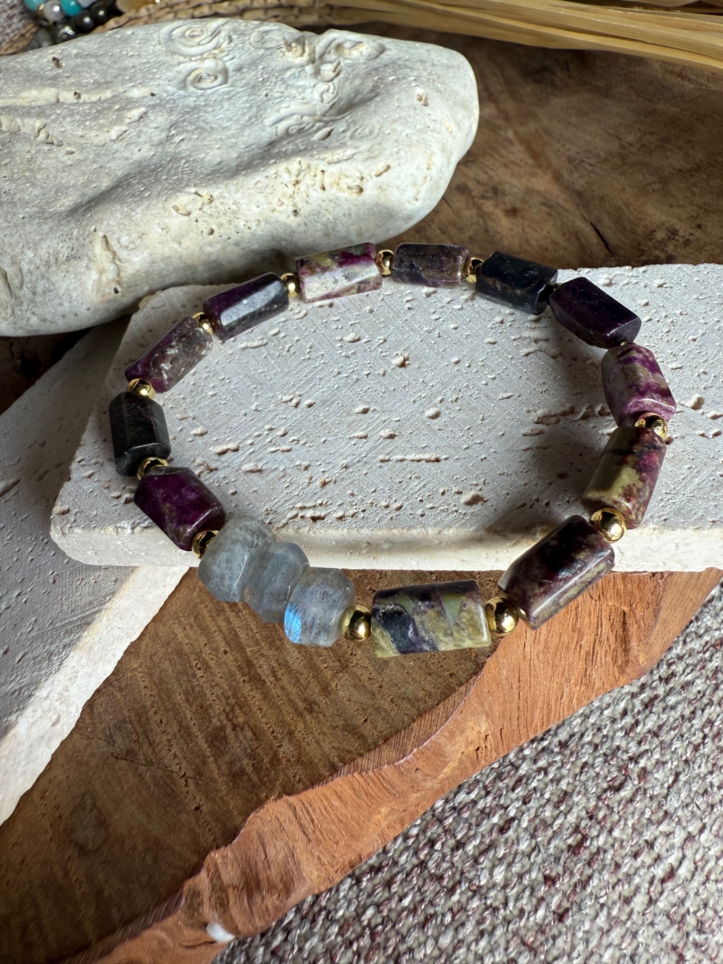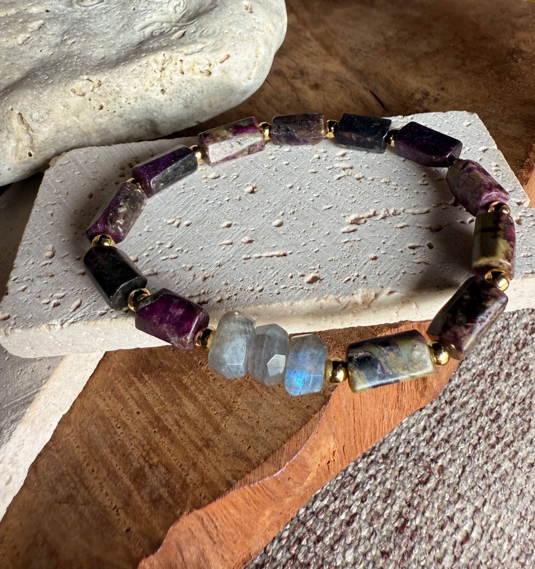 Valčekový eudialit spojený s duhovým labradoritom robí z tohto náramku unikátny energetický talizman, ktorý harmonizuje telo, myseľ aj dušu. Ideálny pre meditáciu, denné nosenie aj ako výrazný módny doplnok.