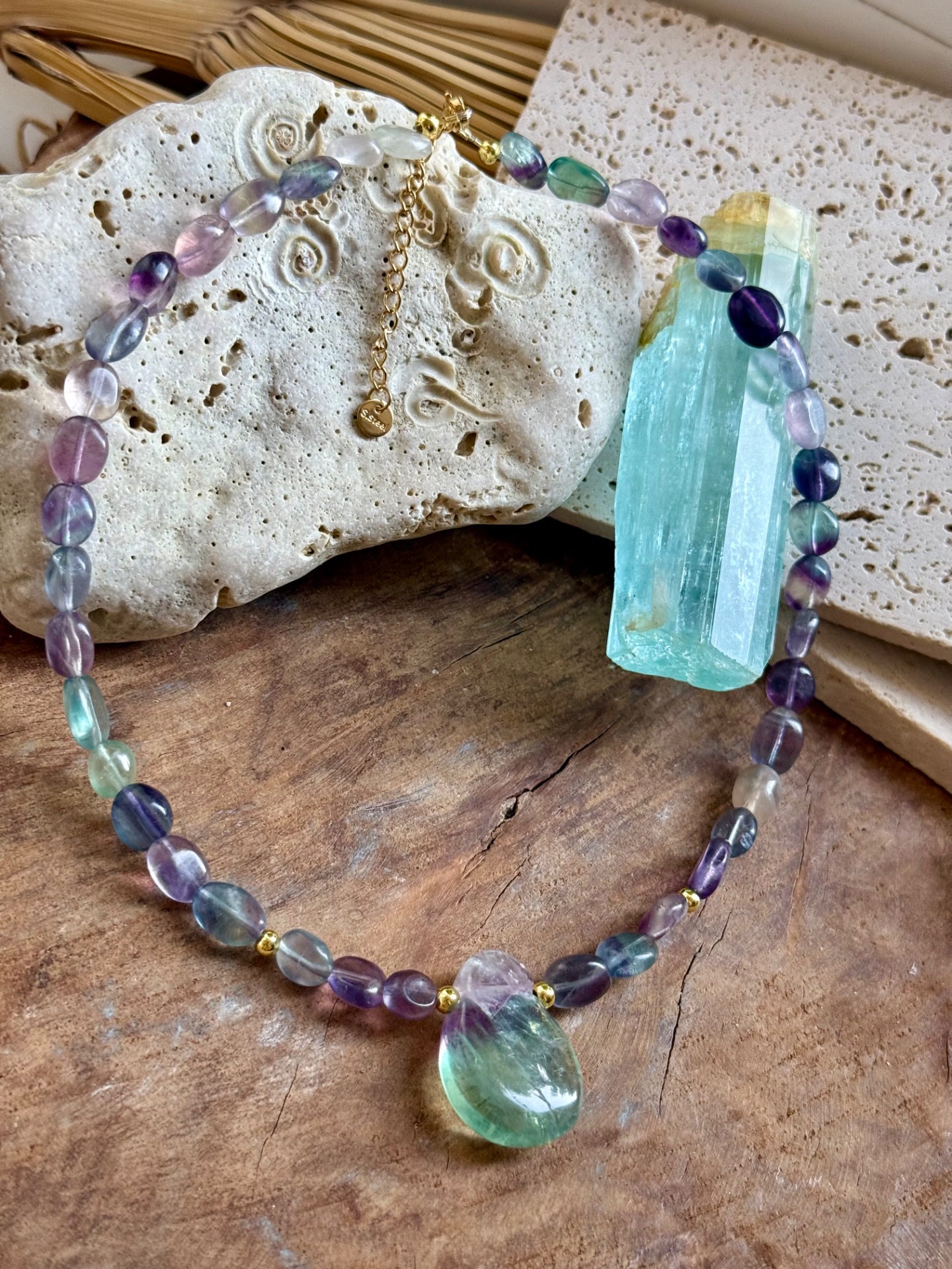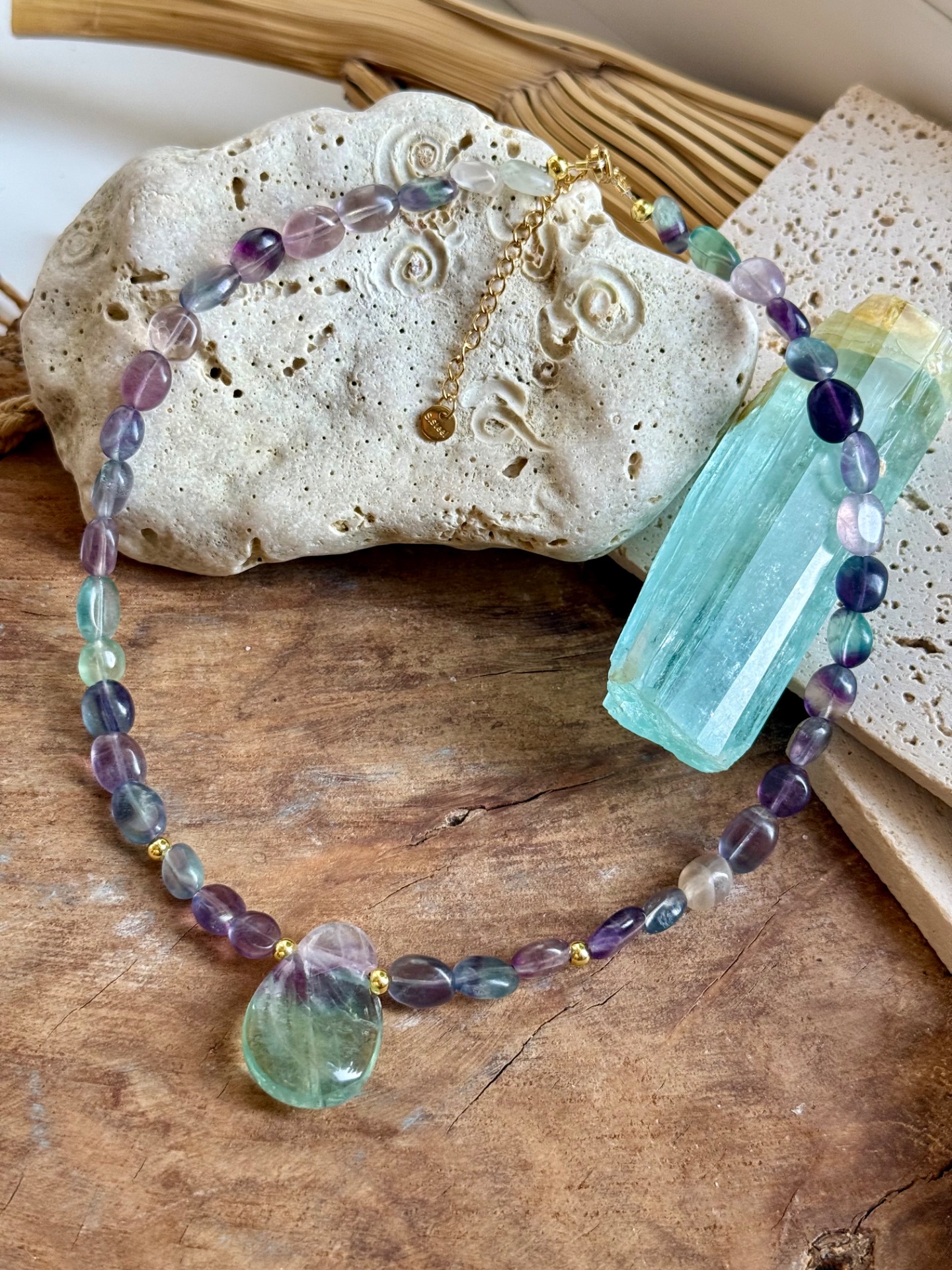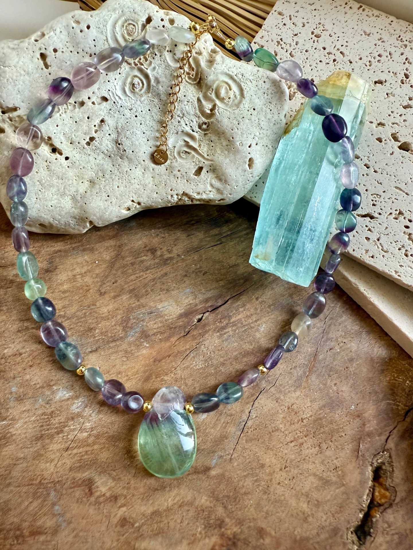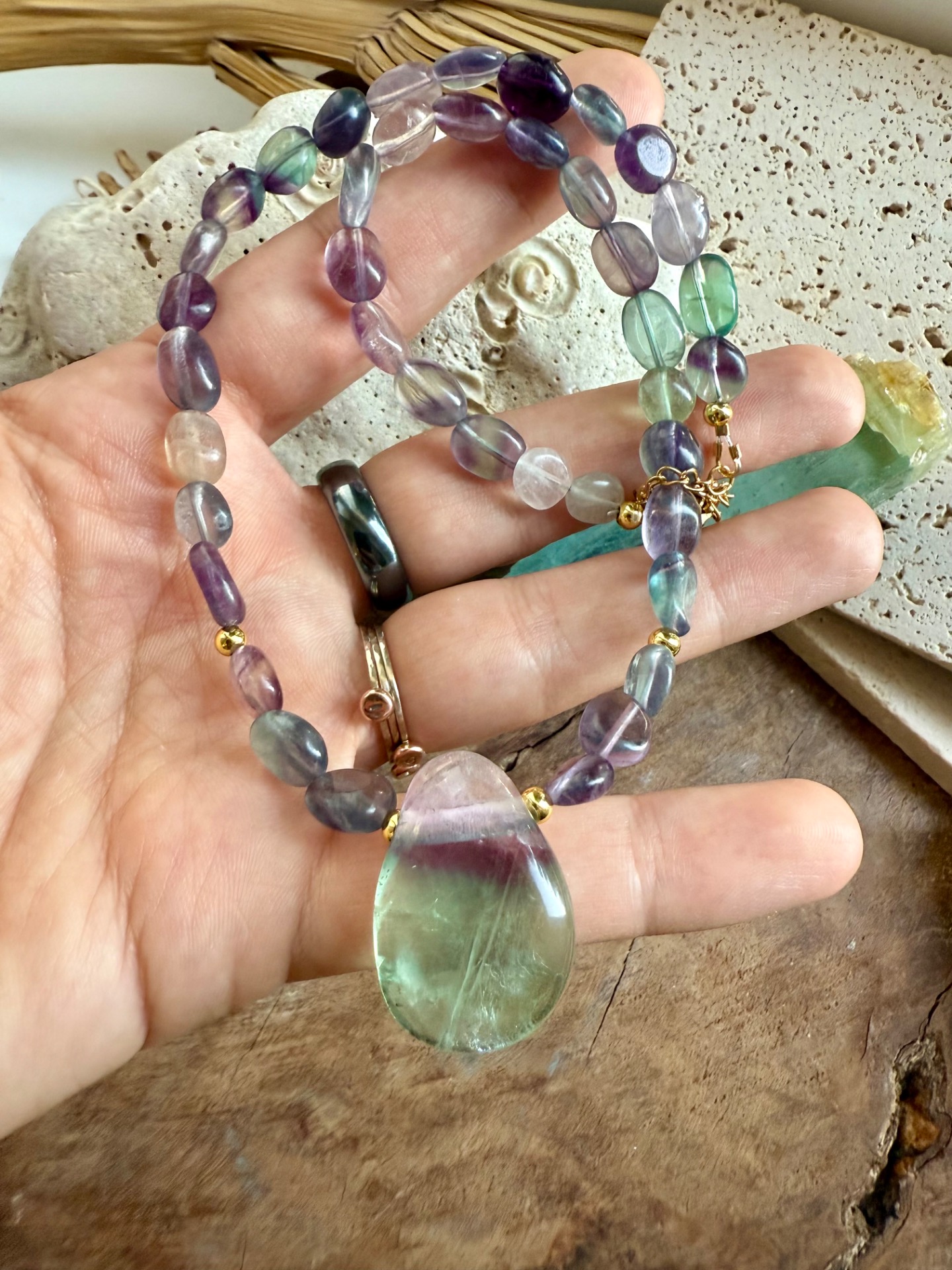 V strede náhrdelníka sa nachádza vrtaný prívesok z fluoritu, ktorý odhaľuje jemné vnútorné dúhy, viditeľné aj na fotografiách. Každý kameň je jedinečný, a práve tieto farebné hry z neho robia energeticky a vizuálne výnimočný kúsok. Fluorit je obľúbený medzi tými, ktorí chcú vyčistiť myseľ, podporiť sústredenie a posilniť vnútornú ochranu pred negatívnymi energiami.