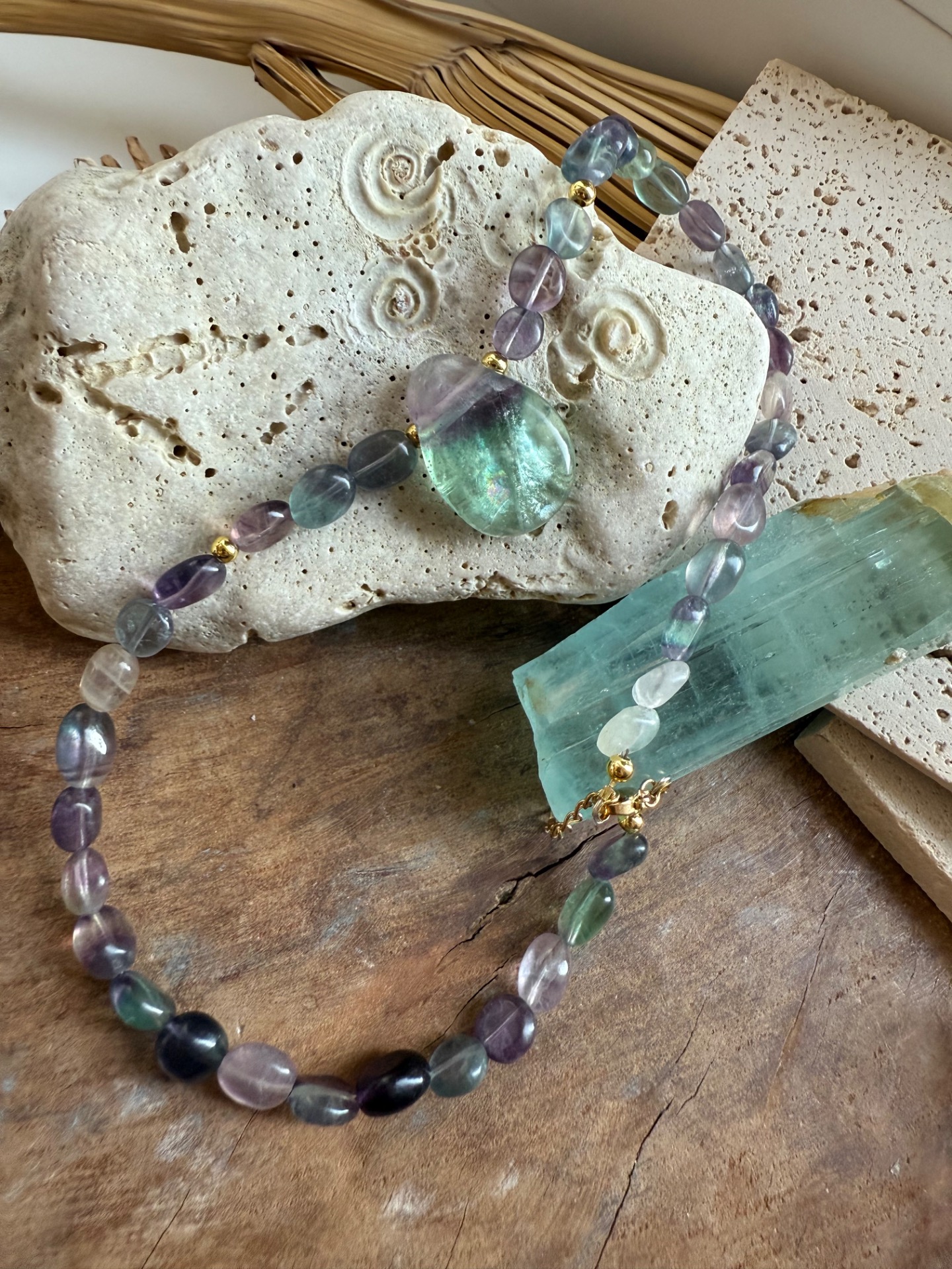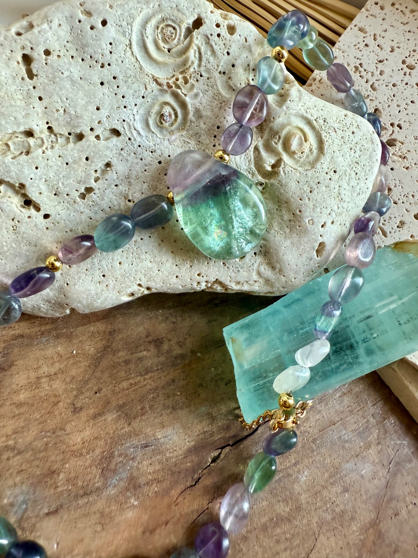 Krátky náhrdelník z fluoritu – Dúhová ochrana a harmónia