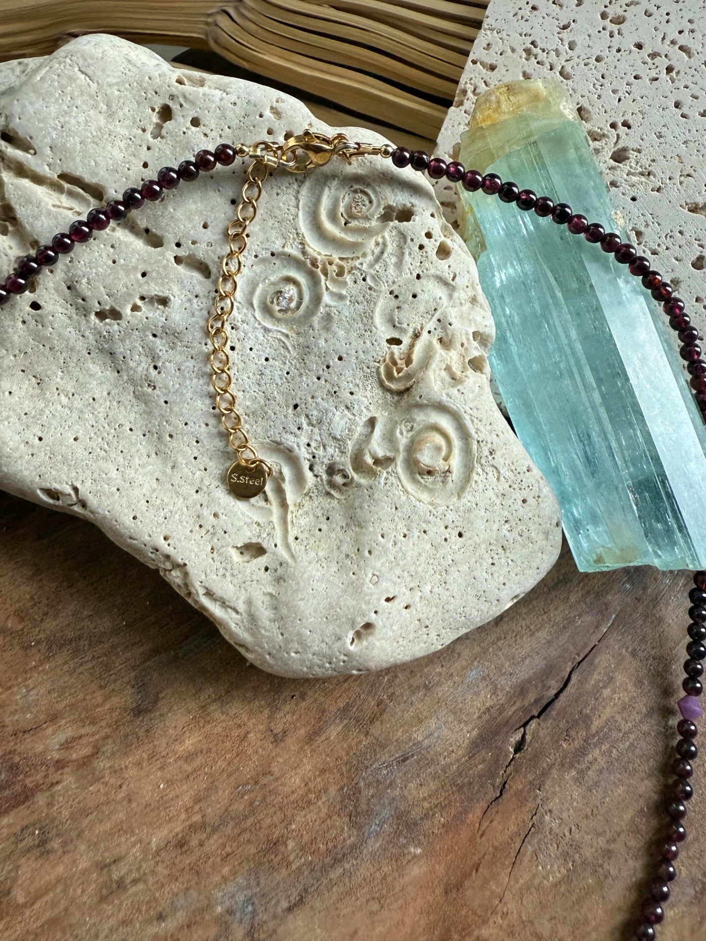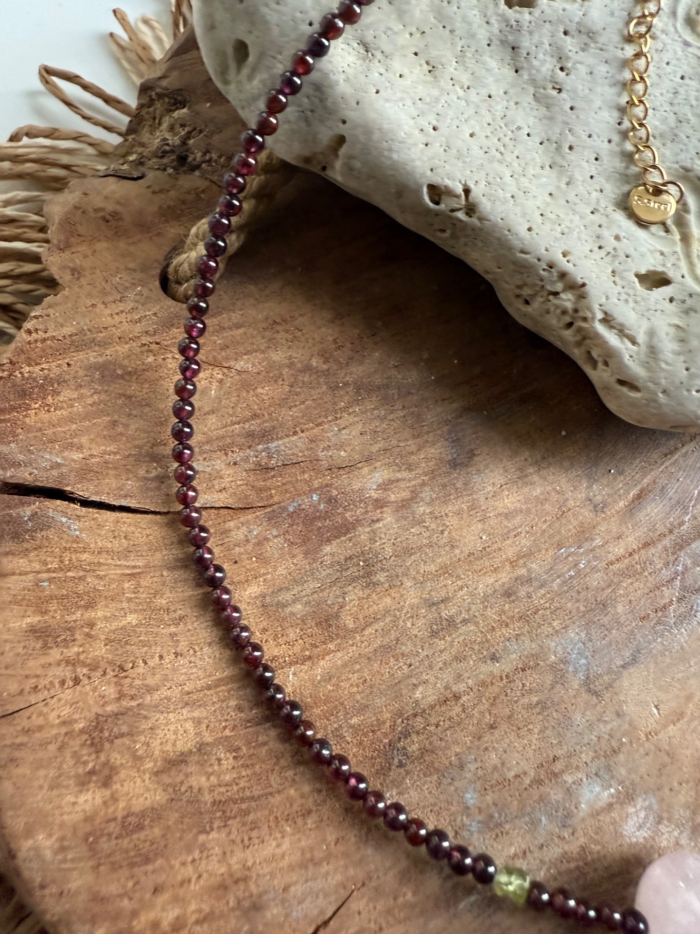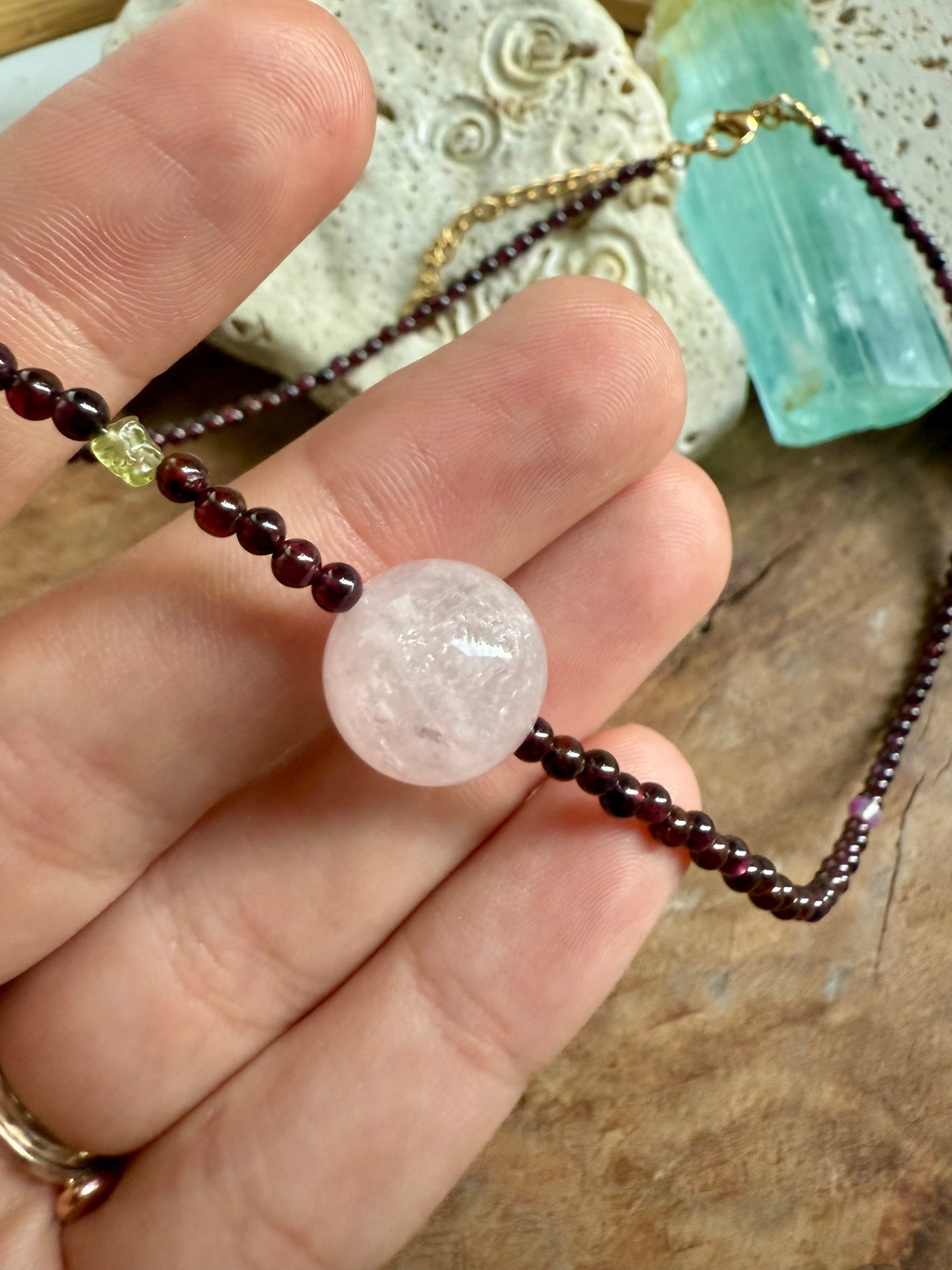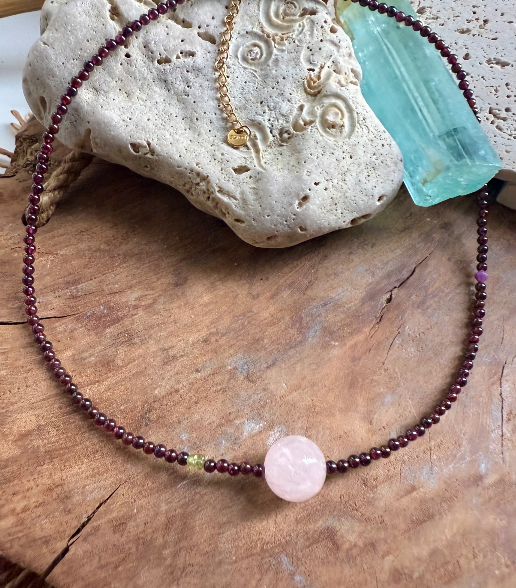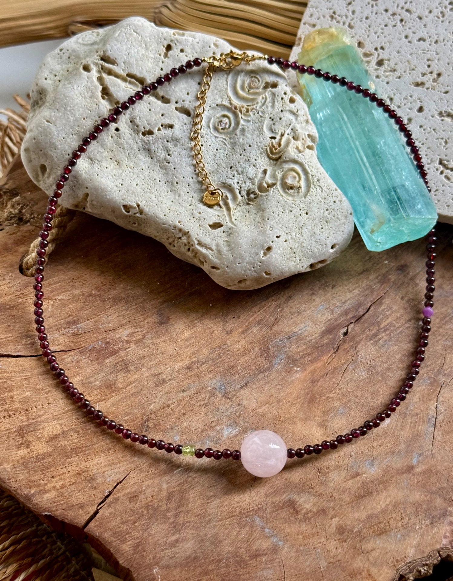 Každý detail je symbolom rovnováhy: vášeň granátu sa spája s jemnosťou ruženínu, zatiaľ čo drobný ,olivín, prináša žiarivú sviežosť srdca a phosfosiderit, tichú duchovnú silu.