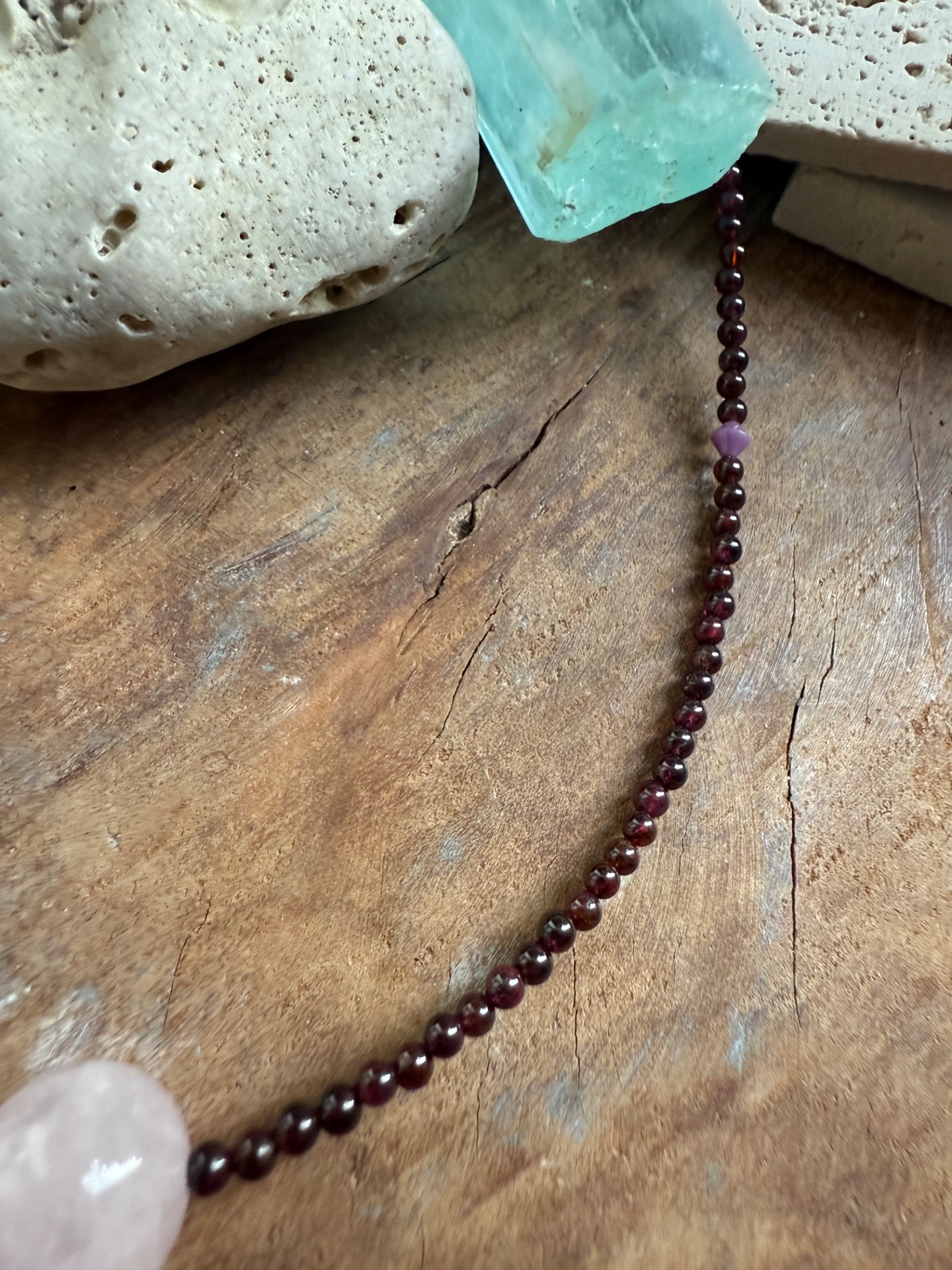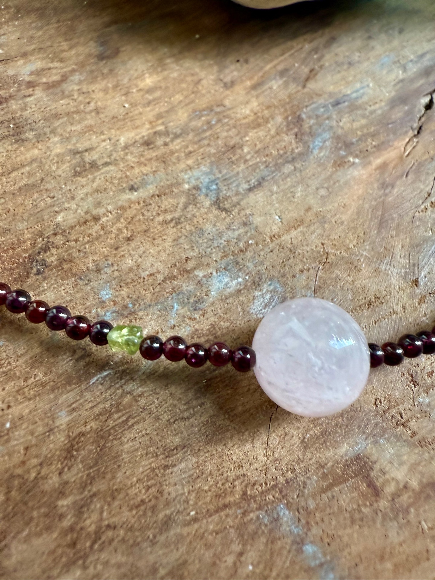 Tento nežný šperk z indického granátu (2 mm) s dominantným ruženínom (13 mm) je poctou planéte Venuši – bohyni lásky, krásy a harmónie.