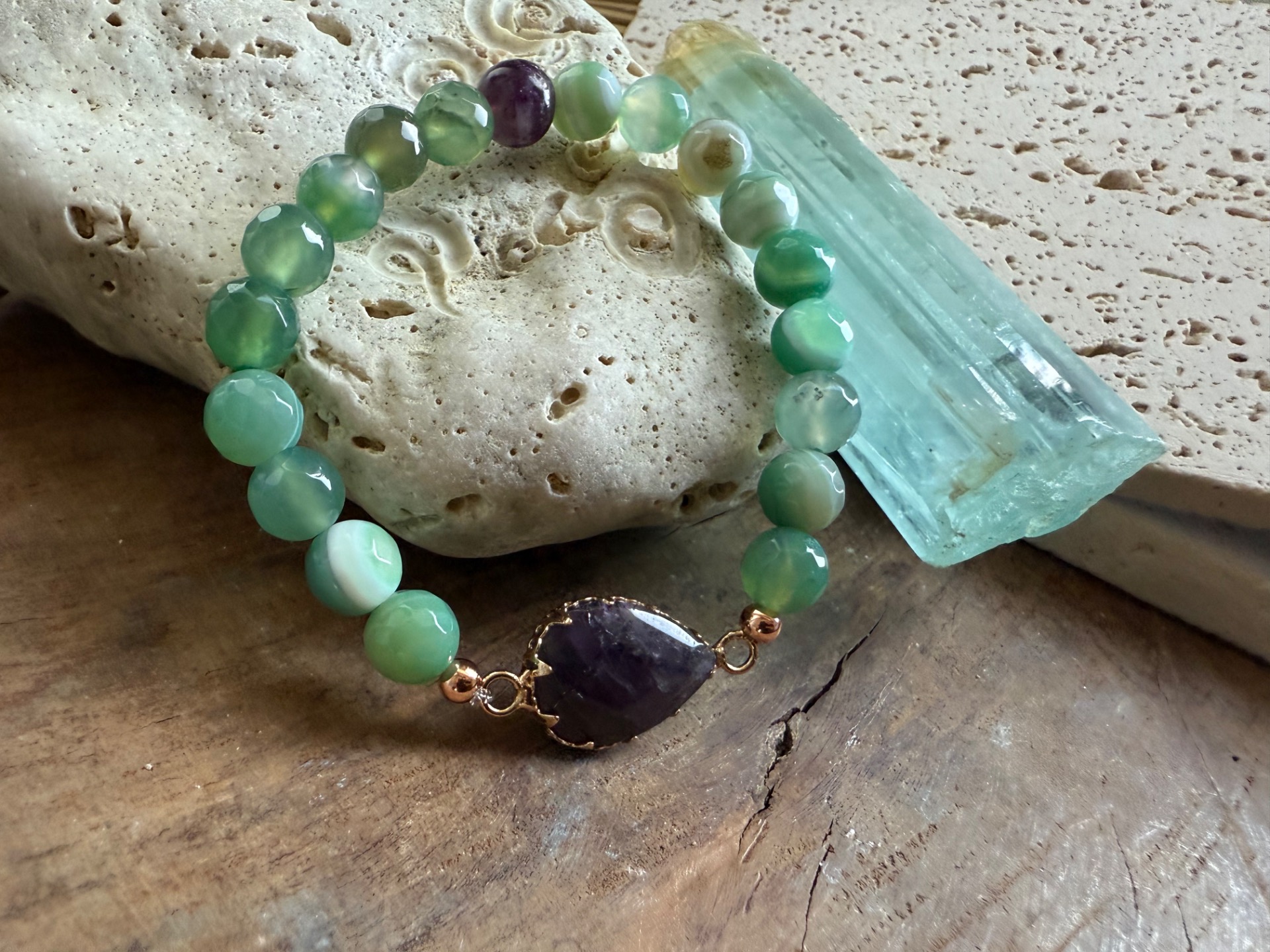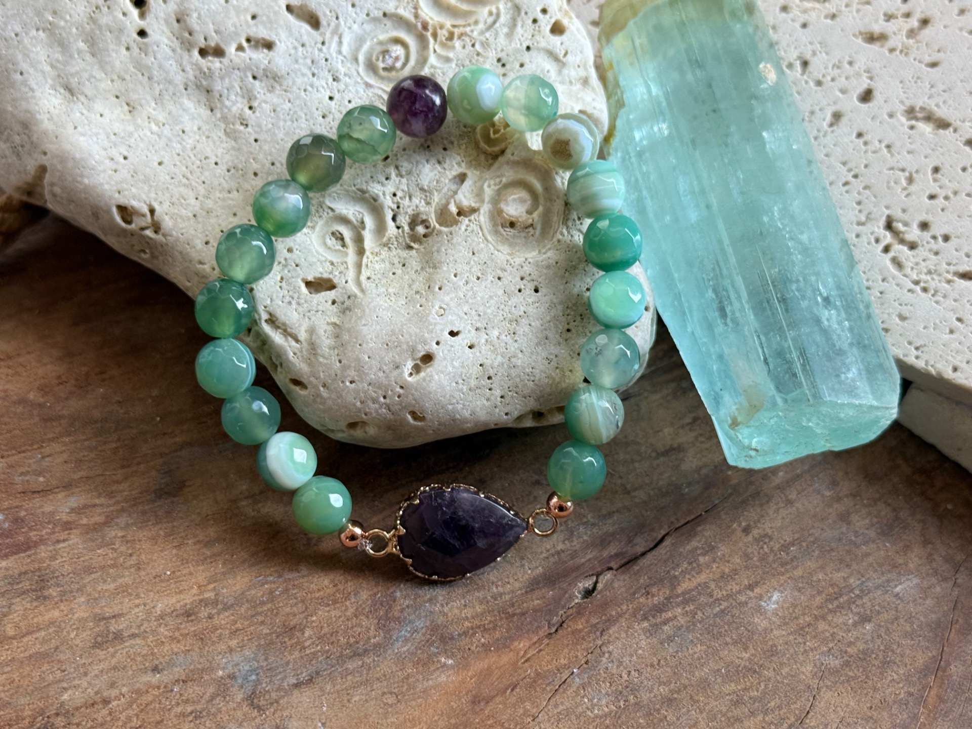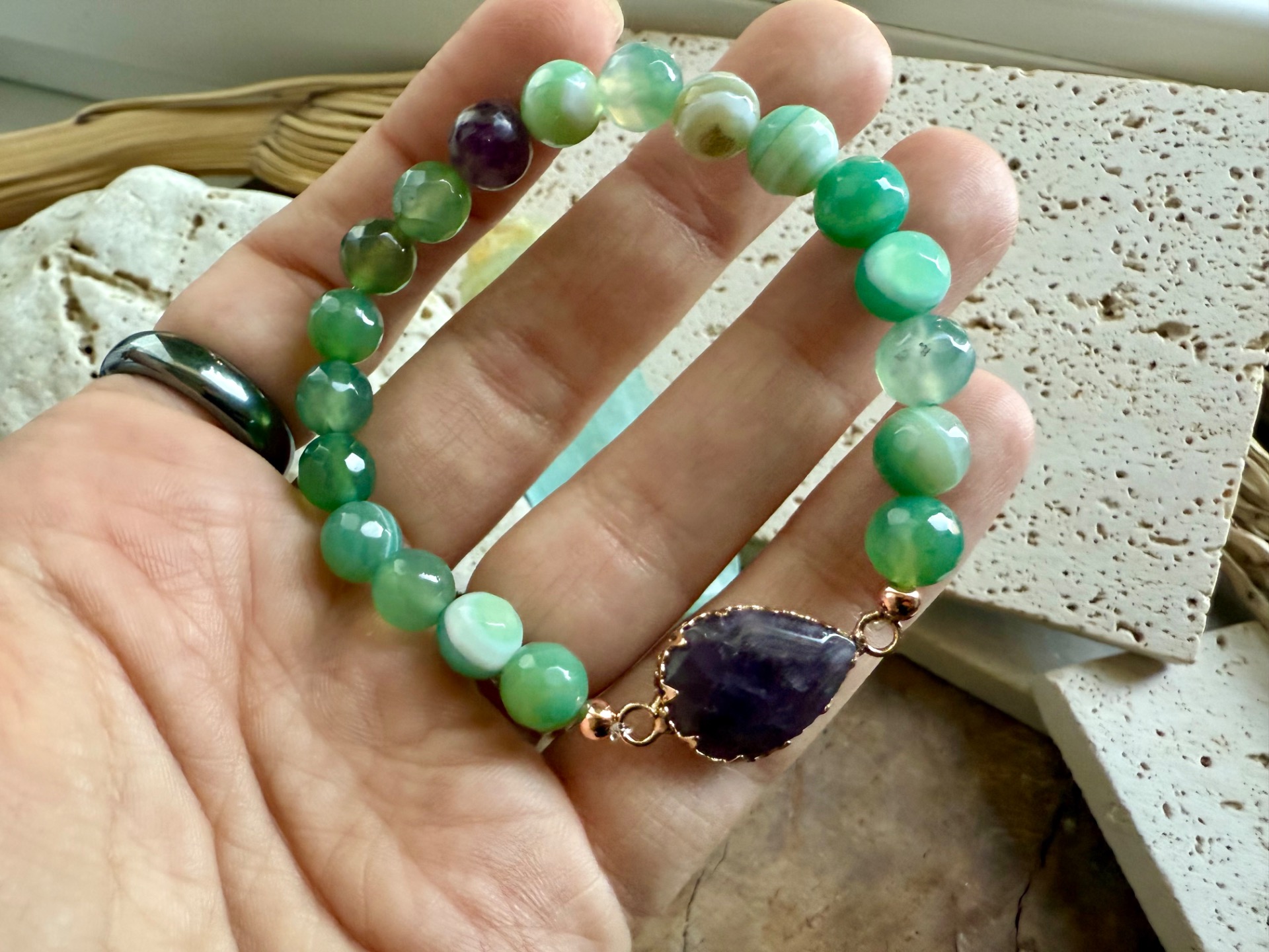 Náramok z dvojkombinácie minerálov ametyst placka doplnený achátom zeleným 8mm.