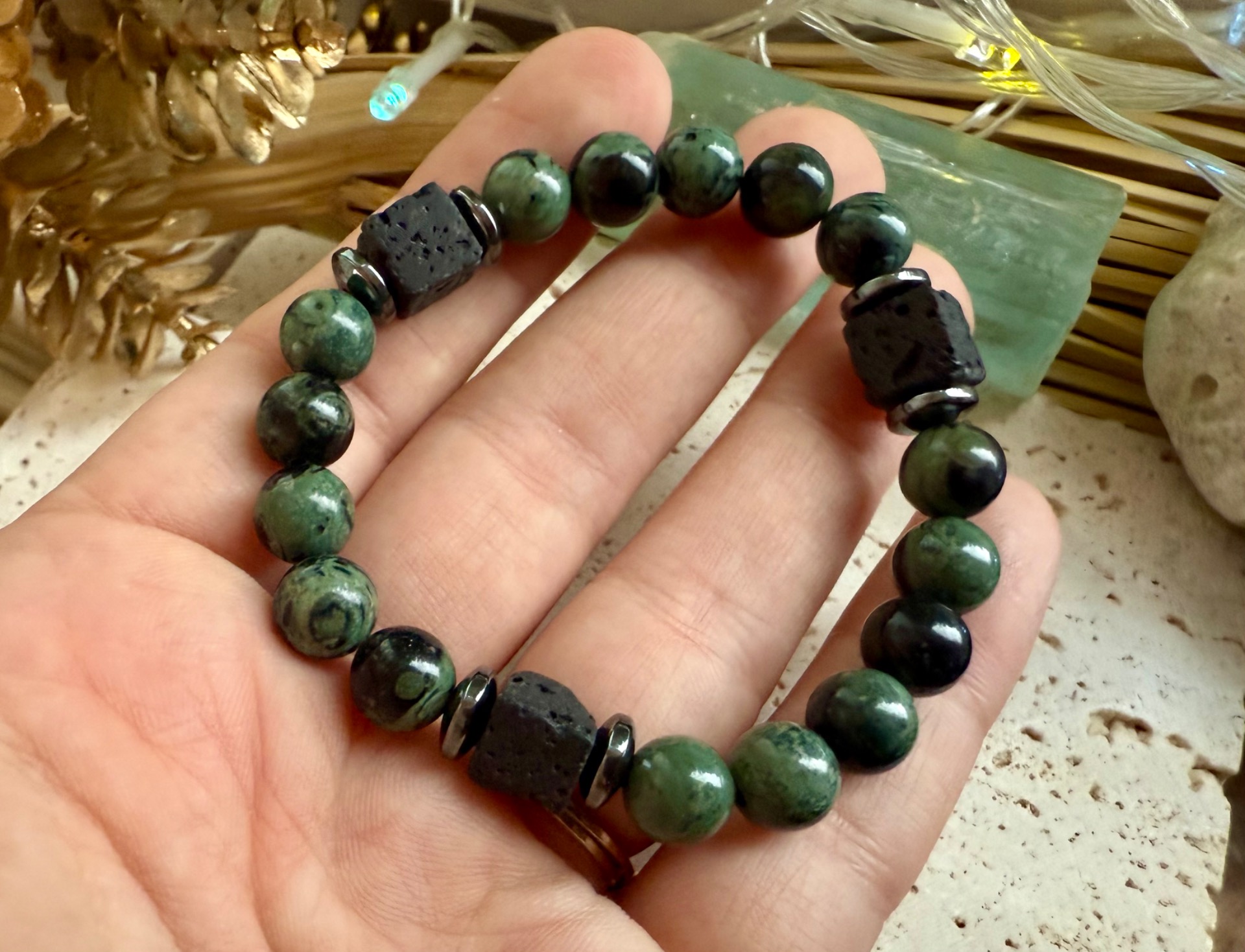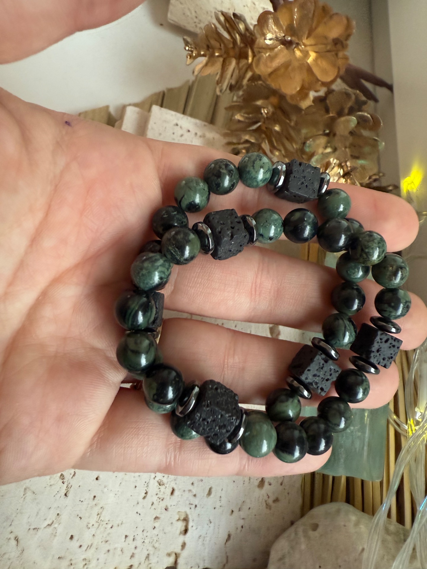 Náramok s hlbokou, liečivou energiou prírody. Ryolit – kameň premeny a vnútorného liečenia – sa spája s lávovým kameňom, ktorý nesie silu ohňa a zeme. Táto kombinácia podporuje uzemnenie, regeneráciu a návrat k vlastnému stredu. Ideálny pre muža, ktorý cíti potrebu spomaliť, ukotviť sa a načerpať silu priamo z prírody.
