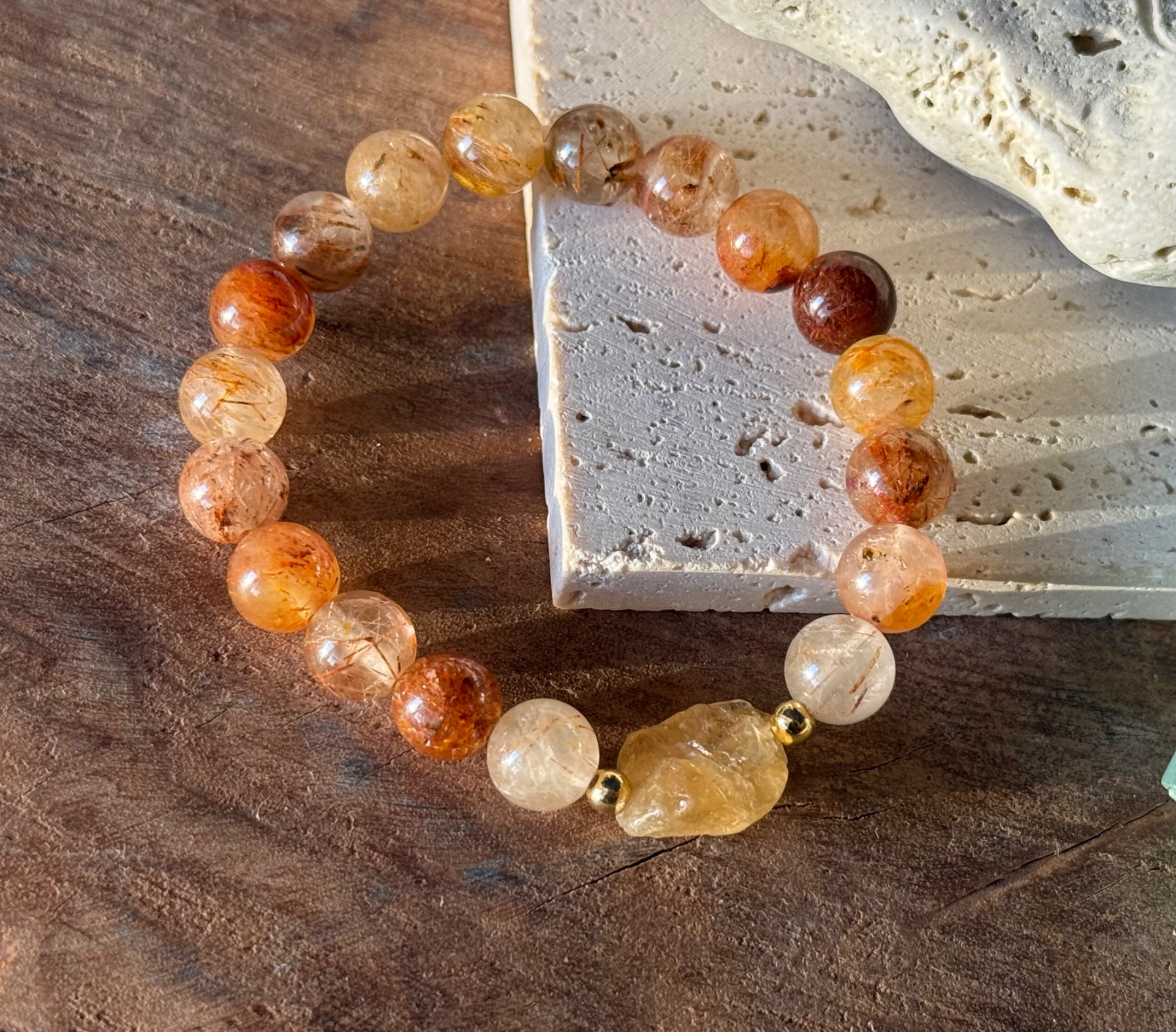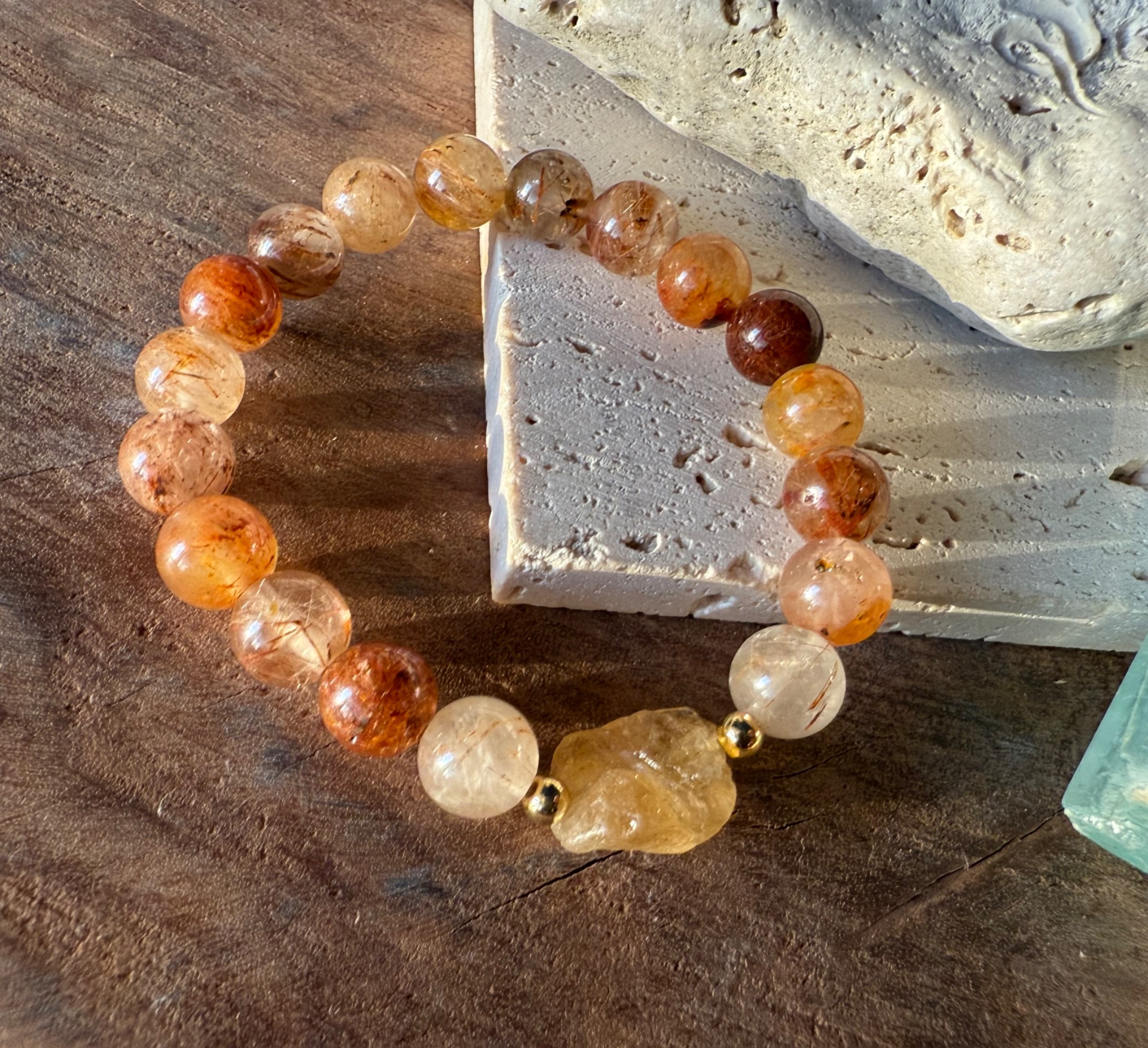 Surový citrín v strede náramku je symbolom životnej sily, radosti a hojnosti. Je považovaný za kameň slnka, ktorý rozjasňuje myseľ, dodáva energiu a podporuje sebadôveru. V surovej forme si zachováva svoju prirodzenú, silnú vibráciu a pôsobí ako energetický zosilňovač celého náramku.